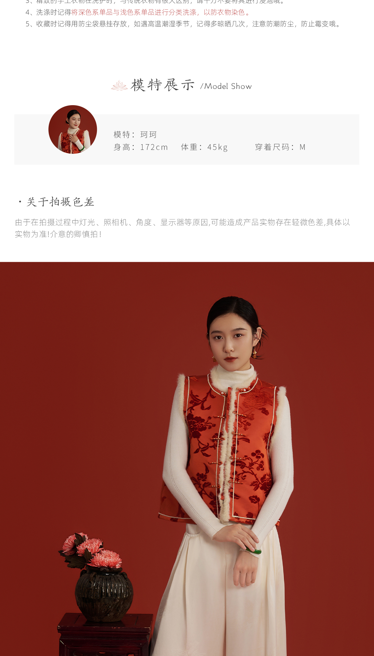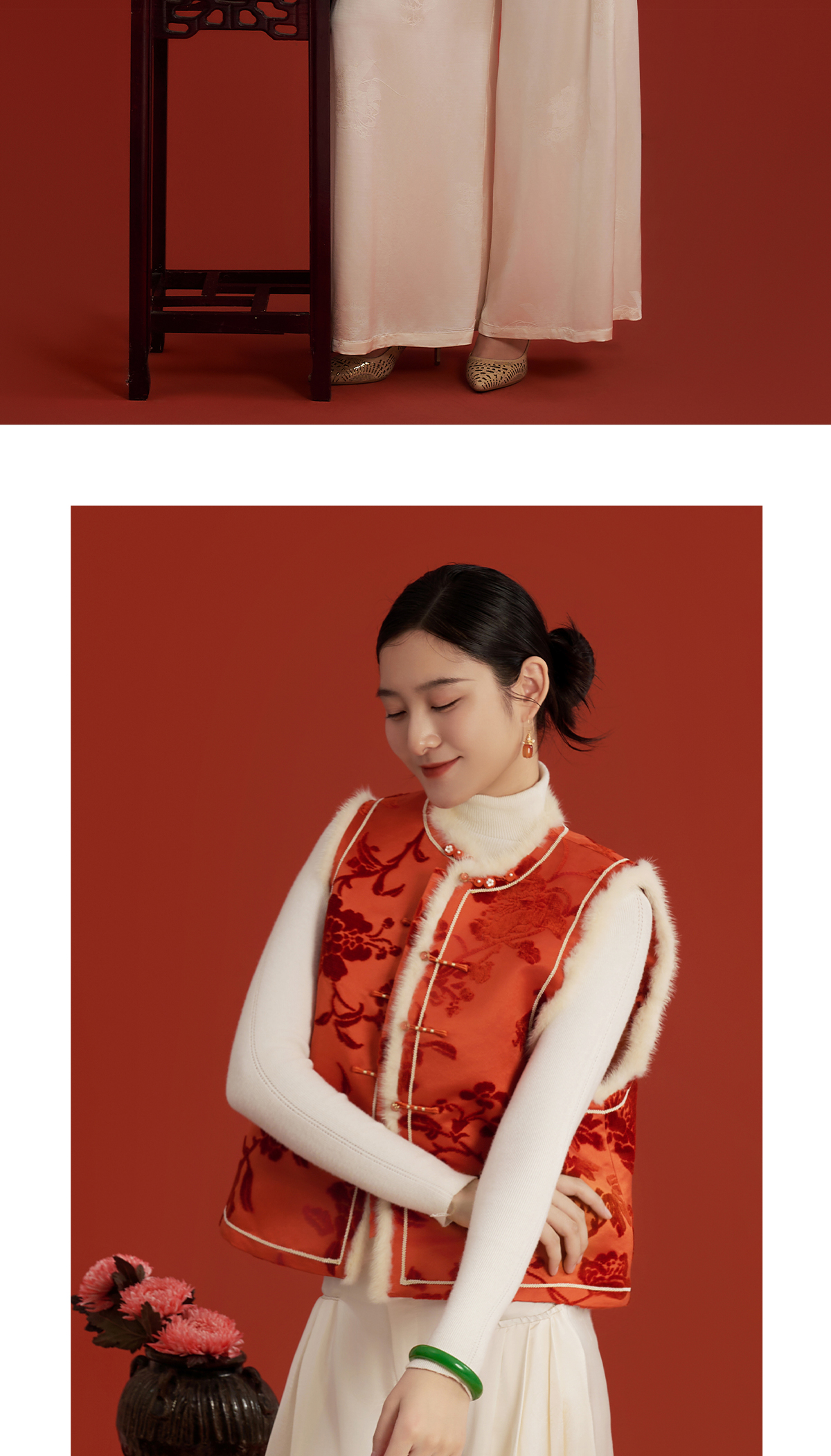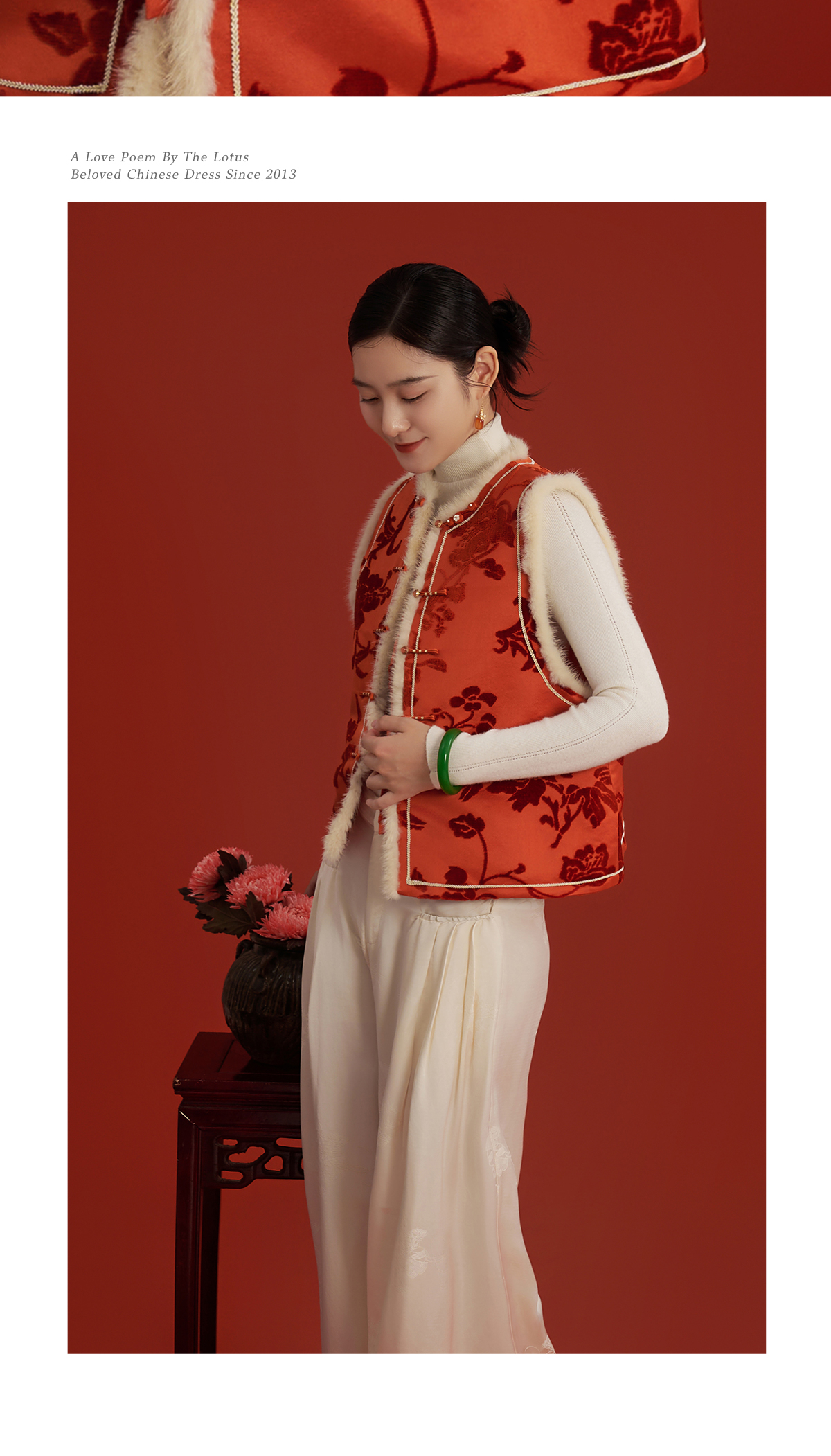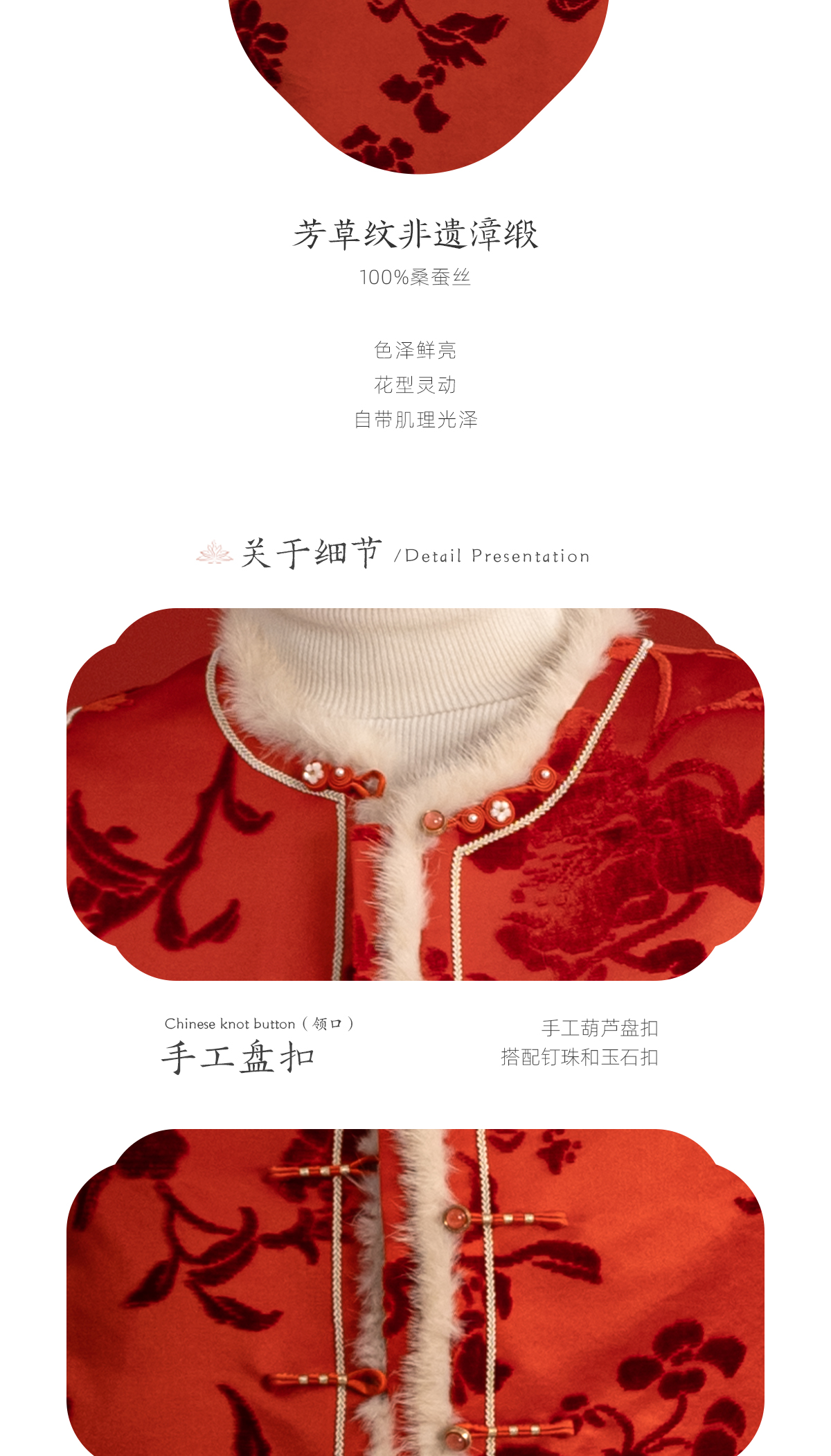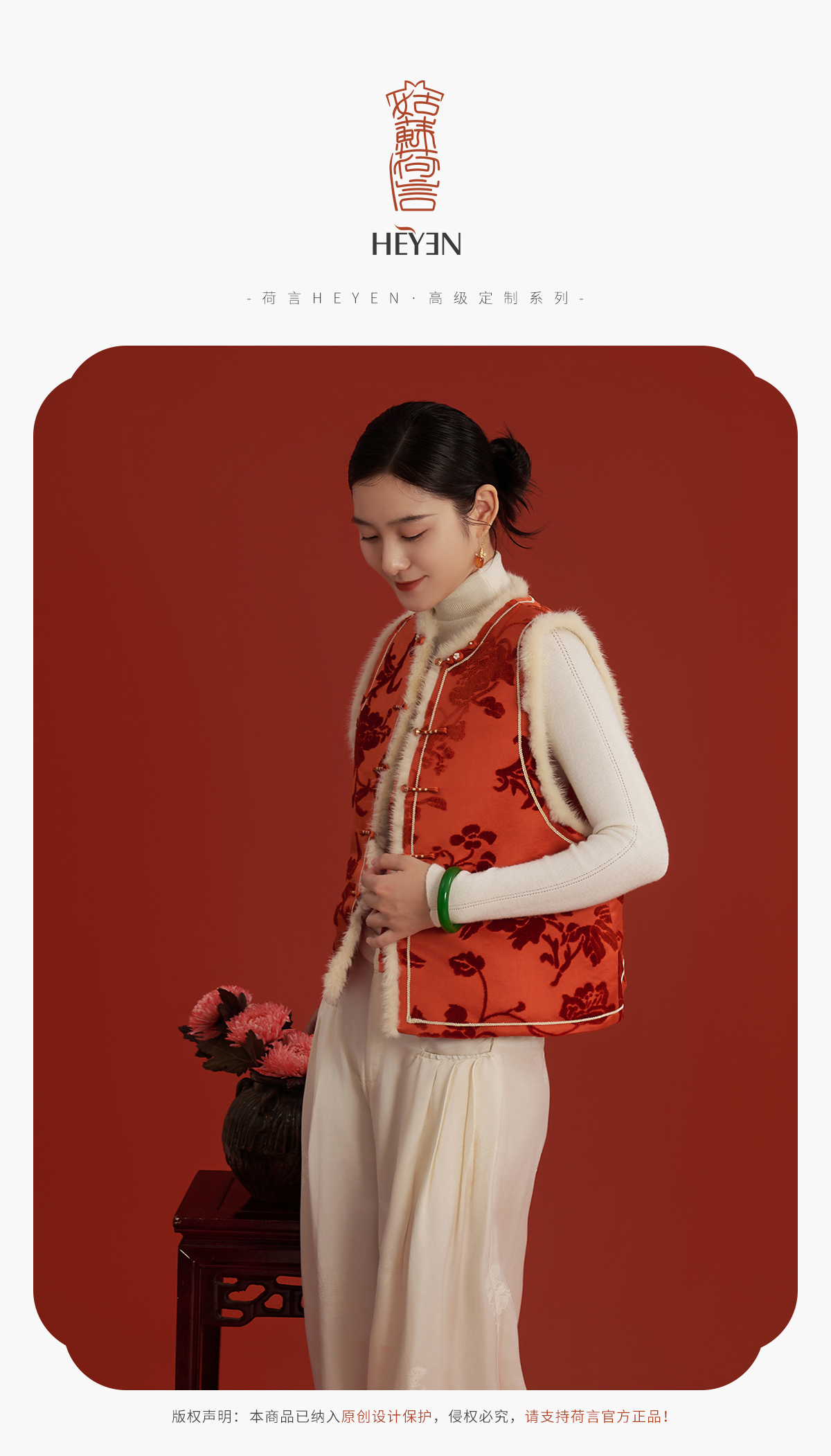 荷言HEYEN 新叶绒橙 真丝繁花提花漳缎马甲水貂毛装饰手工钉珠葫芦扣