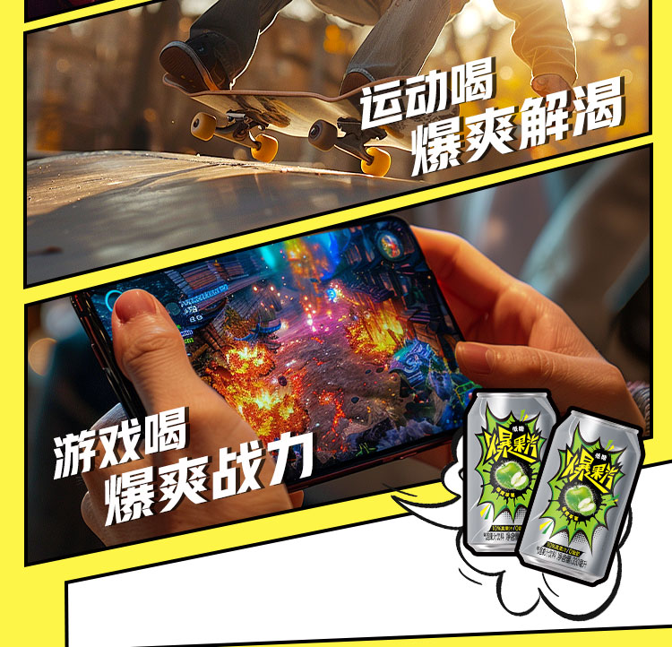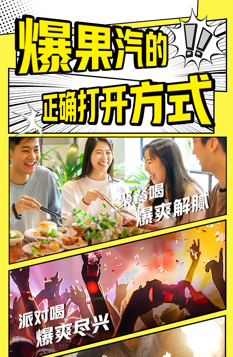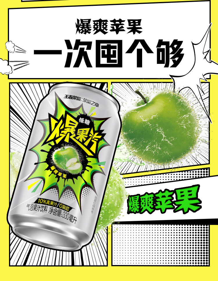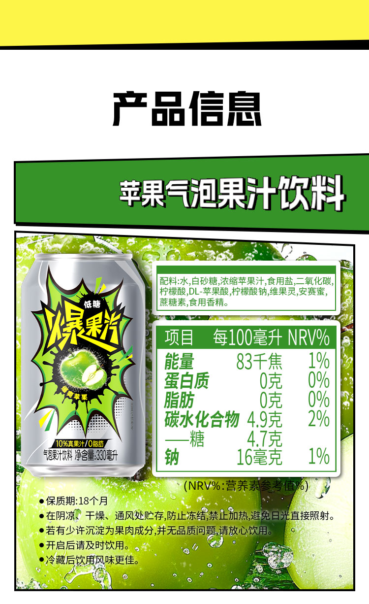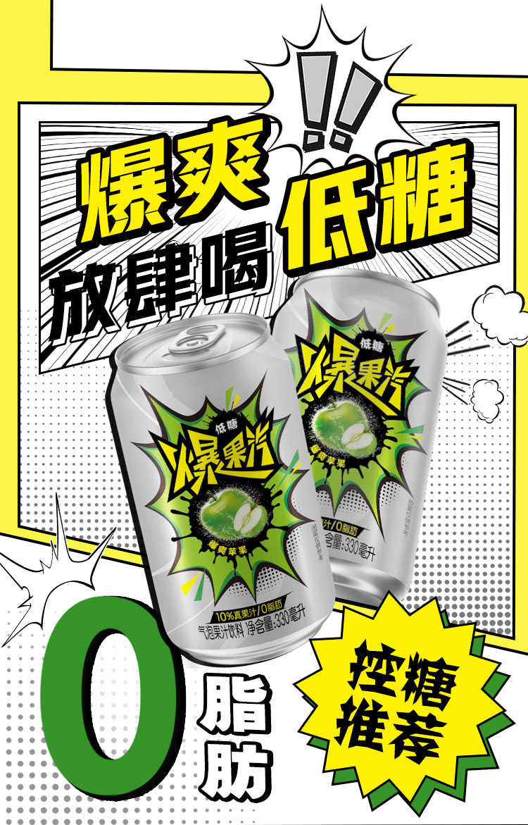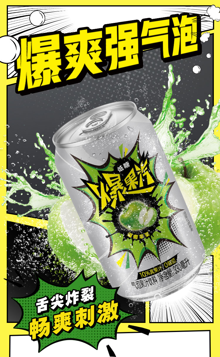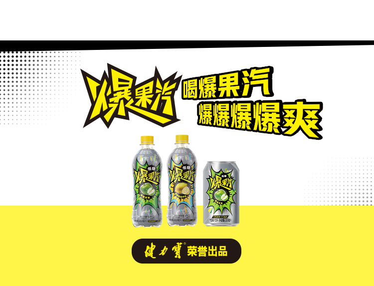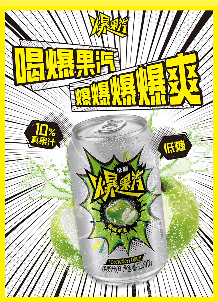 健力宝元气爆果汽苹果330ml*24罐果汁气泡水