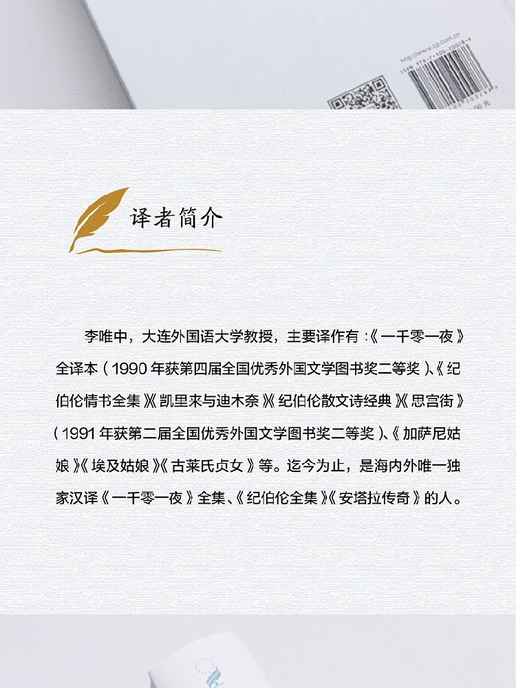 李唯中,大连外国语大学教授,主要译作有:《一千零一夜》全译本(1990年获第四届全国优秀外国文学图书奖二等奖)、《纪伯伦情书全集》《凯里来与迪木奈》《纪伯伦散文诗经典》《思宫街》(1991年获第二届全国优秀外国文学图书奖二等奖)、《加萨尼姑娘》《埃及姑娘》《古莱氏贞女》等。迄今为止,是海内外汉译《一千零一夜》全集、《纪伯伦全集》《安塔拉传奇》的人。