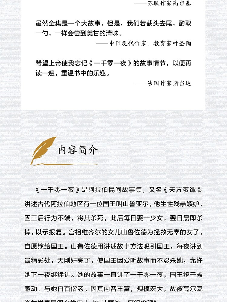《一千零一夜》是阿拉伯民间故事集,又名《天方夜谭》。讲述古代阿拉伯地区有一位国王叫山鲁亚尔,他生性残暴嫉妒,因王后行为不端,将其杀死,此后每日娶一少女,翌日晨即杀掉,以示报复。宫相维齐尔的女儿山鲁佐德为拯救无辜的女子,自愿嫁给国王。山鲁佐德用讲述故事方法吸引国王,每夜讲到最精彩处,天刚好亮了,使国王因爱听故事而不忍杀她,允许她下一夜继续讲。她的故事一直讲了一千零一夜,国王终于被感动,与她白首偕老。因其内容丰富,规模宏大,故被高尔基誉为世界民间文学史上“*壮丽的一座纪念碑”。