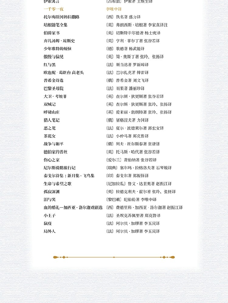 第一辑30种:《伊索寓言》《一千零一夜》《托尔梅斯河的拉撒路》《培根随笔全集》《伯爵家书》《弃儿汤姆•琼斯史》《少年维特的烦恼》《傲慢与偏见》《红与黑》《欧也妮•葛朗台 高老头》《普希金诗选》《巴黎圣母院》《大卫•考坡菲》《双城记》《呼啸山庄》《猎人笔记》《恶之花》《茶花女》《战争与和平》《德伯家的苔丝》《伤心之家》《尼尔斯骑鹅旅行记》《泰戈尔诗集:新月集•飞鸟集》《生命与希望之歌》《孤寂深渊》《泪与笑》《血的婚礼:加西亚•洛尔迦戏剧选》《小王子》《鼠疫》《局外人》。