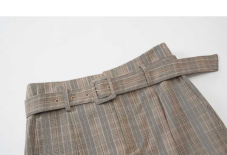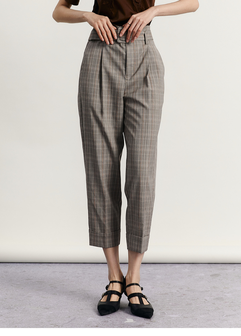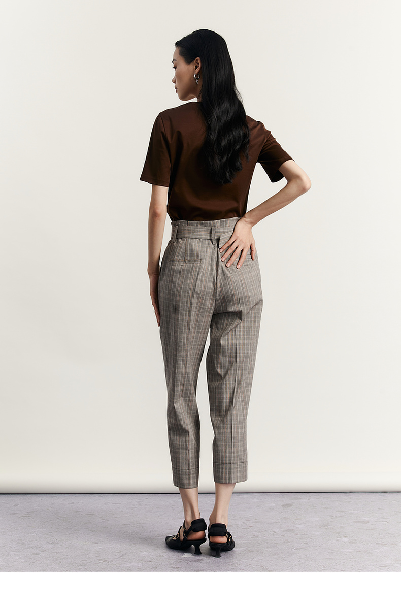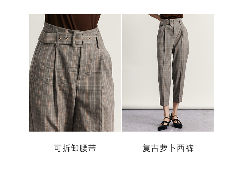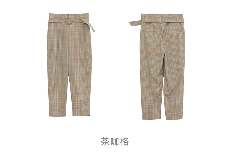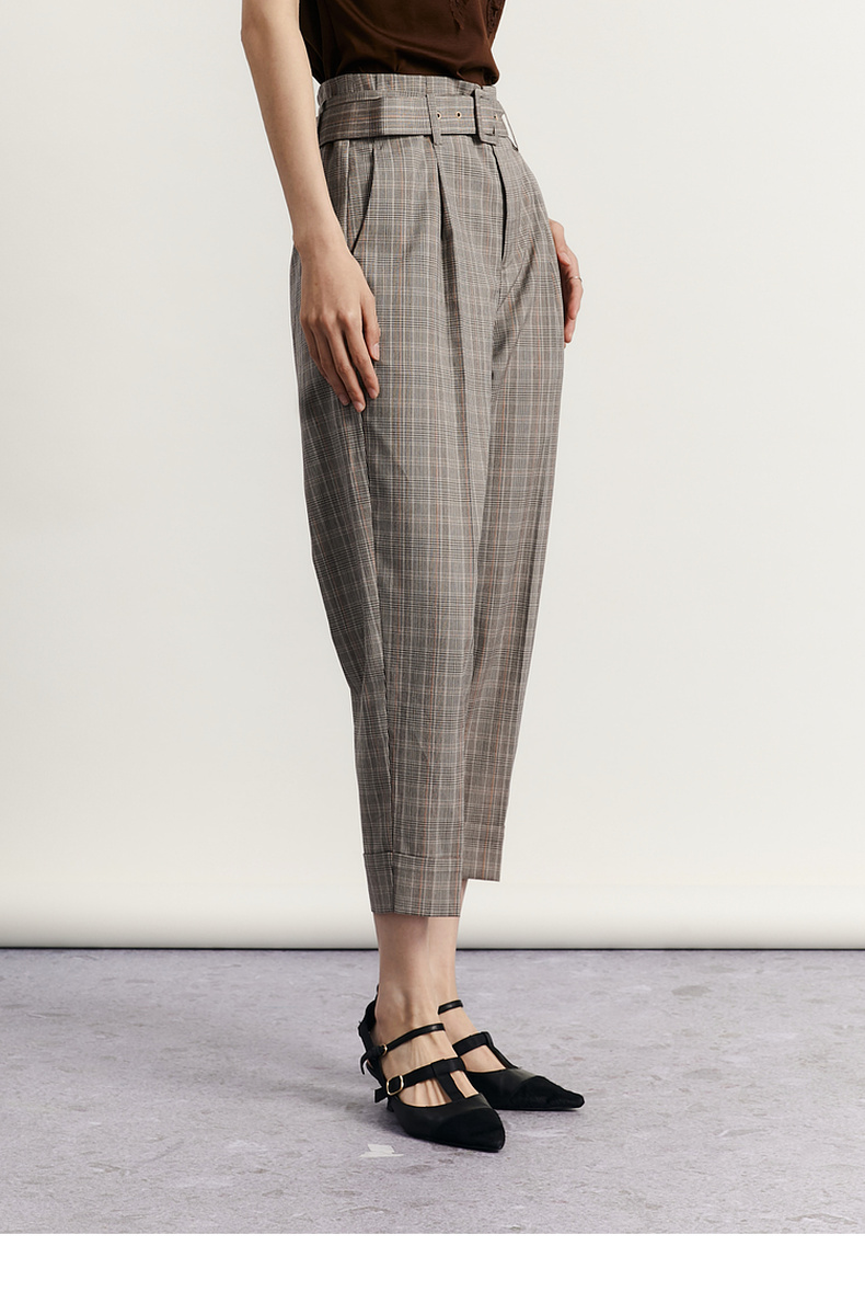 谜底格纹休闲裤女2023秋新款复古高腰宽松九分裤配腰带233MK0993