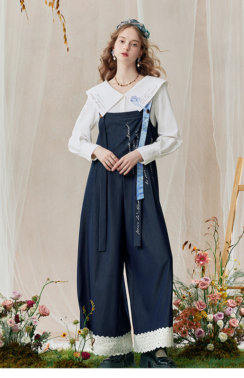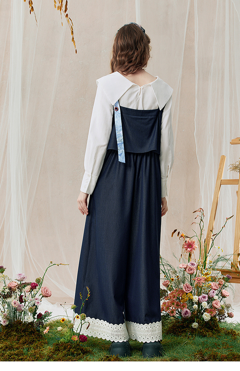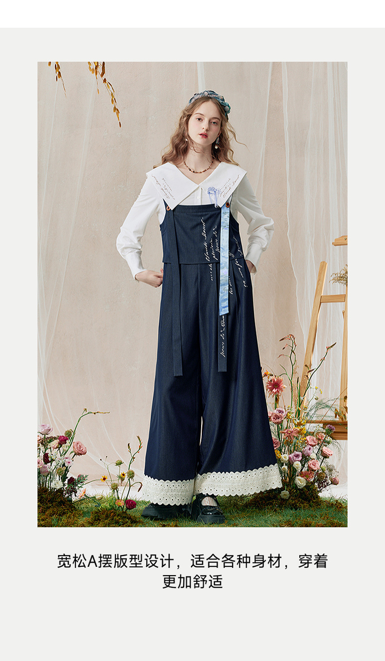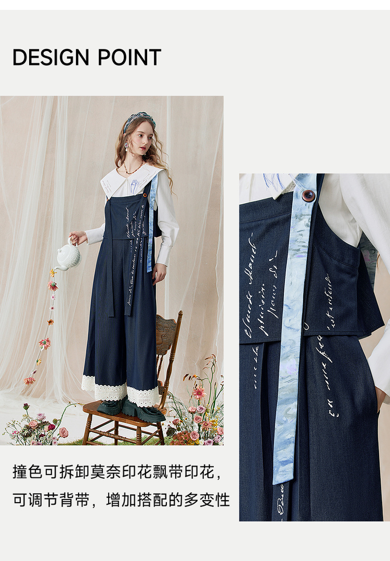 两三事 雪恋诗 2025秋季新款蕾丝拼接可拆织带印花连体裤女宽松