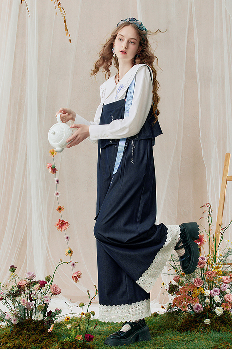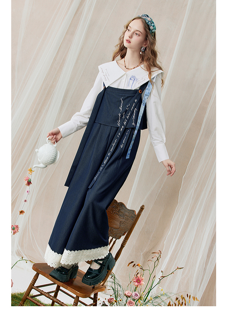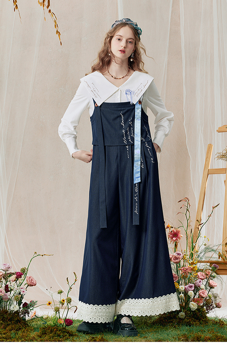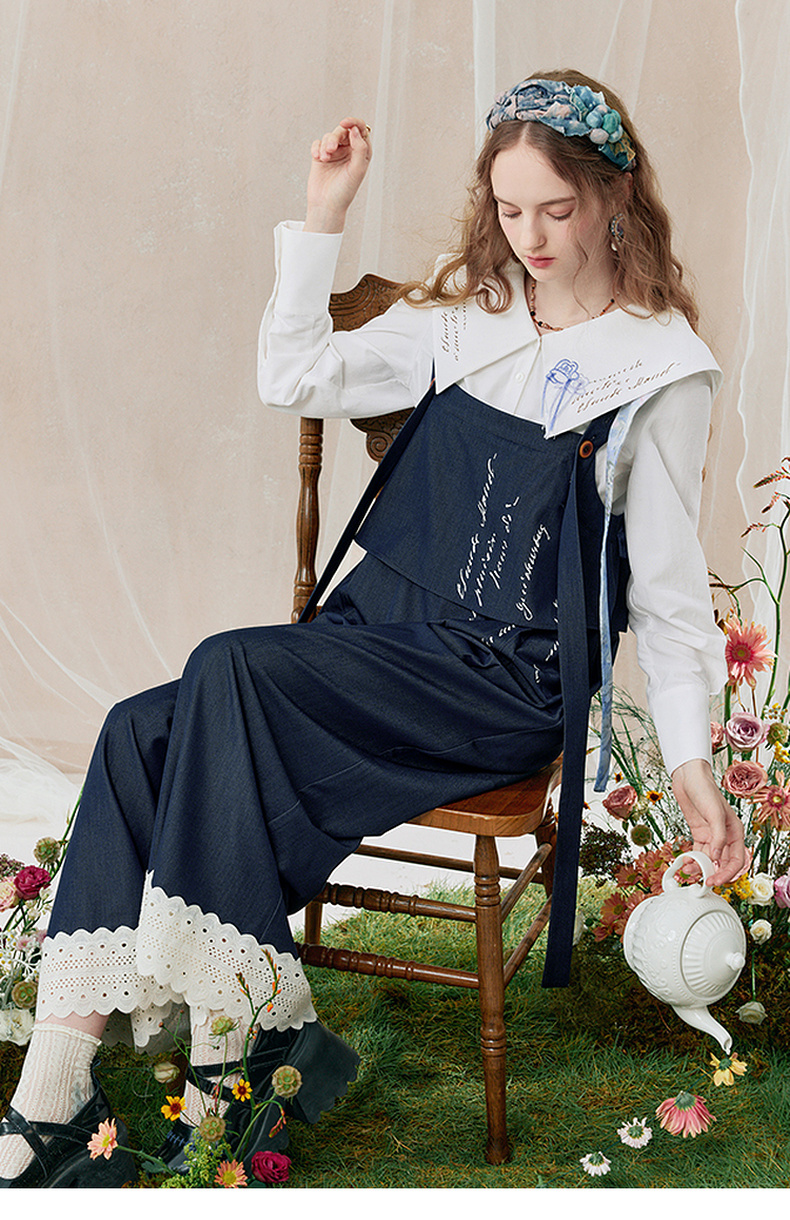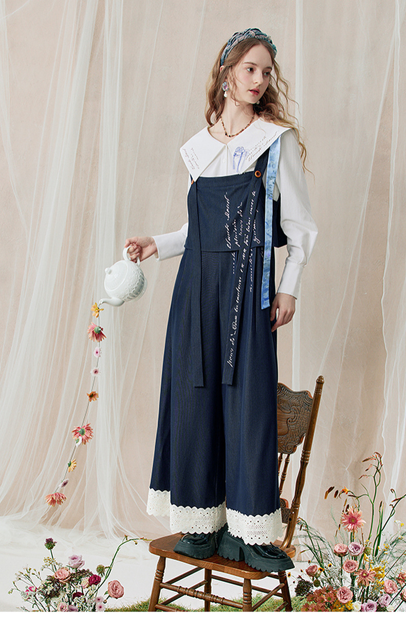 两三事 雪恋诗 2025秋季新款蕾丝拼接可拆织带印花连体裤女宽松