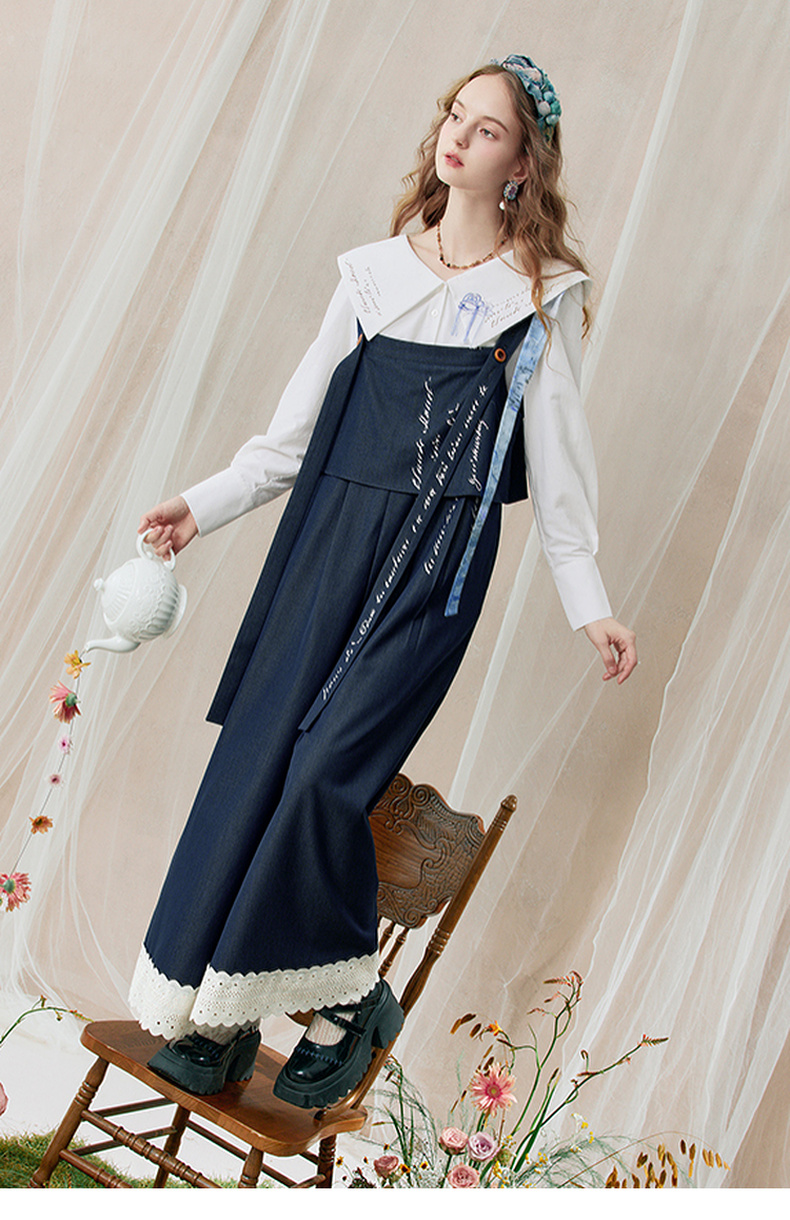 两三事一人相伴 春夏新款时尚单边背带裙系扣高腰牛仔半身裙S23CKB050