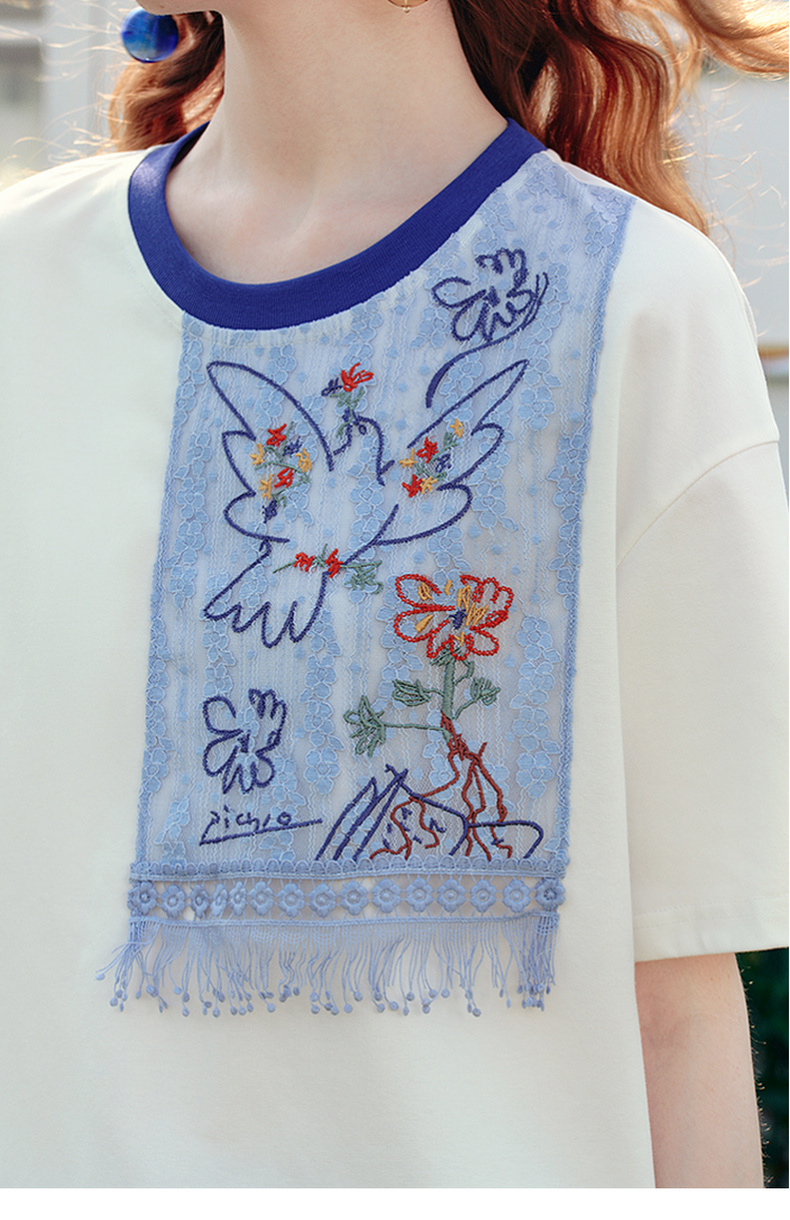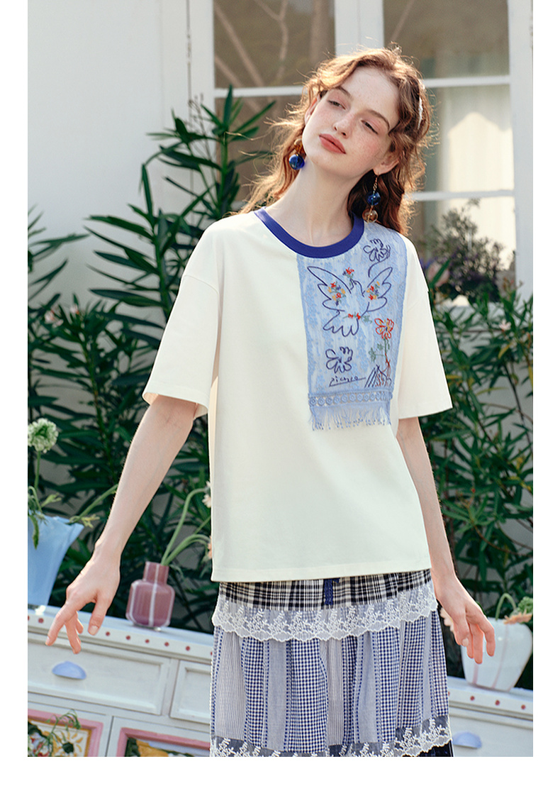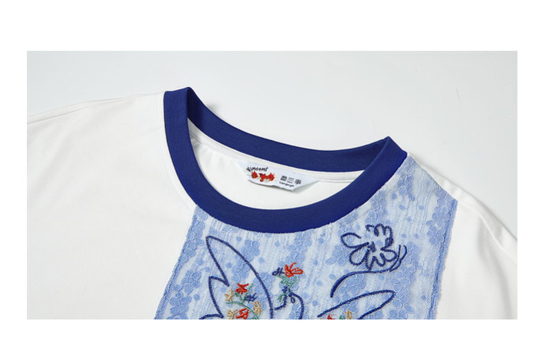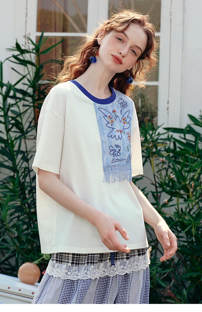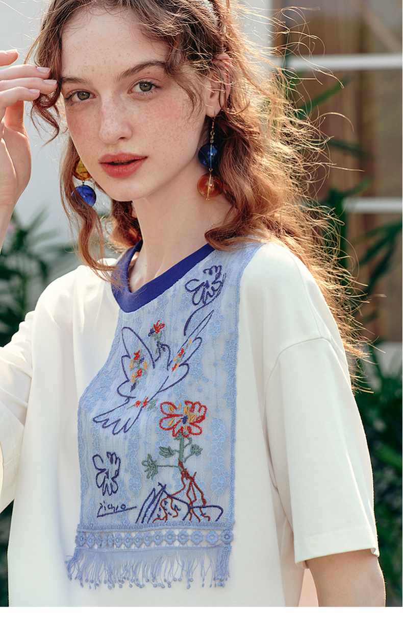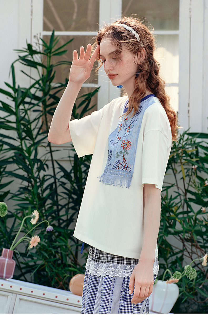 两三事 羽化飞鸟 2025夏季新款复古蕾丝拼接刺绣短袖t恤女宽松