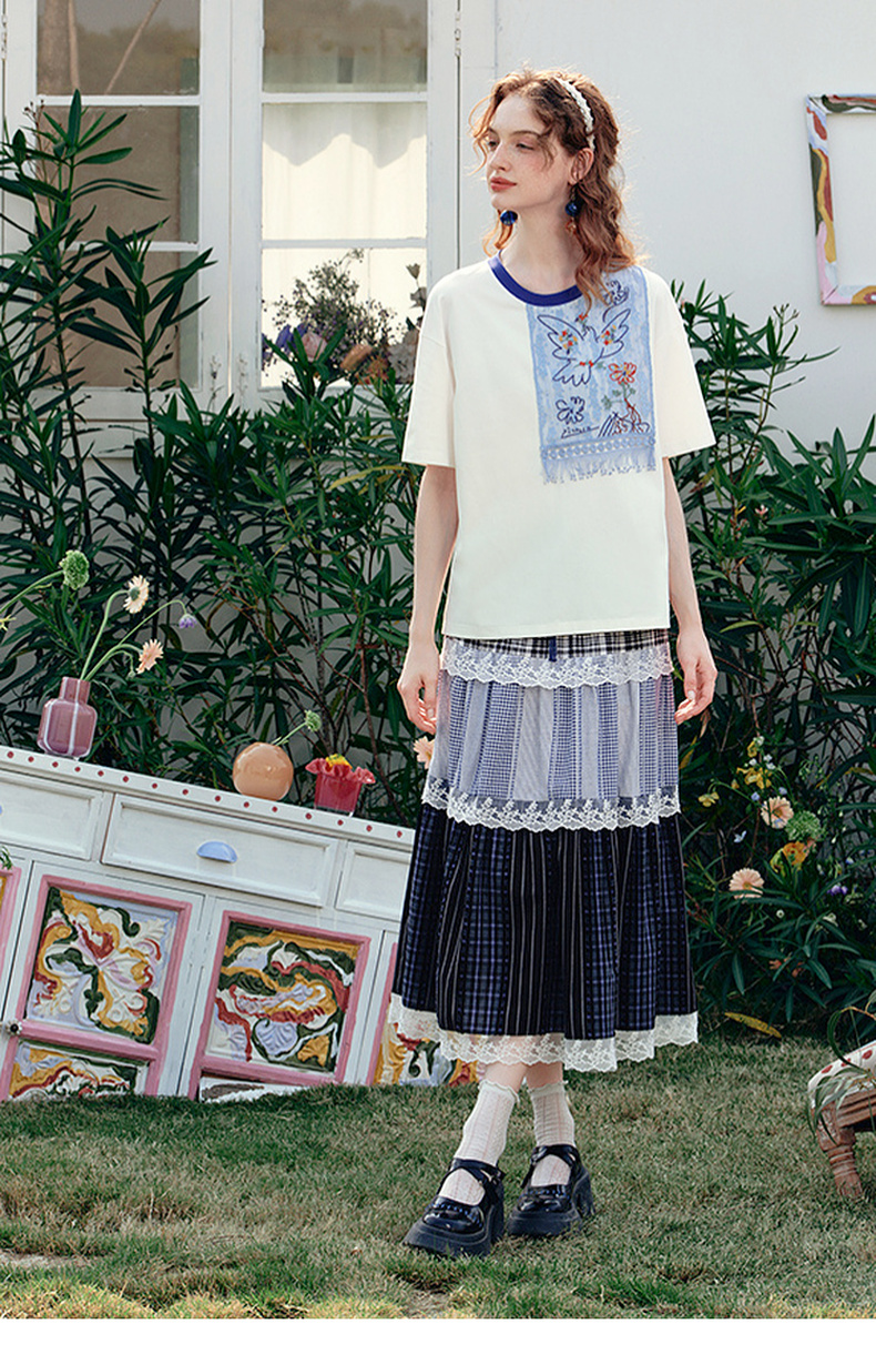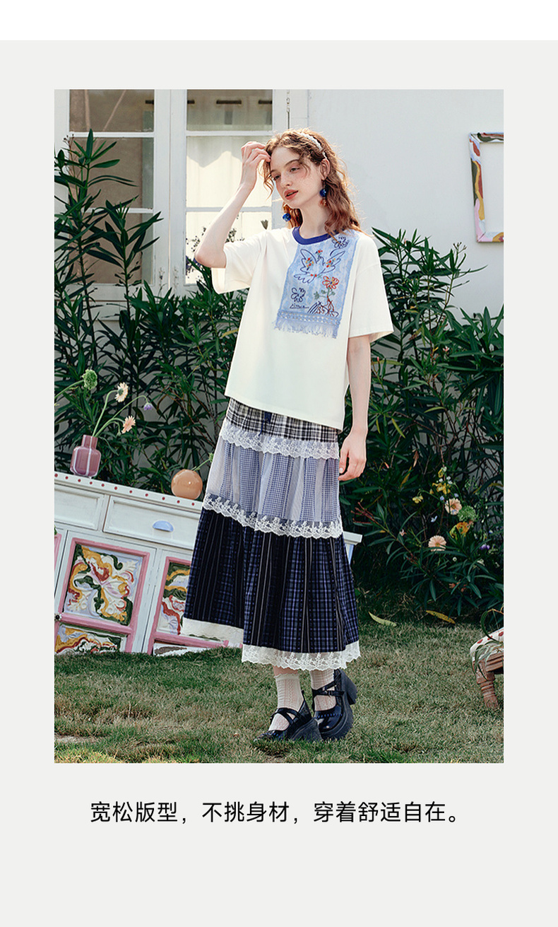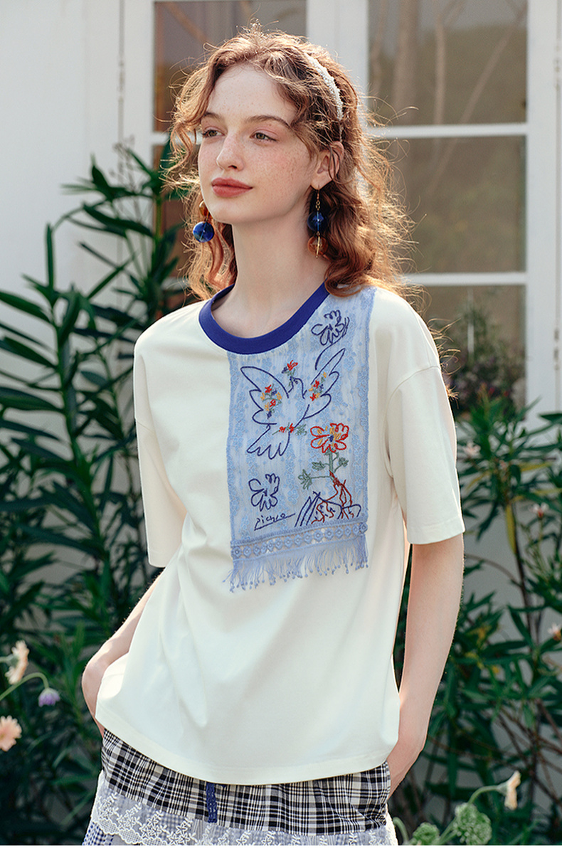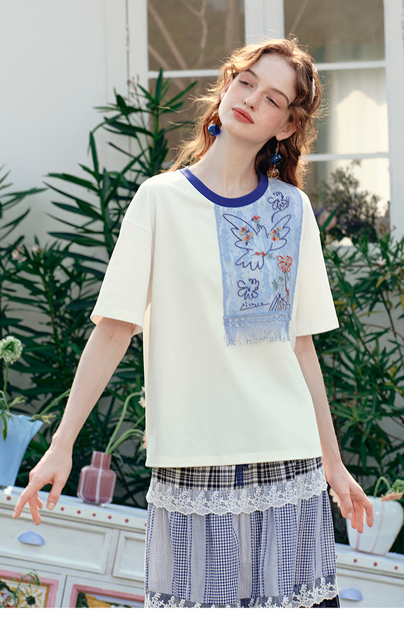 两三事 羽化飞鸟 2025夏季新款复古蕾丝拼接刺绣短袖t恤女宽松