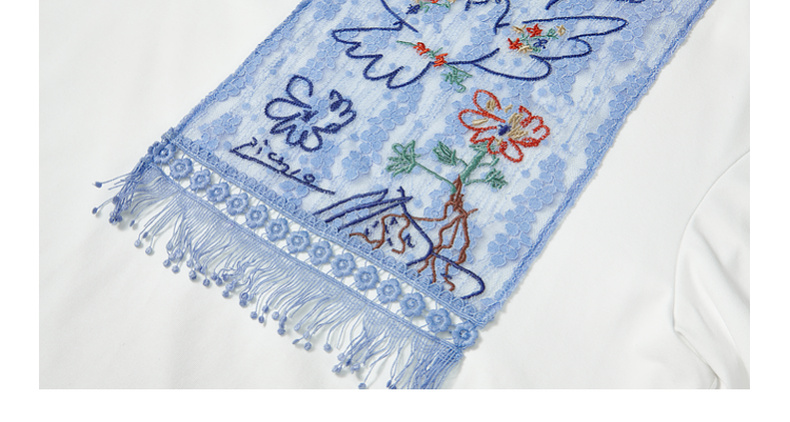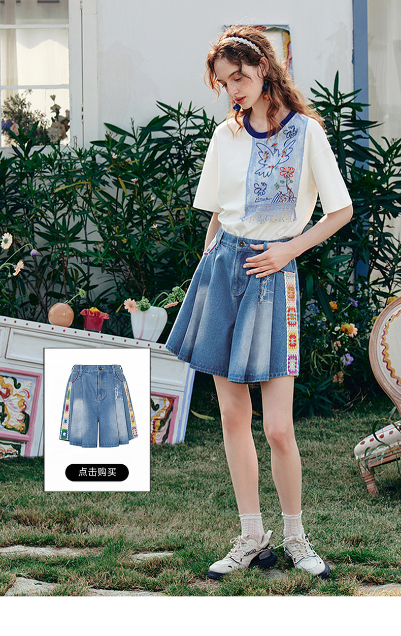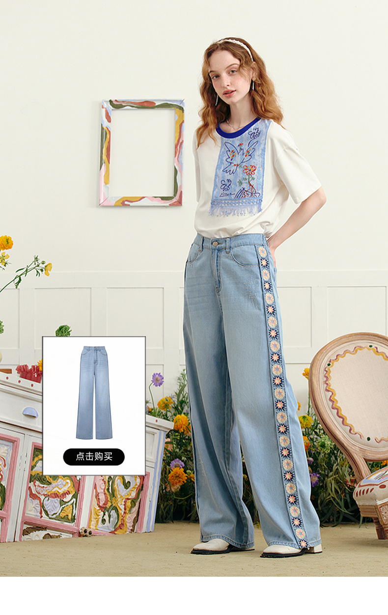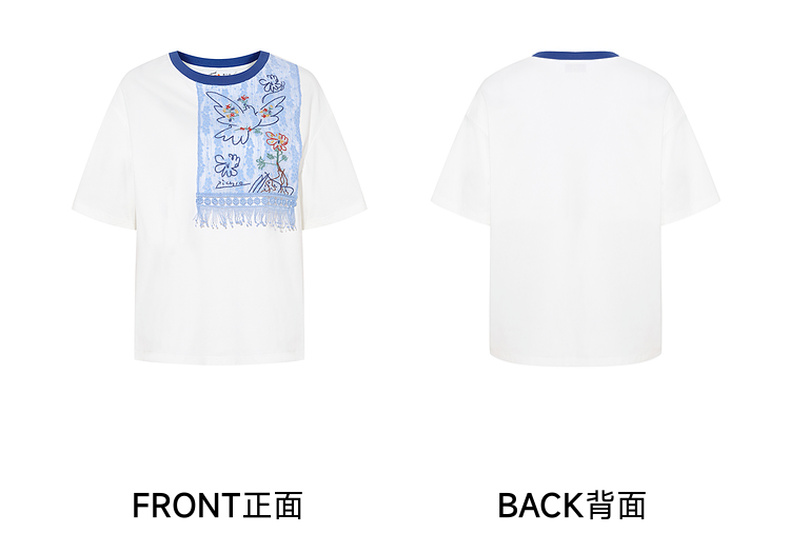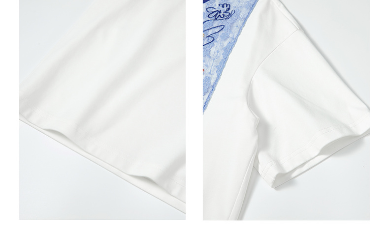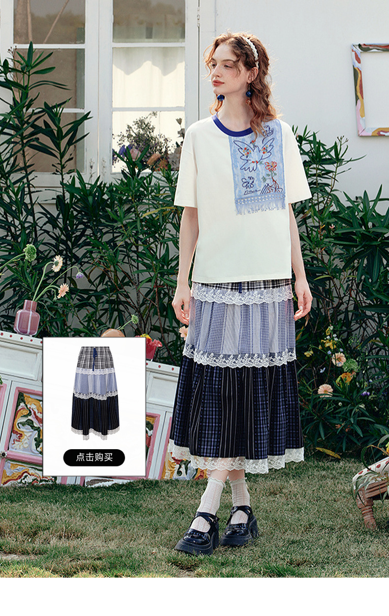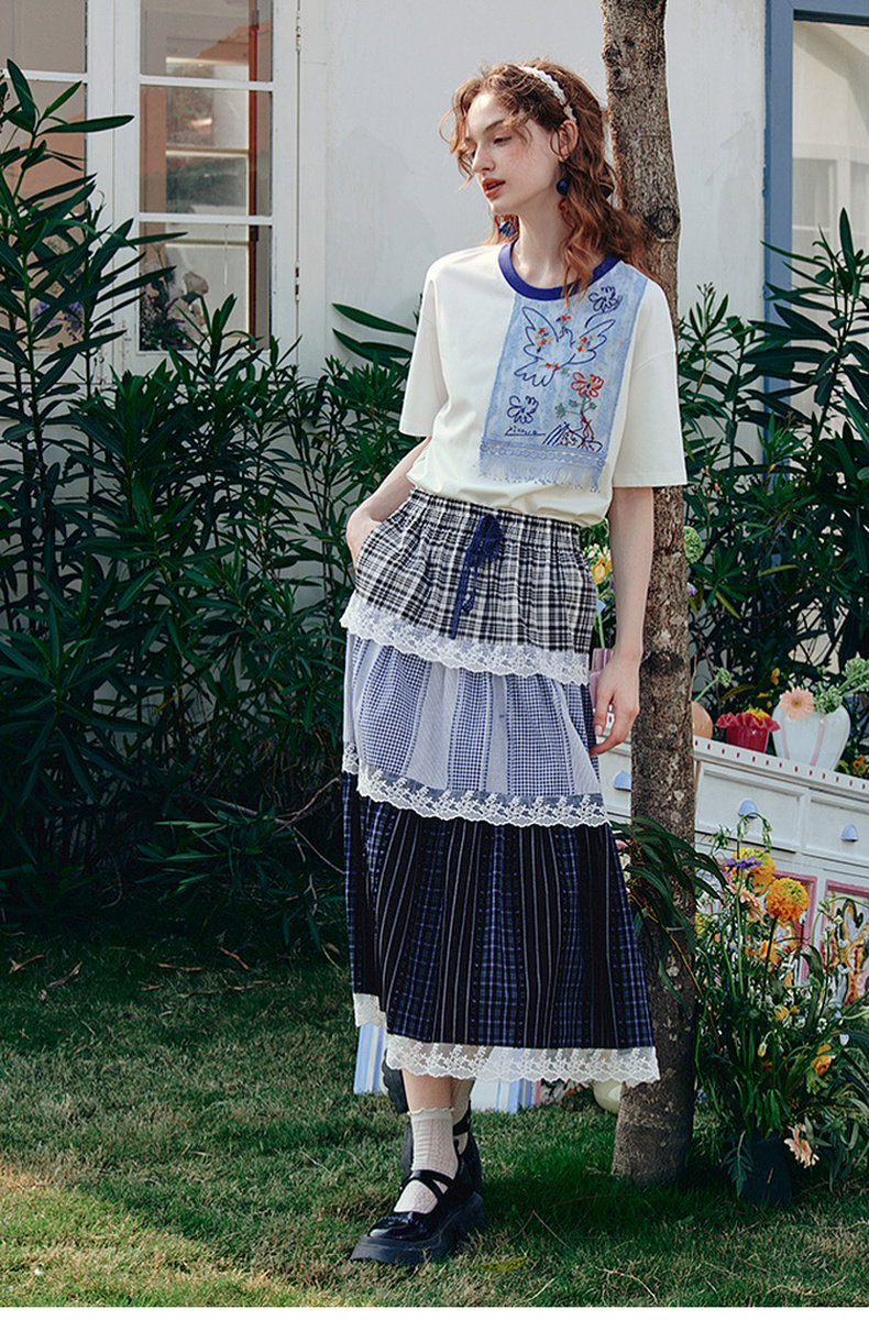 两三事 羽化飞鸟 2025夏季新款复古蕾丝拼接刺绣短袖t恤女宽松
