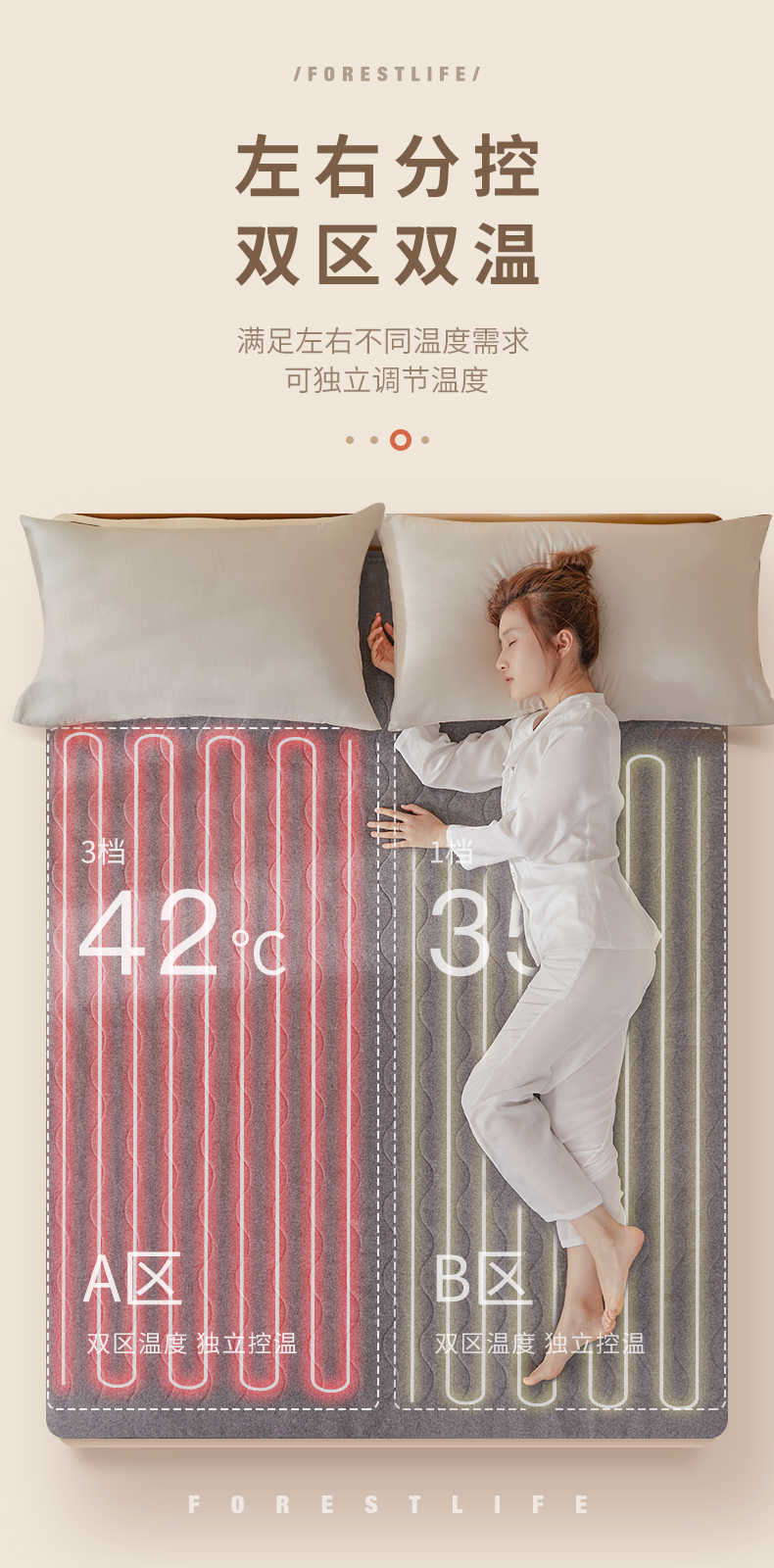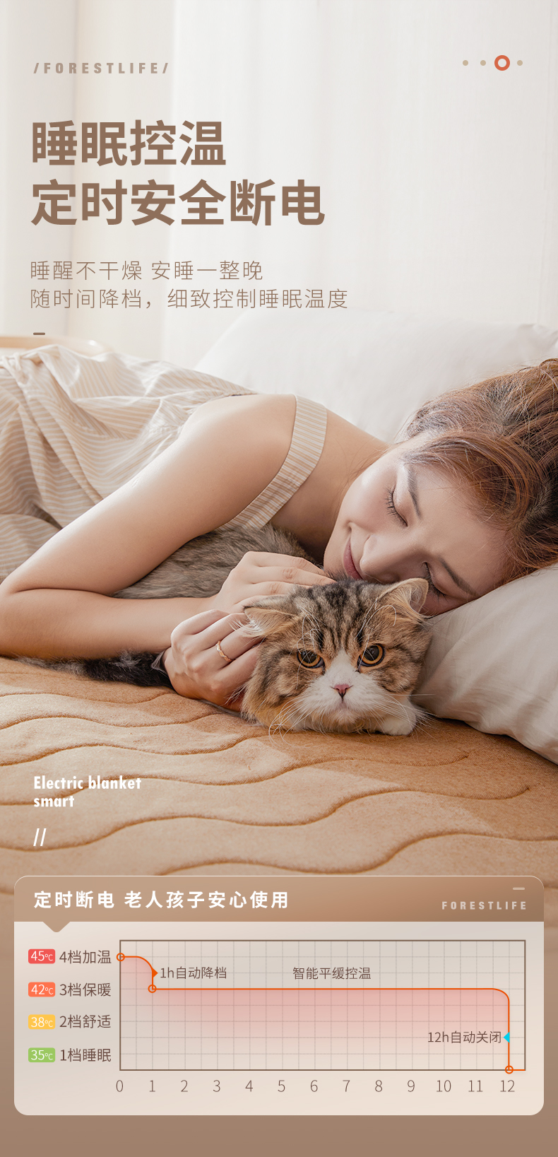 【暖冬好物丨forestlife麻面可水洗电热毯】面料干爽柔软,智能睡眠降档,睡醒不易上火,4层加厚毯面,告别传统电热毯发热线硌人,双螺旋发热线,三重安全保护毯面可水洗,柔软易叠,方便收纳