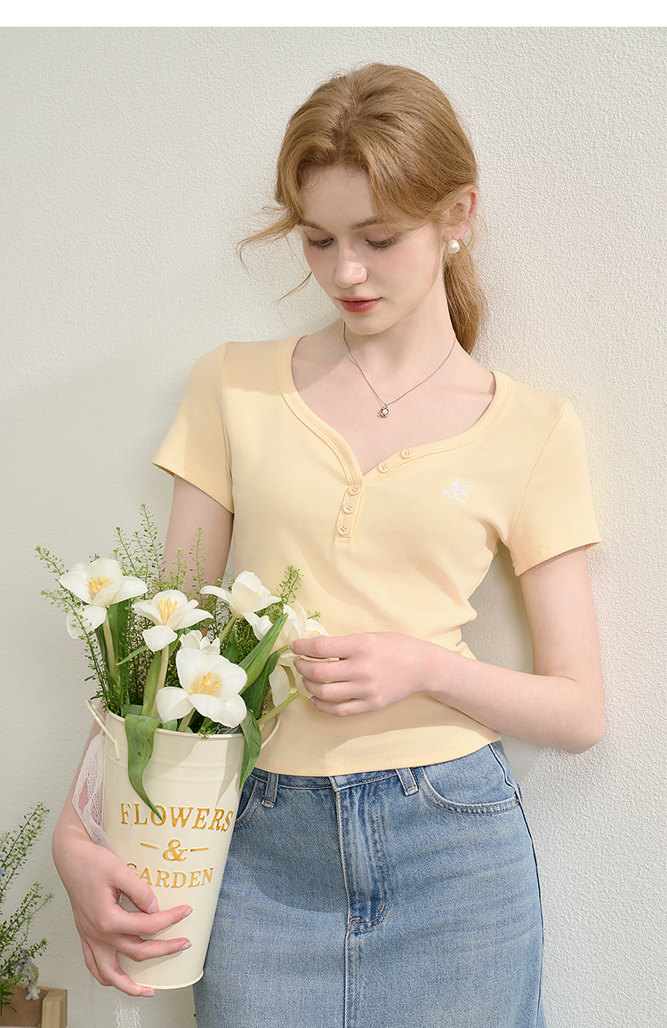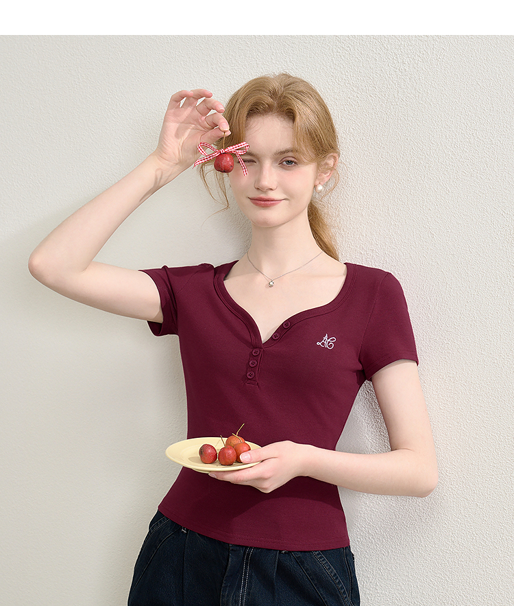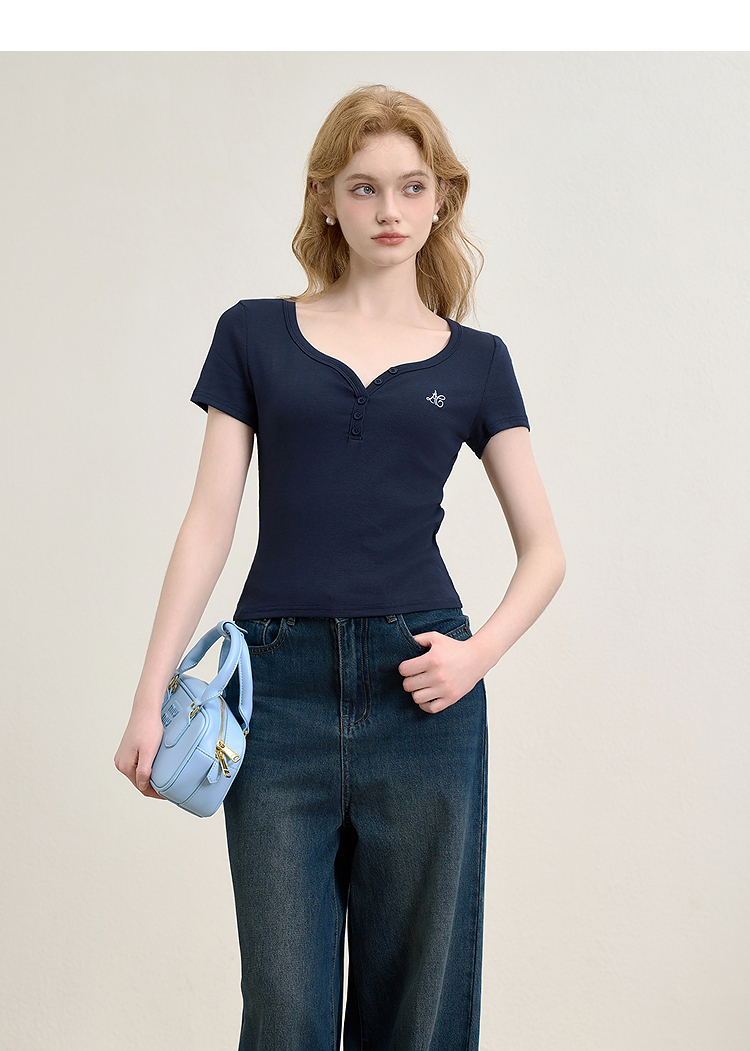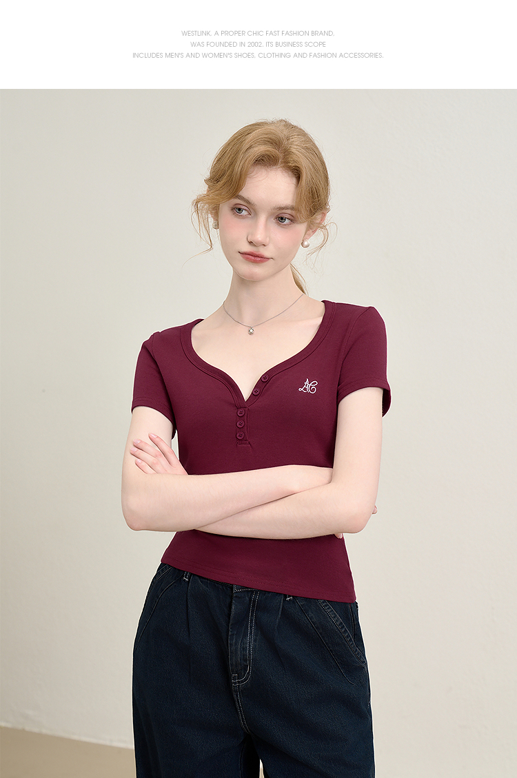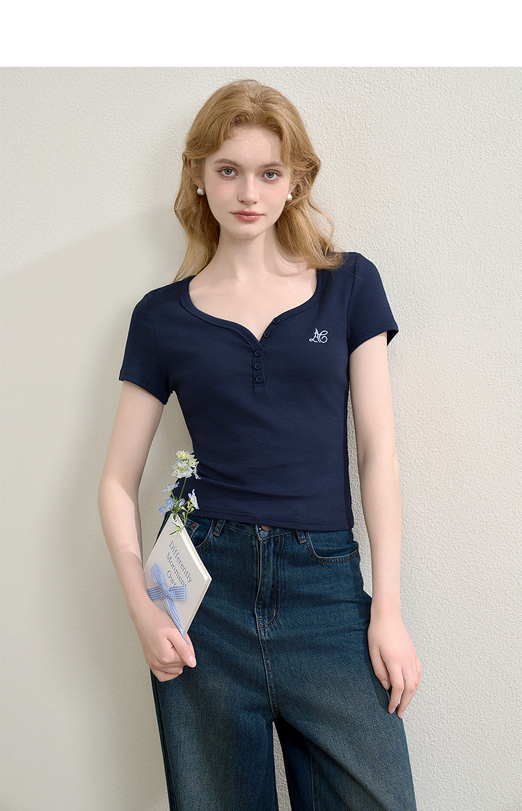 【限时秒杀】法式复古刺绣正肩大领口短袖T恤女夏季弹力修身短款上衣V0050353