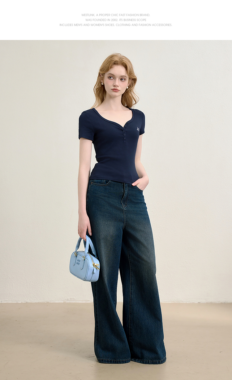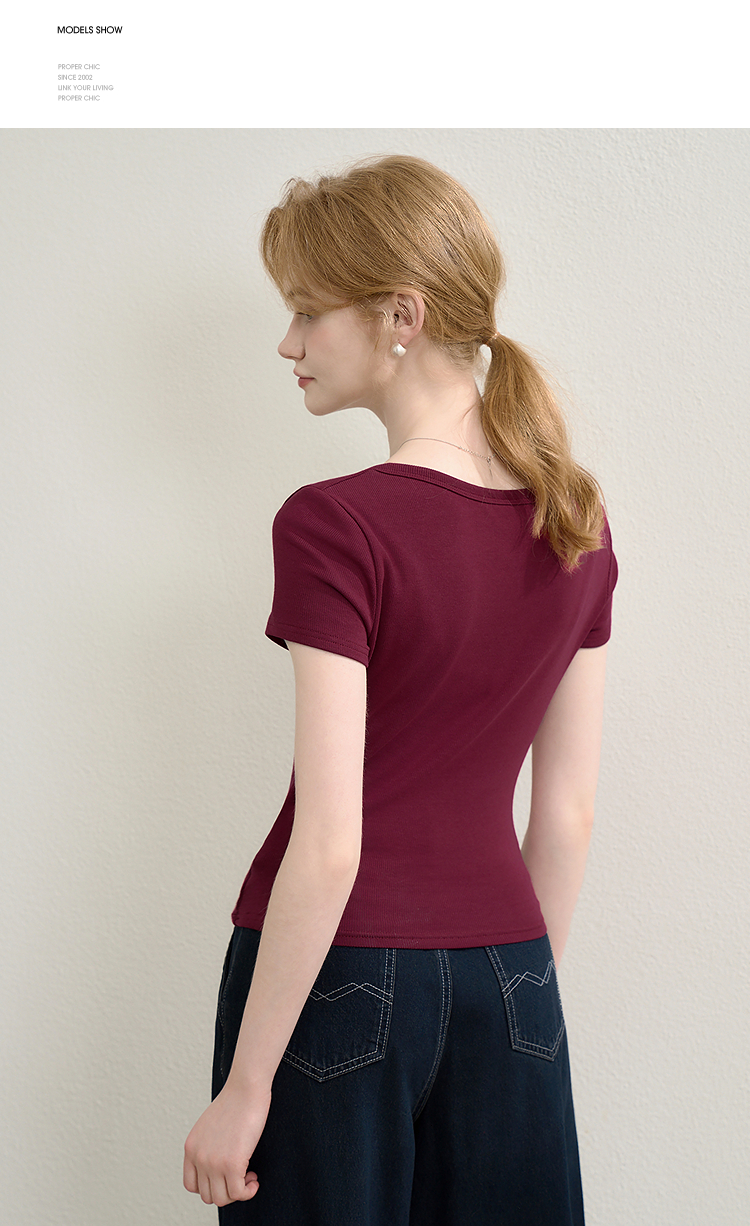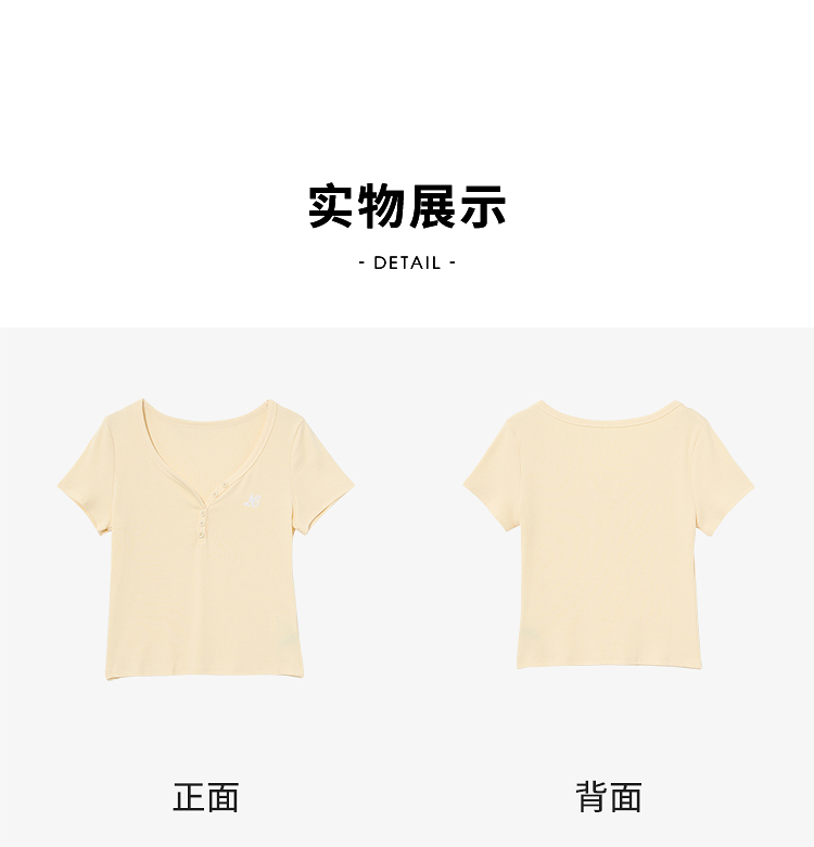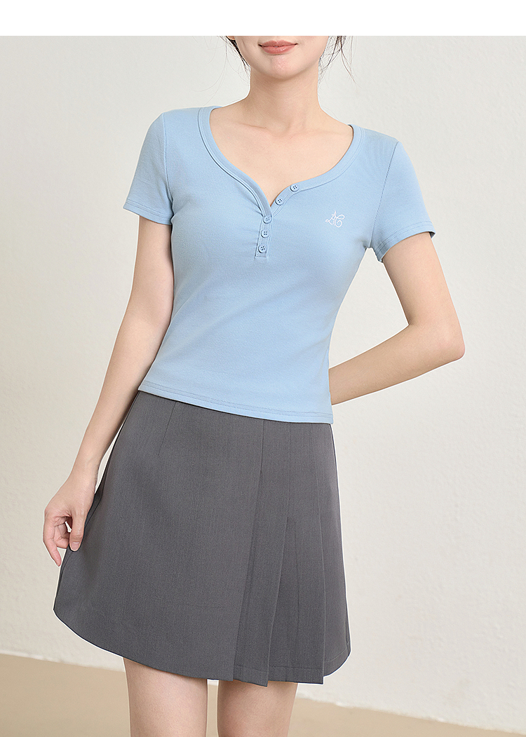 【限时秒杀】法式复古刺绣正肩大领口短袖T恤女夏季弹力修身短款上衣V0050353
