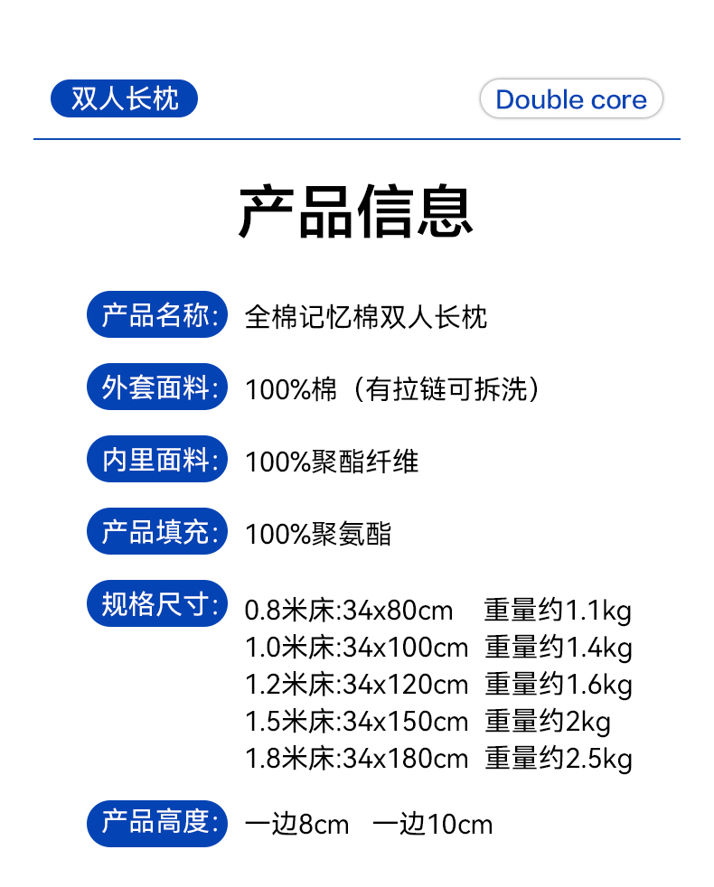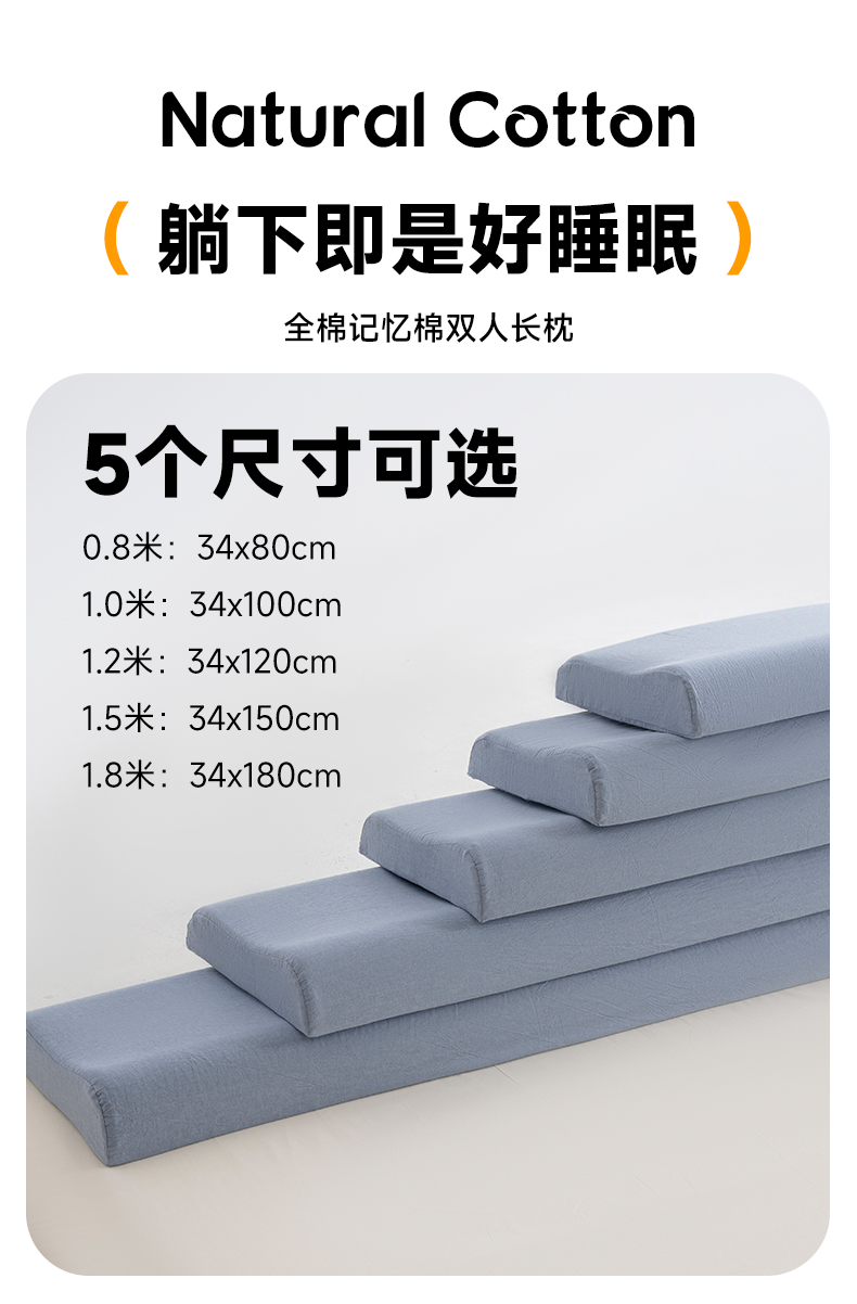 规格 : 0.8米: 34x80cm 重量约1.1kg 1米: 34x100cm 重量约1.4kg 1.2米:34x120cm 重量约1.6kg 1.5cm:34x150cm 重量约2kg 1.8cm:34x180cm 重量约2.5kg 颜色: 橘粉色 蓝色 灰色 外套面料:100%棉(全棉水洗棉,可拆洗) 内里面料:100%聚酯纤维 填充:100%聚氨酯 高度都是8/10,一边8cm,一边10cm 外套可拆洗 ,内芯不建议暴晒、水洗