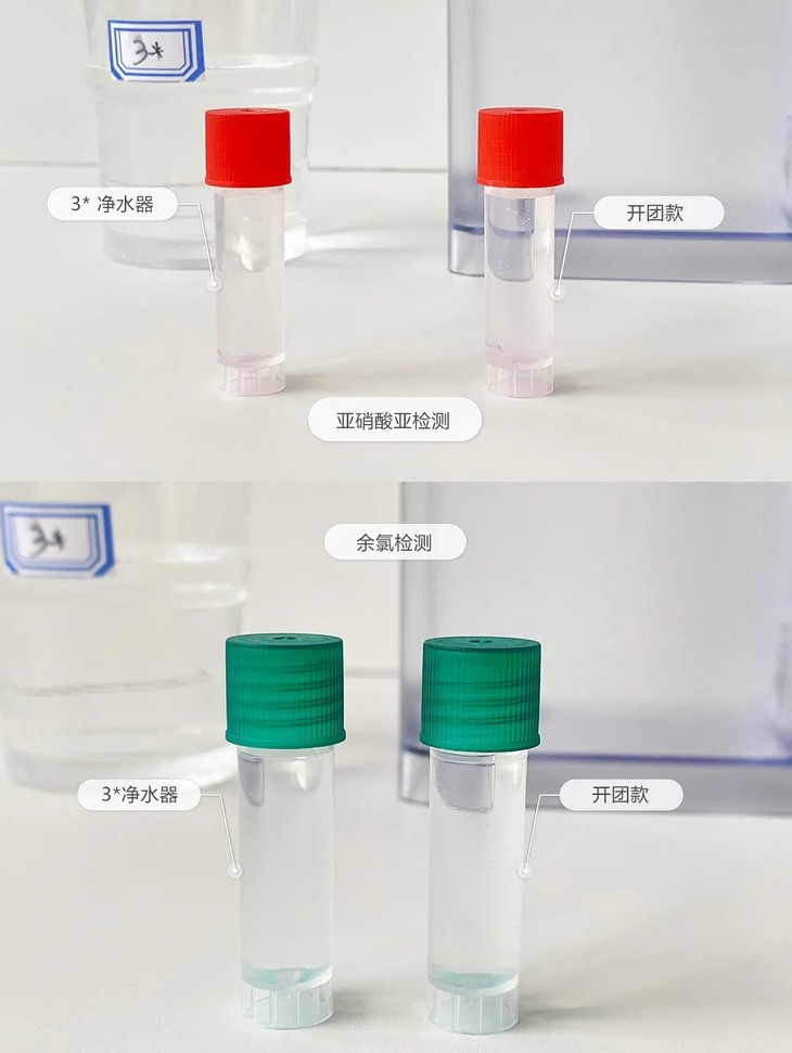 包括管道微生物污染,或者地表污染渗透导致的亚硝酸盐超标、自来水消毒带来的余氯等问题,也都没有发生(试剂无色表示不含亚硝酸盐和氯)