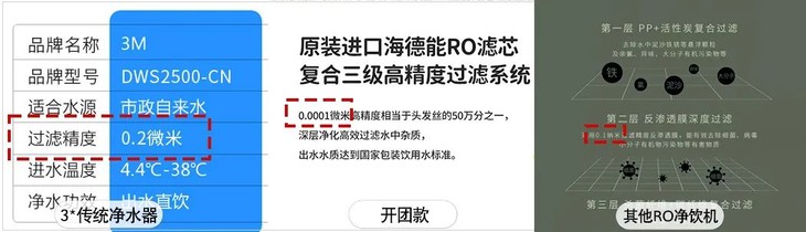 👉3级过滤系统/美国原装反渗透滤芯,保留有益矿物质的同时水硬度更低,还更省水