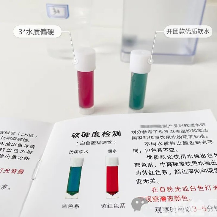 开团款我用试剂测了下,矿物质含量看似比农*山泉和3*净水器要少一些(颜色偏紫,矿物质含量高,偏蓝矿物质会偏低)。