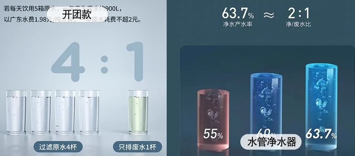 不过,好的膜片水通量大,废水率更低。这款的废水率基本是4:1(所有净饮机都有废水率哈,净化4杯水,出1杯废水,不过也不得不说,一般大品牌这个废水率是标配),比很多接自来水的反渗透净水器要省水(接水龙头的净水器表现好点的废水率还要2:1左右)