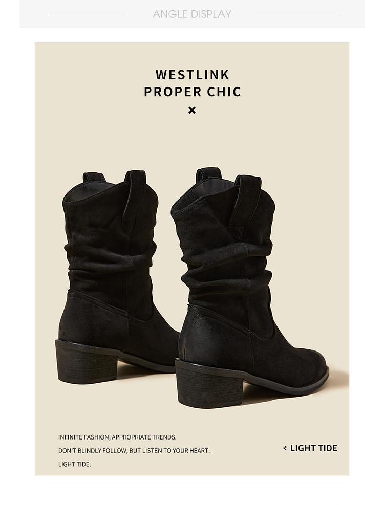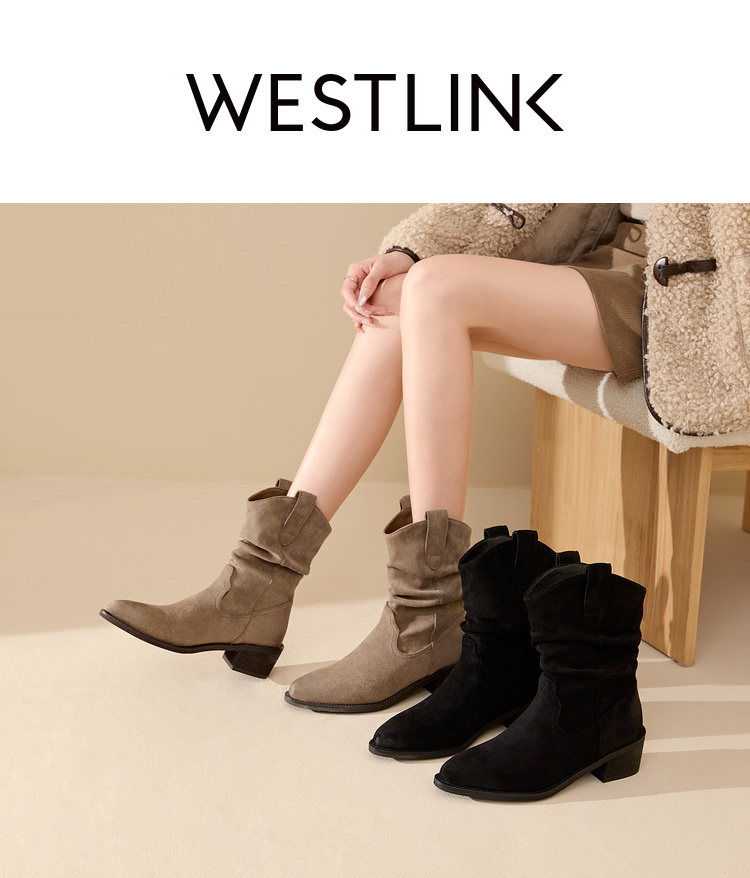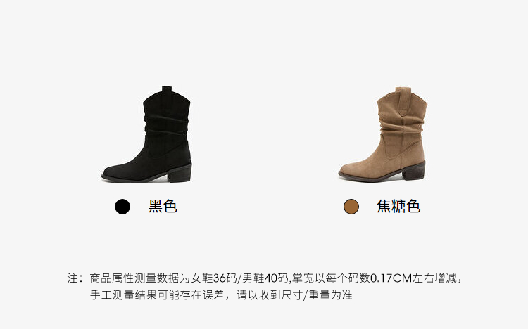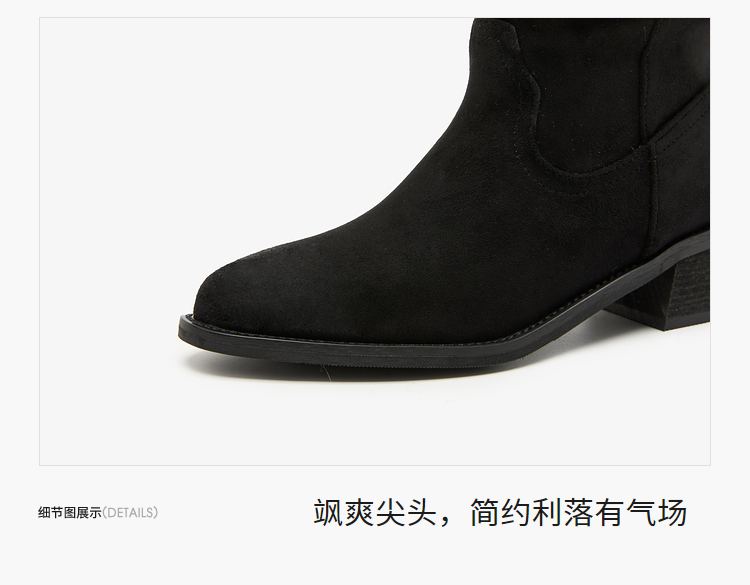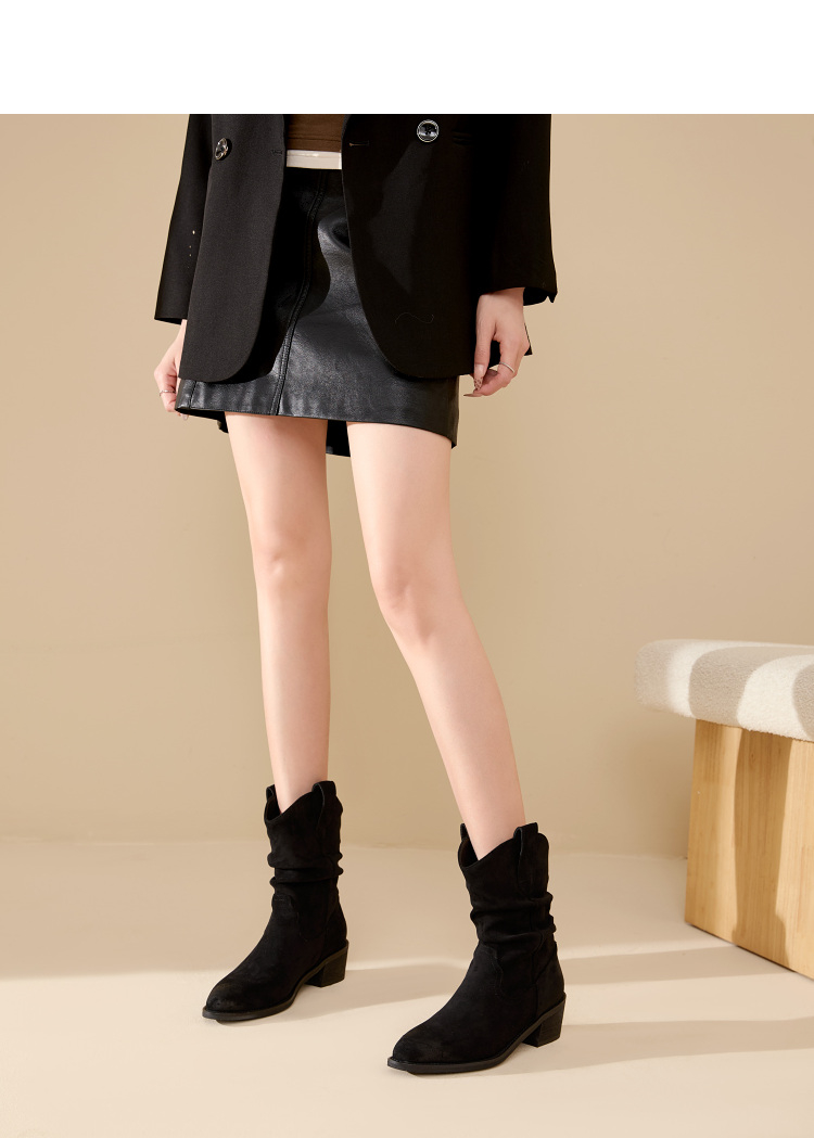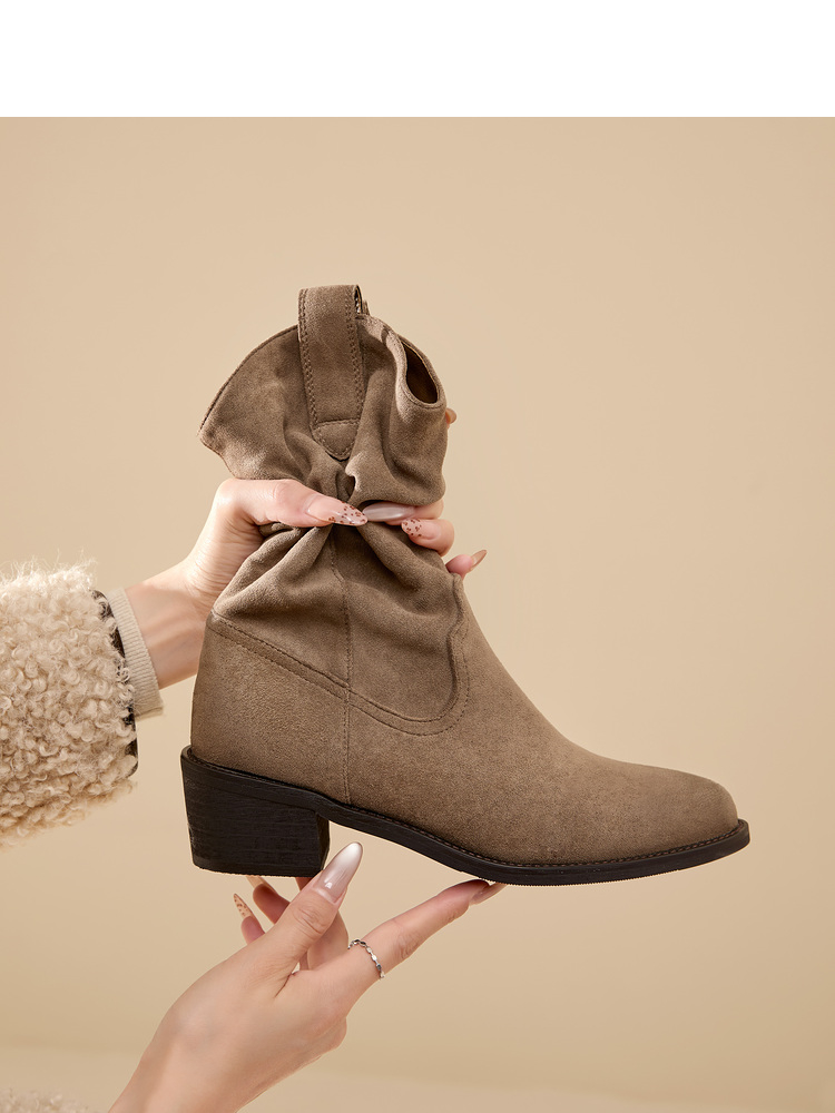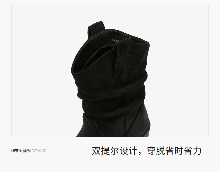 西遇尖头堆堆靴女冬季加绒新款复古V口西部牛仔靴粗跟短靴子V4147856