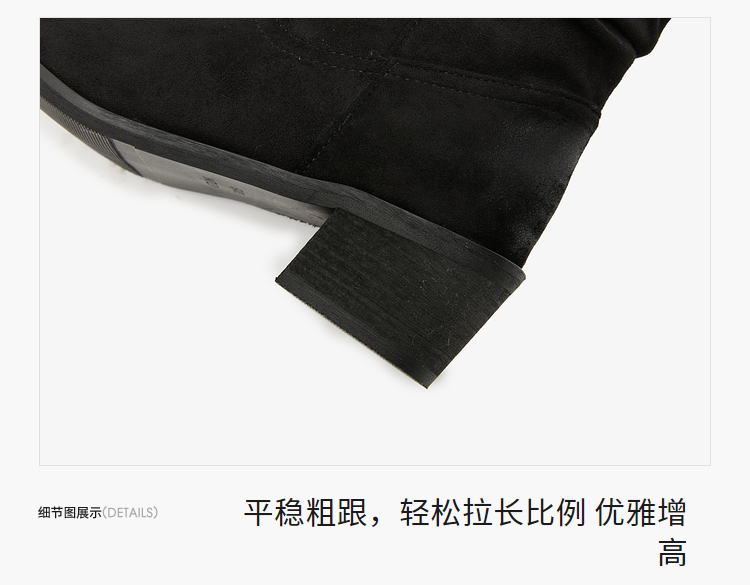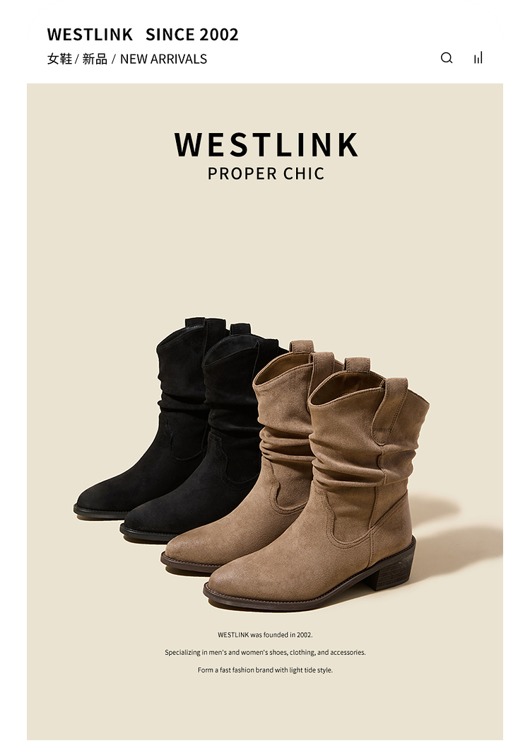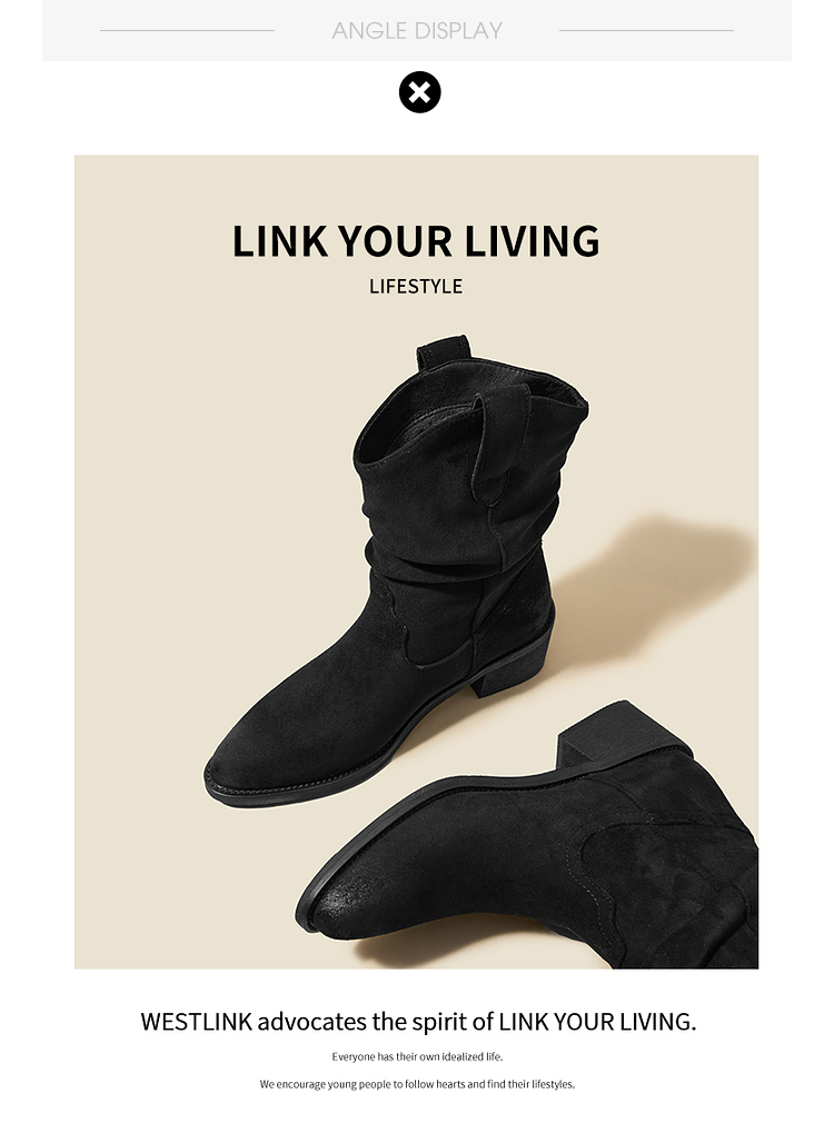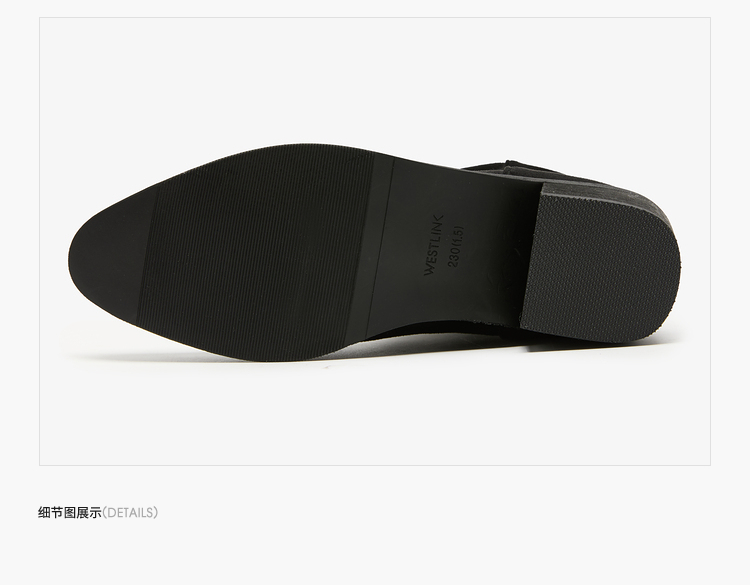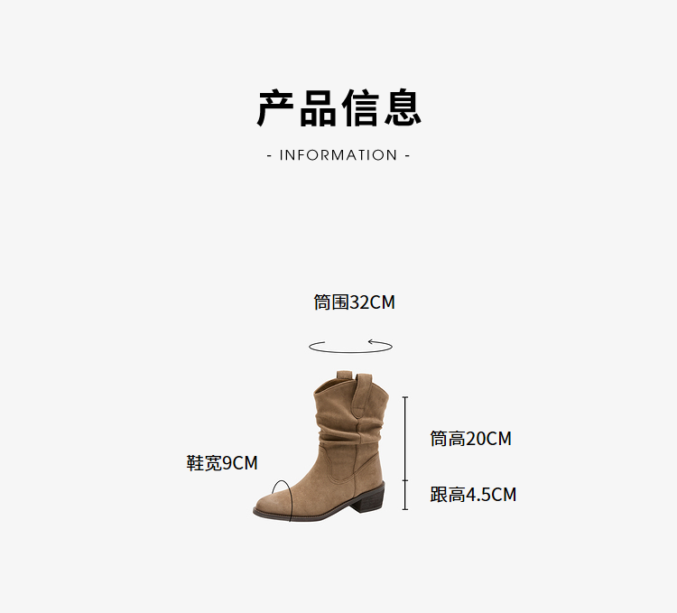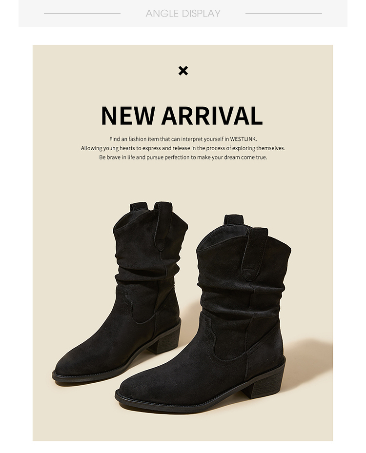 西遇尖头堆堆靴女冬季加绒新款复古V口西部牛仔靴粗跟短靴子V4147856