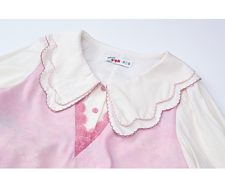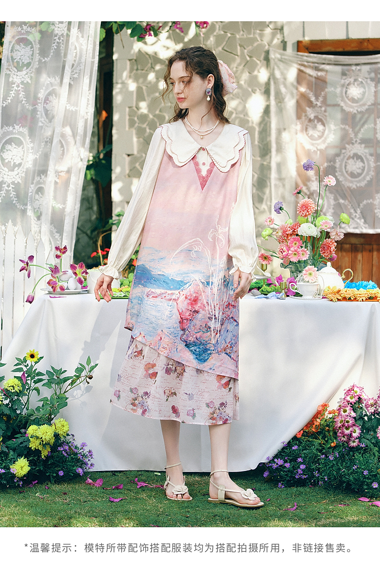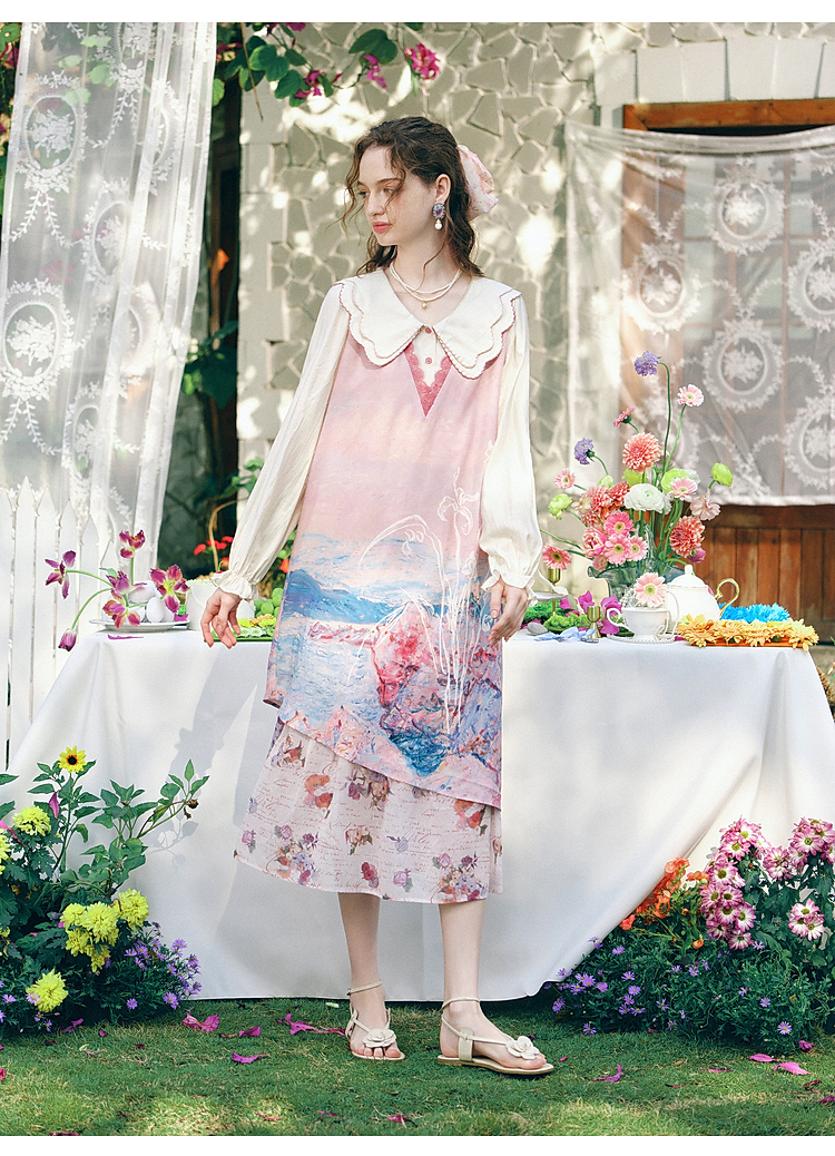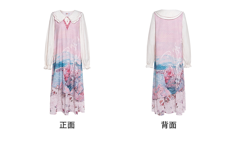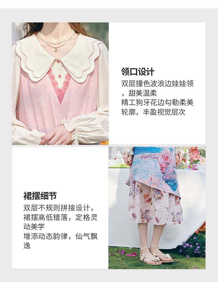 两三事春日幻想2026春季新款甜美波浪绣边双层领印花假两件连衣裙