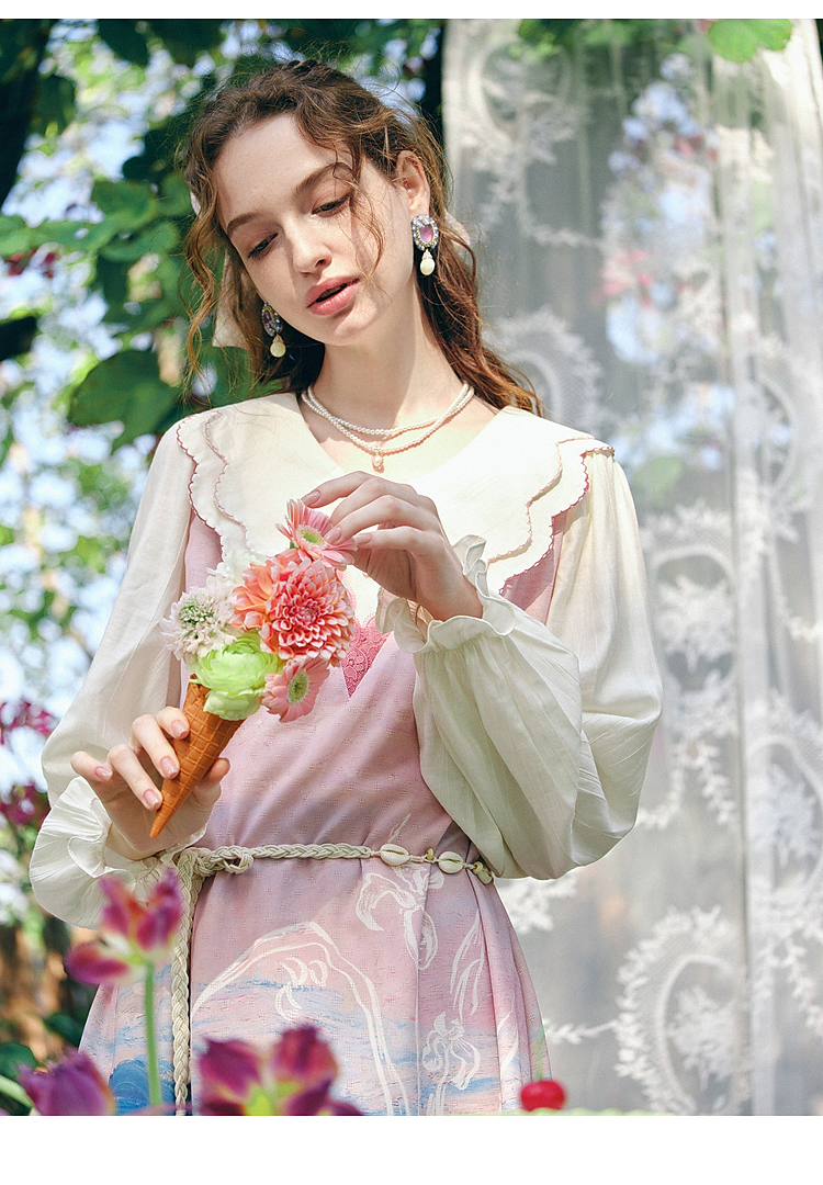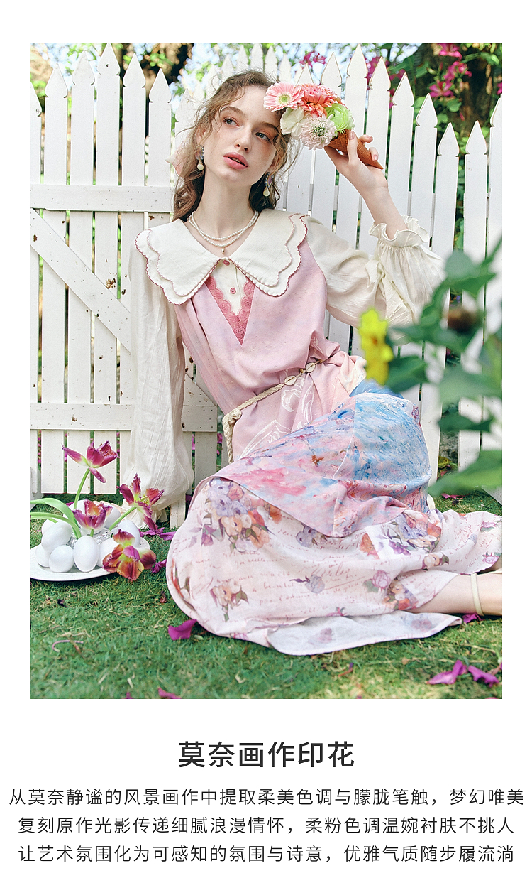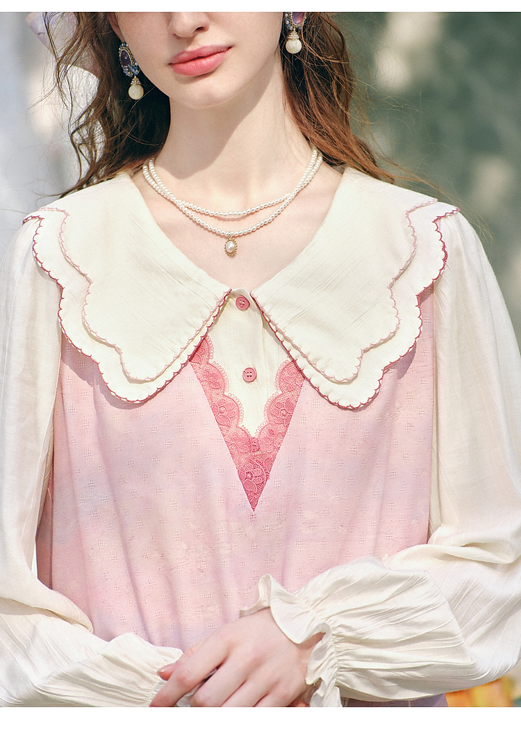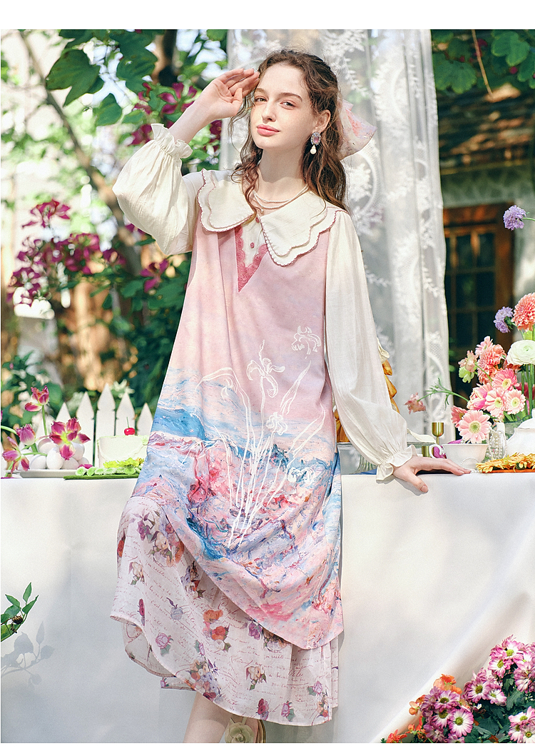 两三事春日幻想2026春季新款甜美波浪绣边双层领印花假两件连衣裙