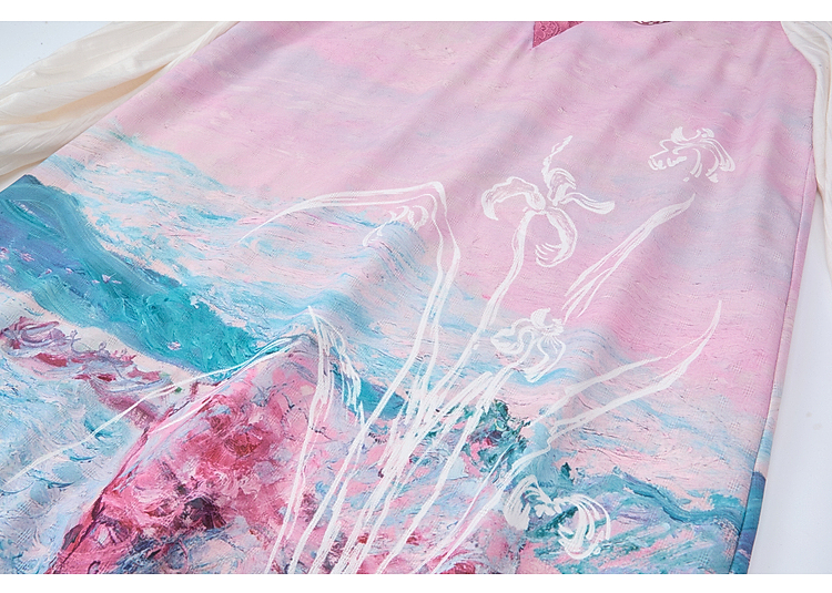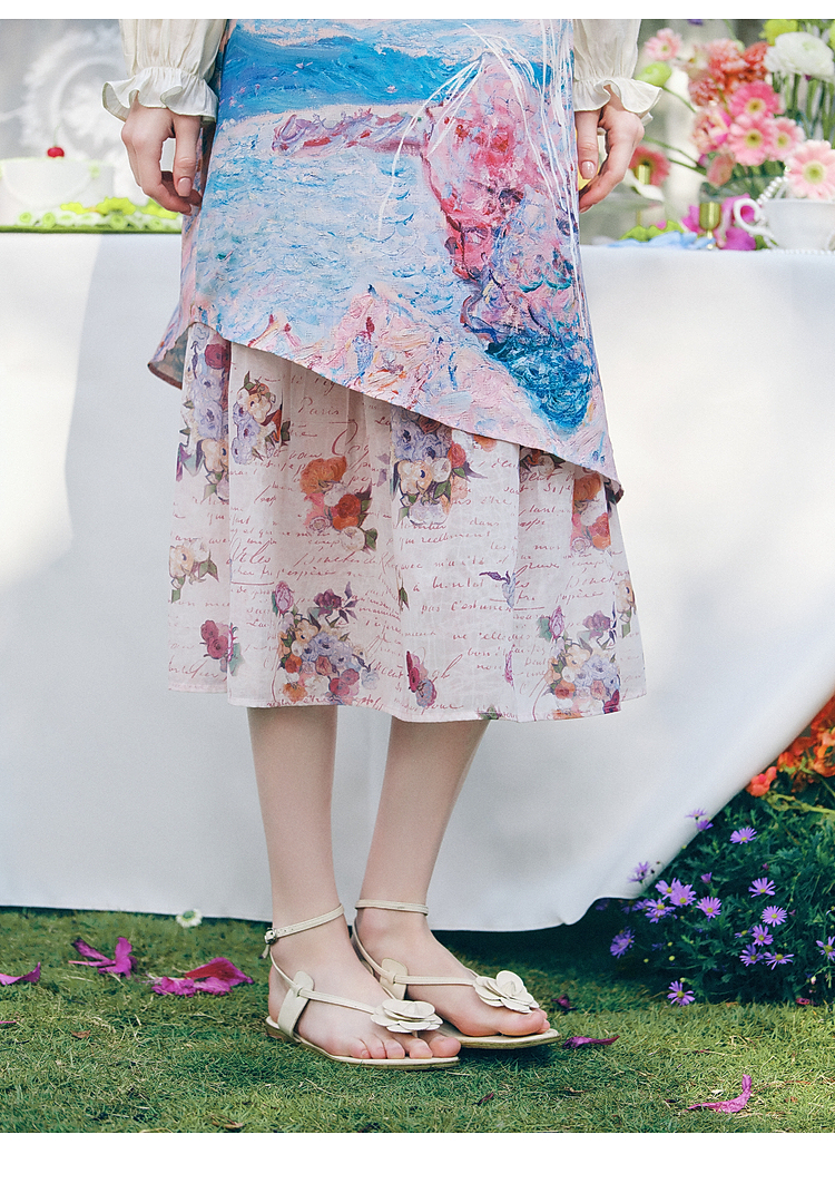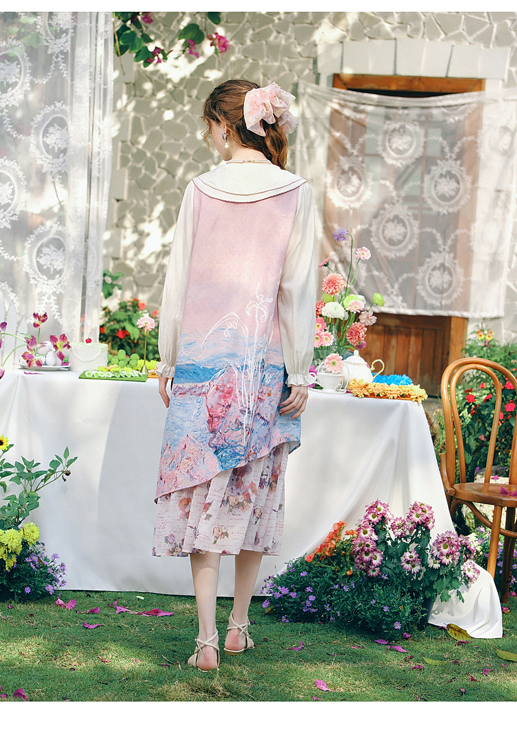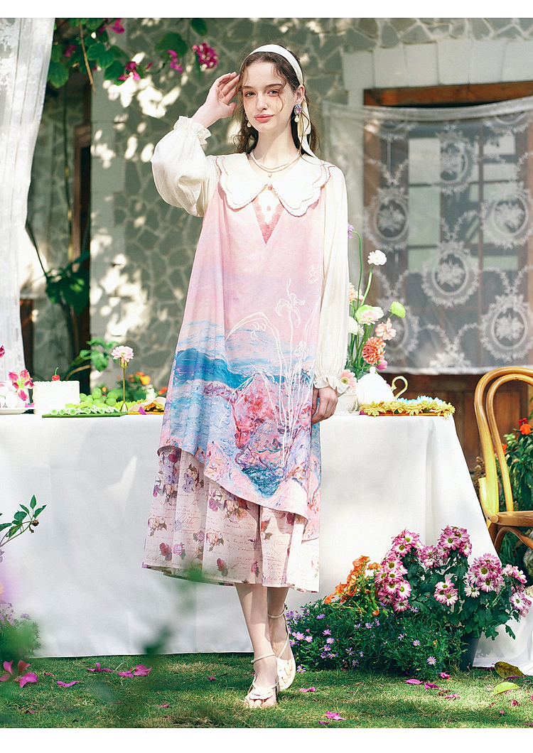 两三事梵高文艺永恒生机2025夏新款法式蕾丝拼接印花吊带裙连衣裙