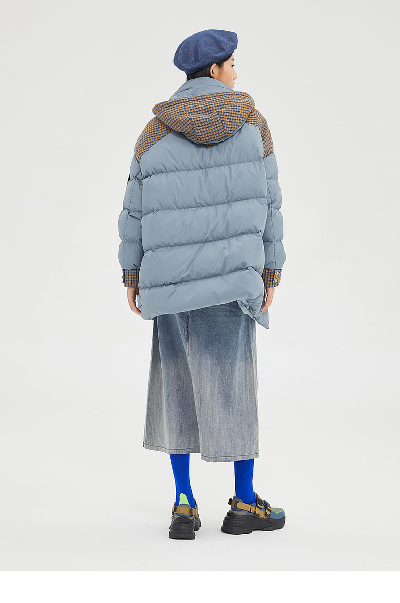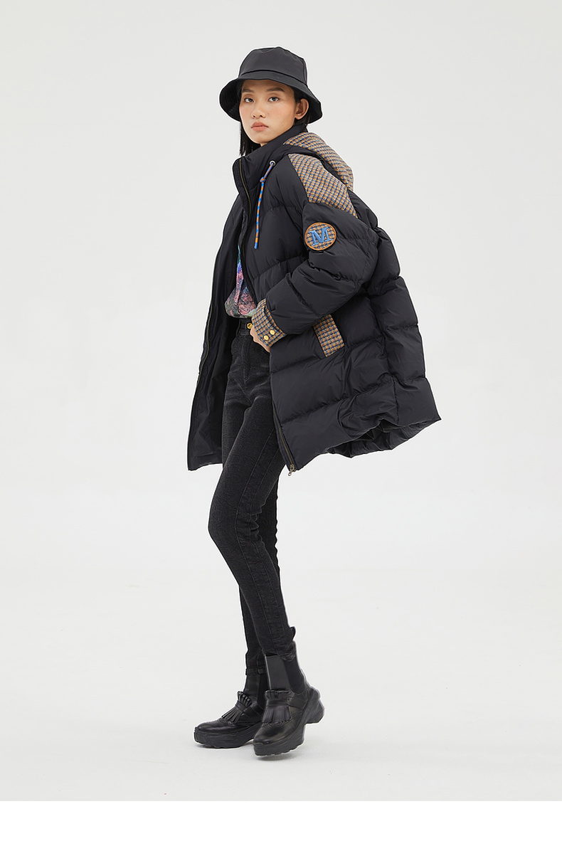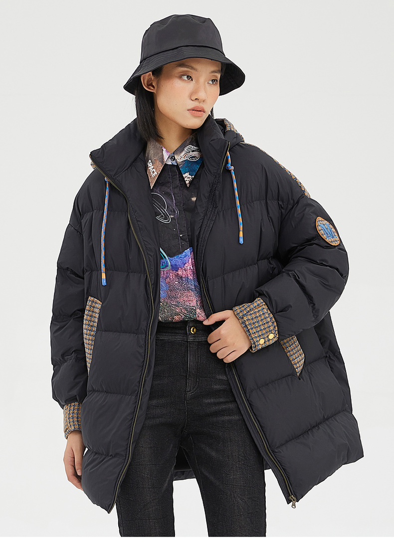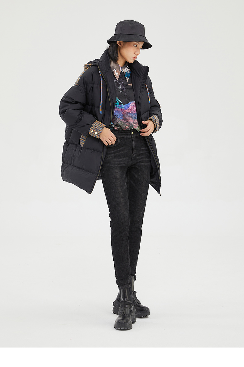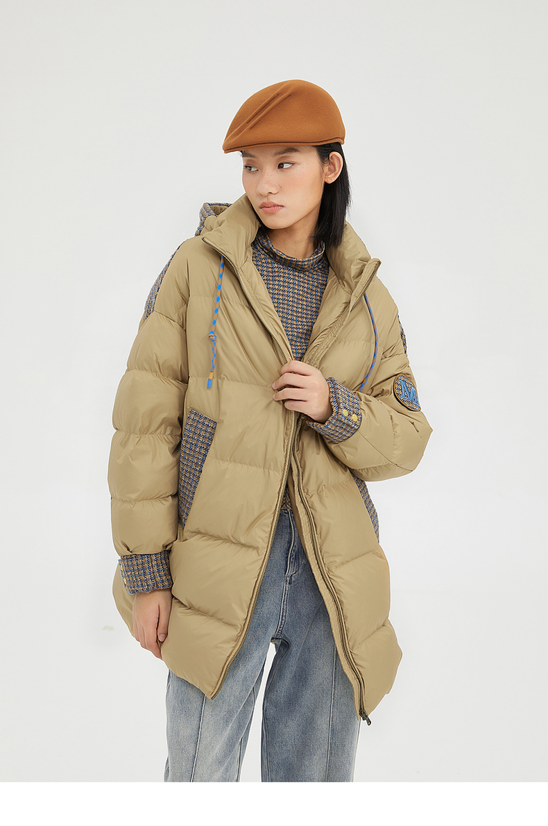 谜底2022冬季新品撞色宽松中长款连帽羽绒服加厚外套女229MY6185