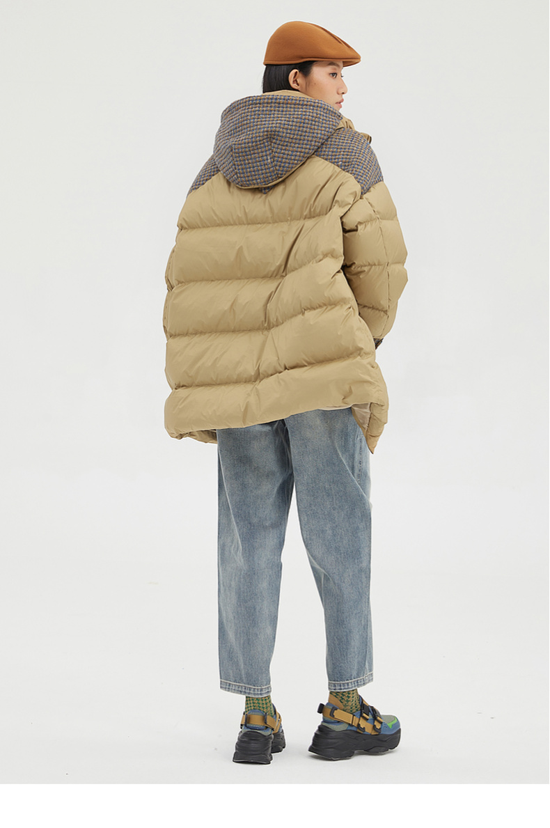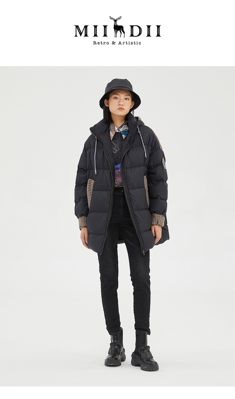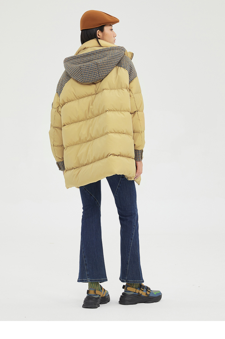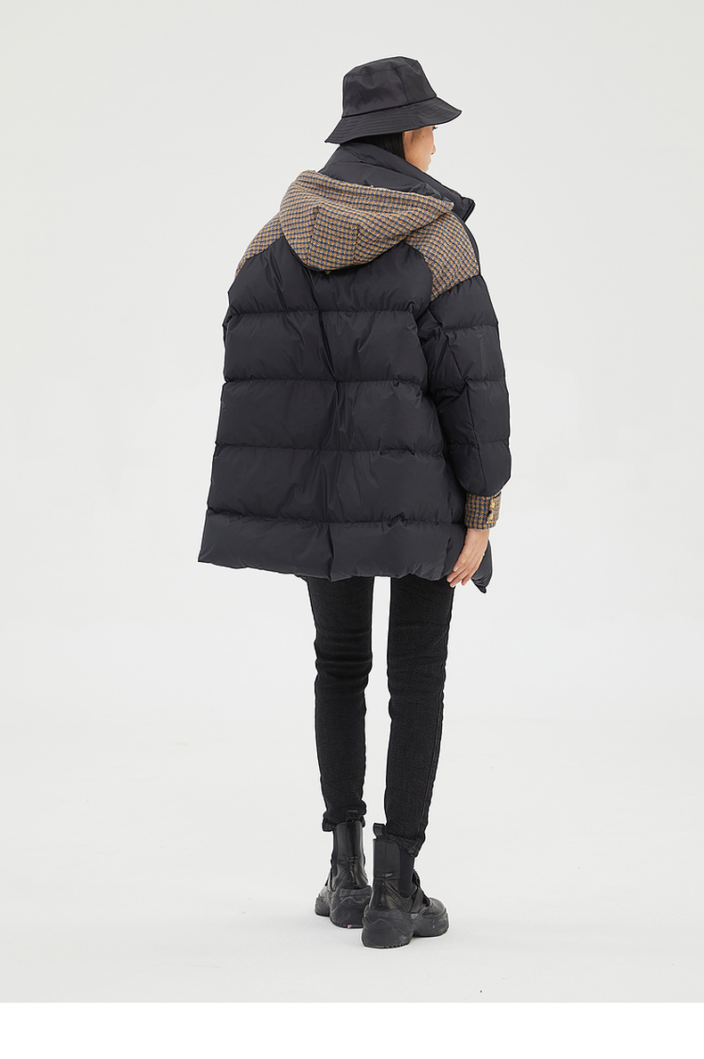 谜底2022冬季新品撞色宽松中长款连帽羽绒服加厚外套女229MY6185