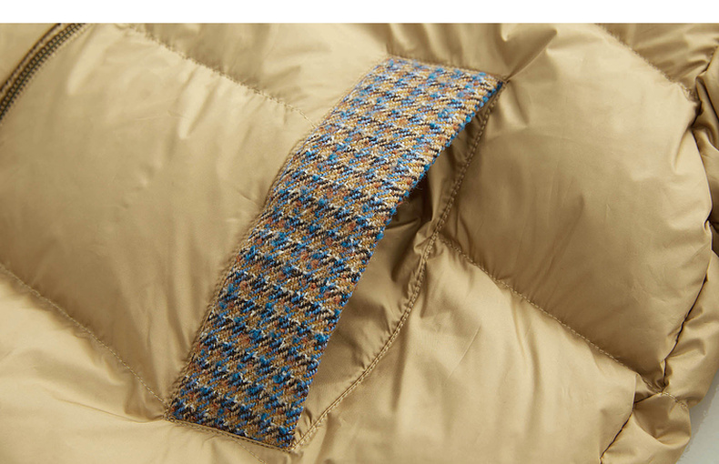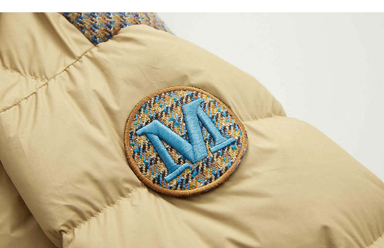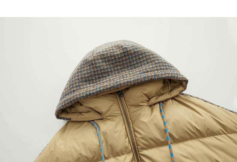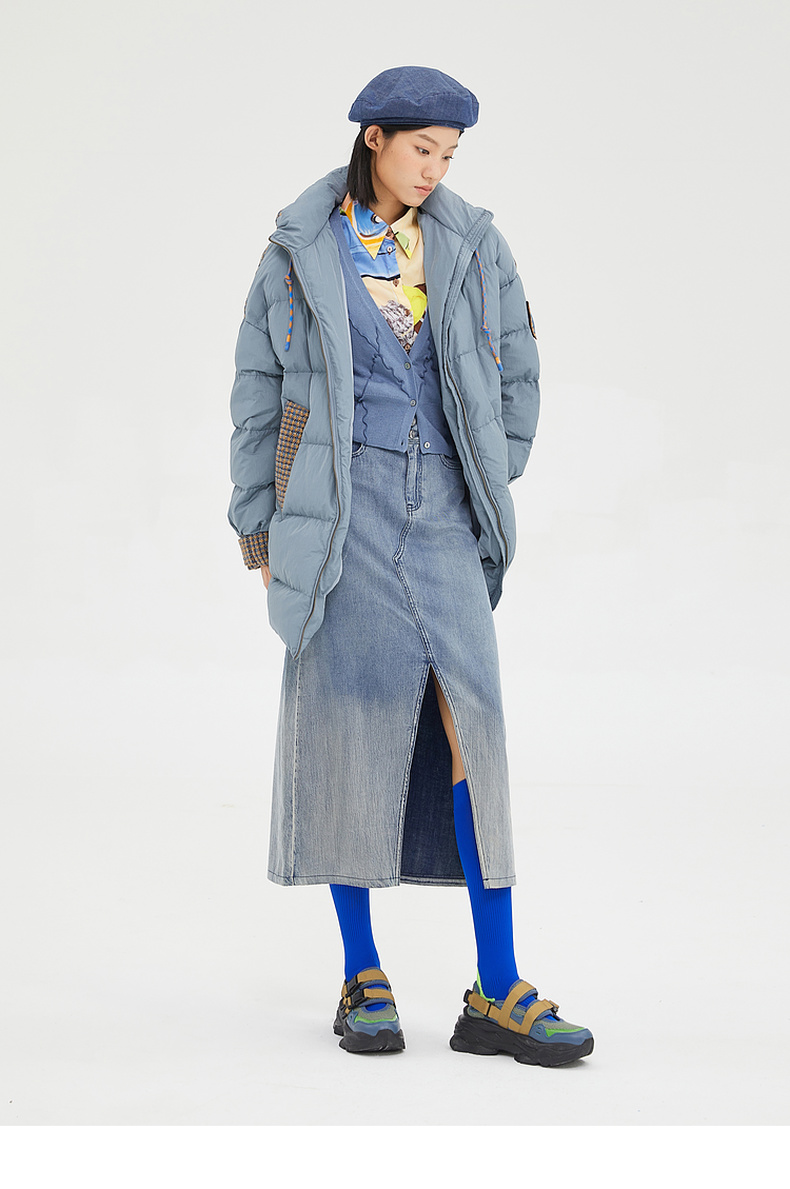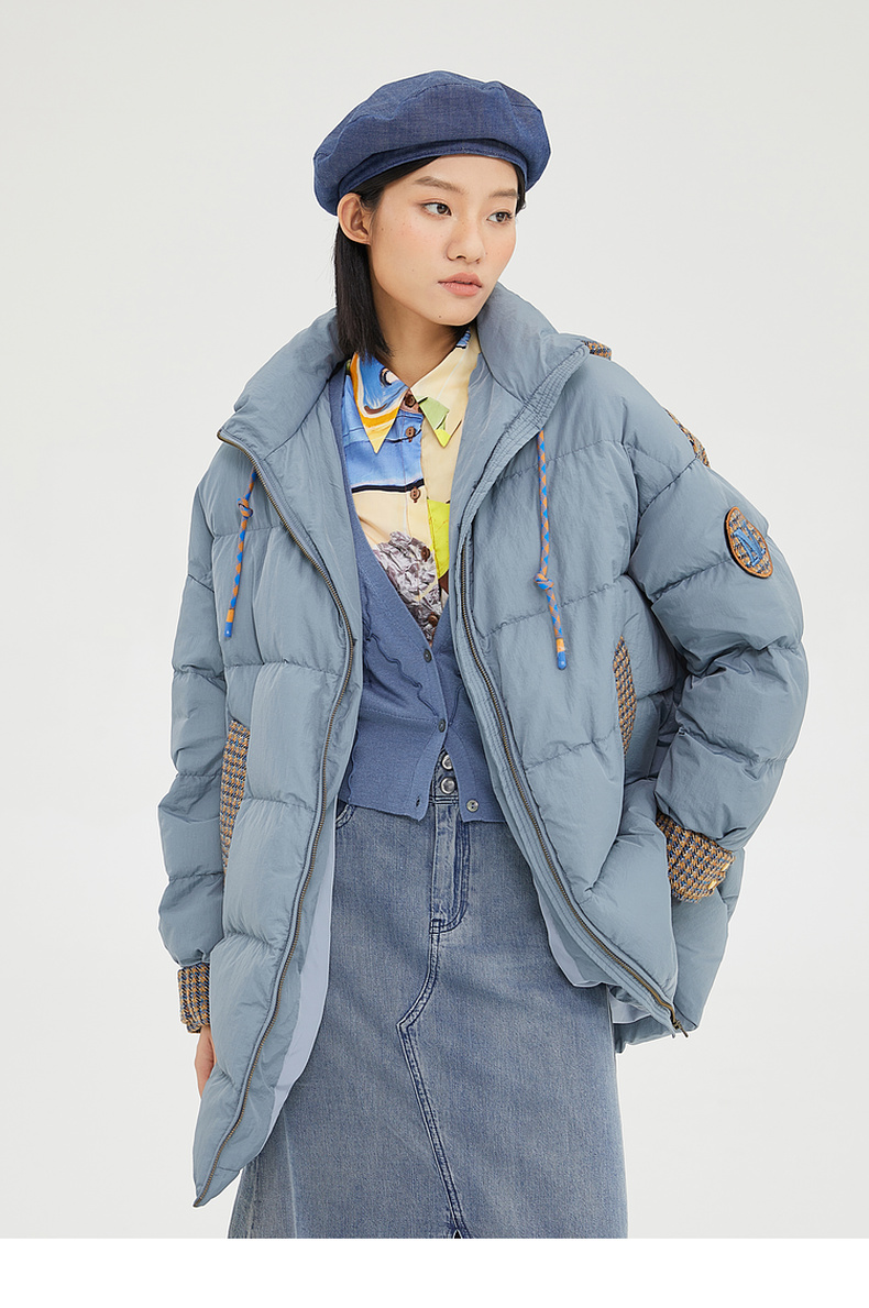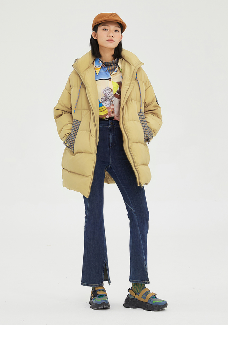 谜底2022冬季新品撞色宽松中长款连帽羽绒服加厚外套女229MY6185