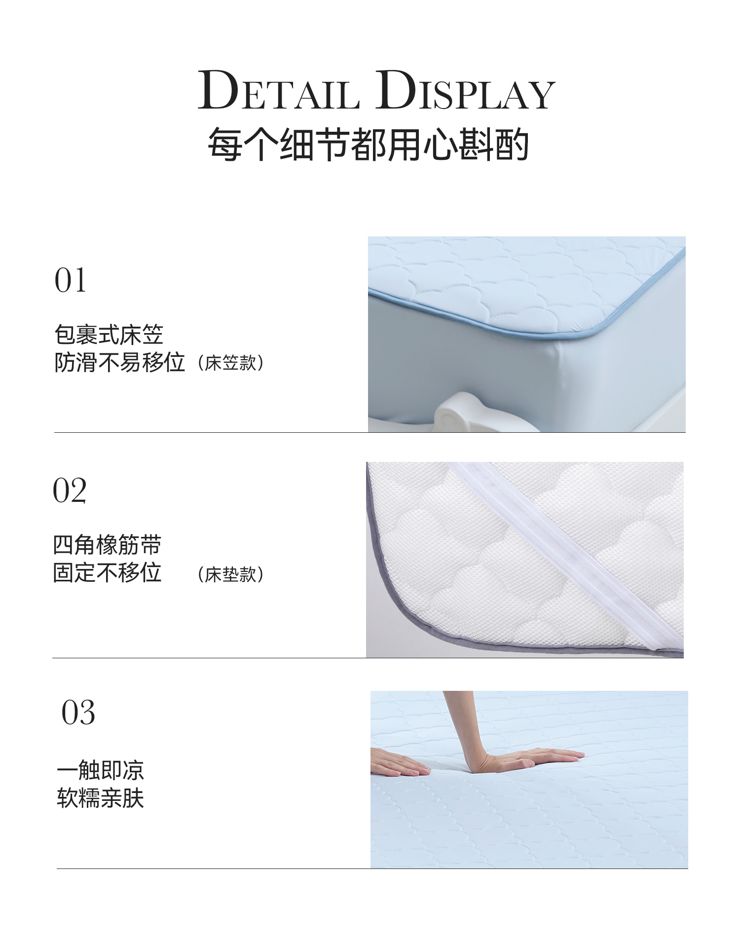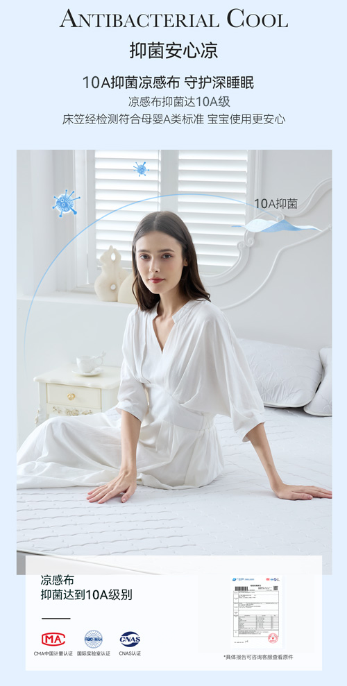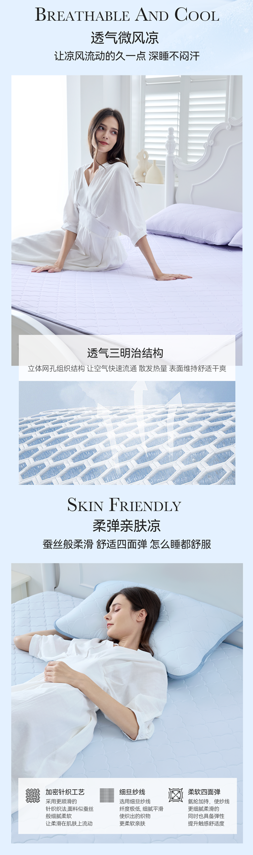 底布采用三明治细网眼布底布,透气性更好了,睡在上面一点都不会觉得闷热,搭配凉感被使用,睡眠舒适感直接翻倍。