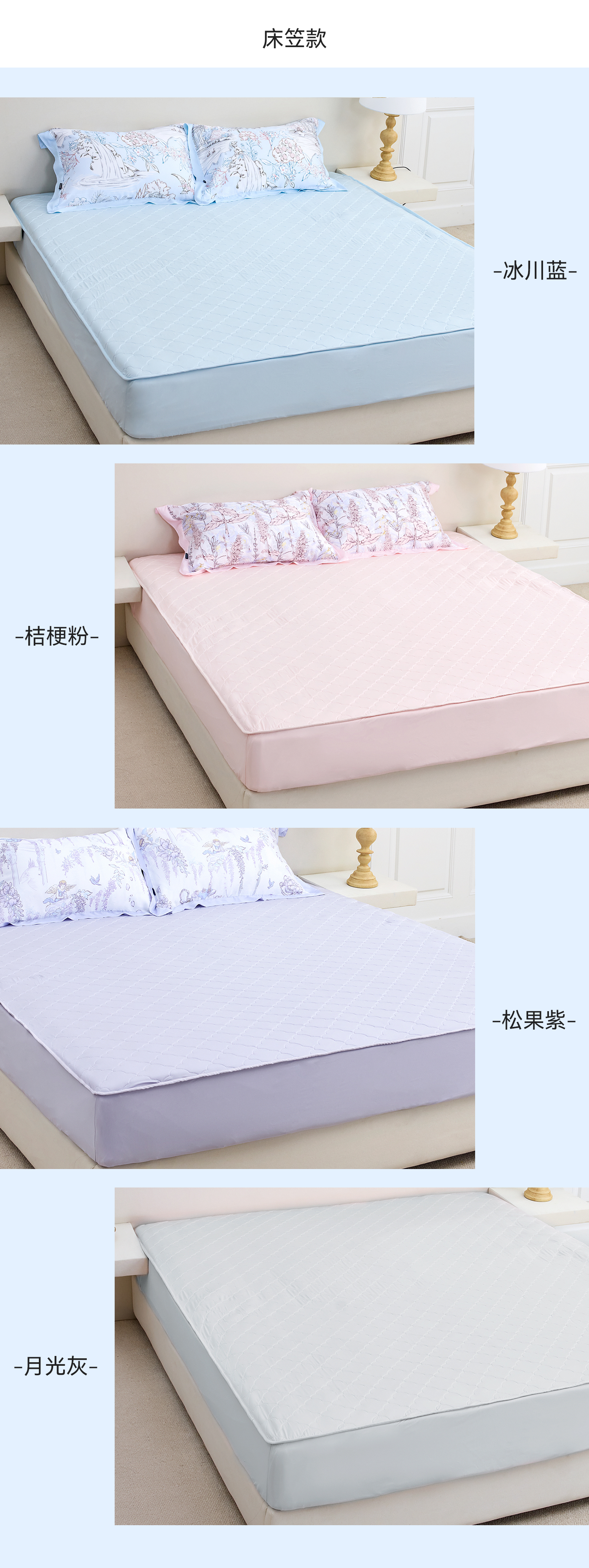 床垫款四角都有橡筋,能牢牢包裹住整个床垫不移位,都是4色可选:
