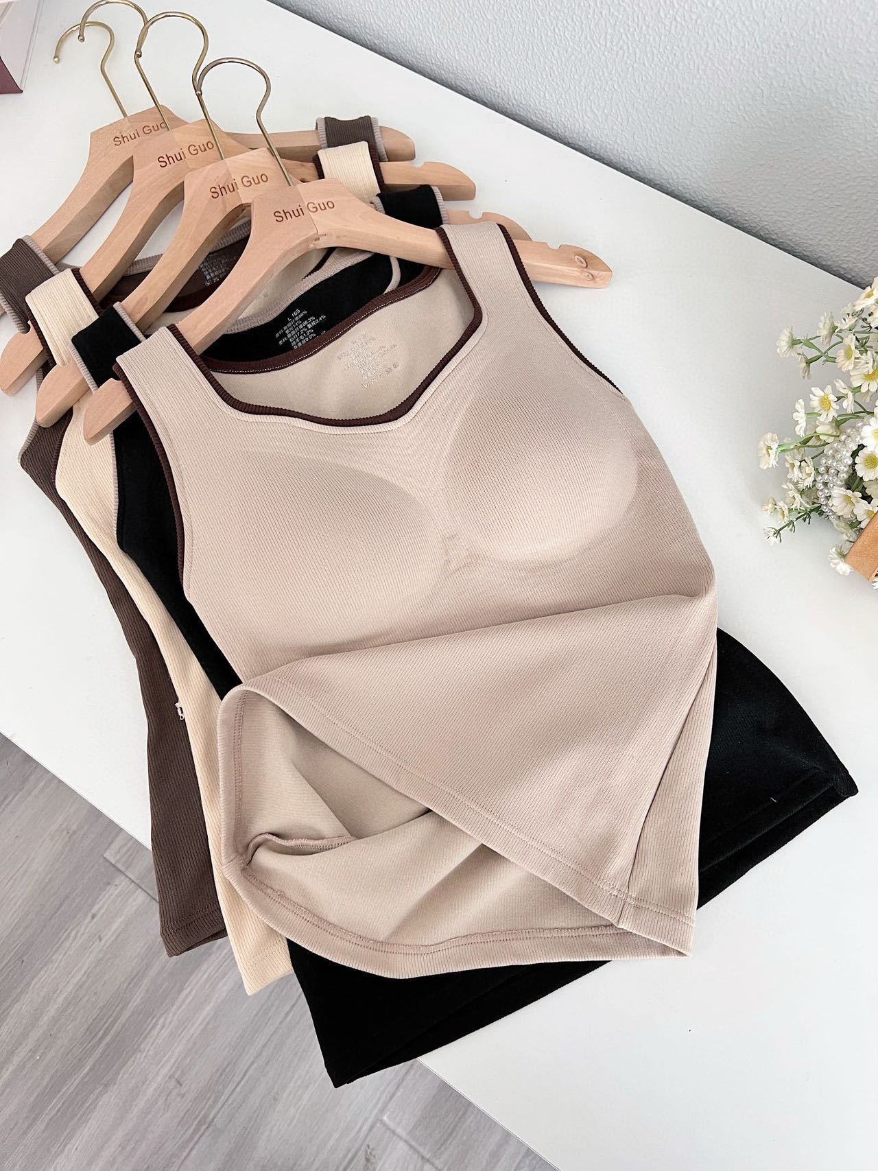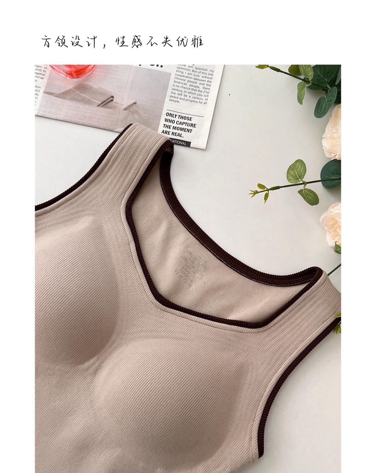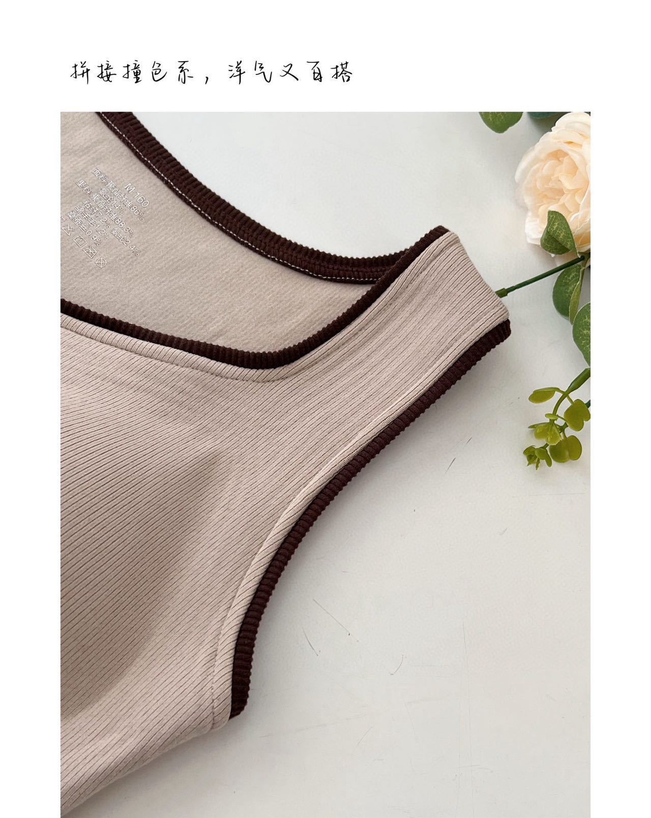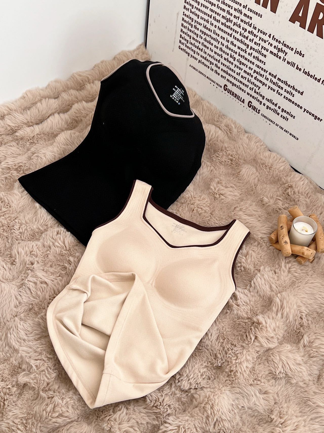 新款女士保暖背心德绒带胸垫一体式内衣无袖撞色方领打底衫可外穿