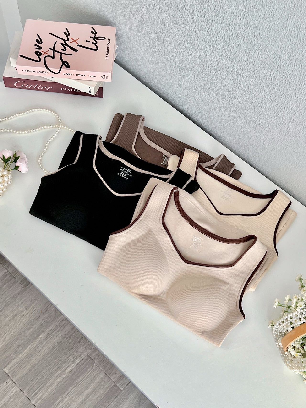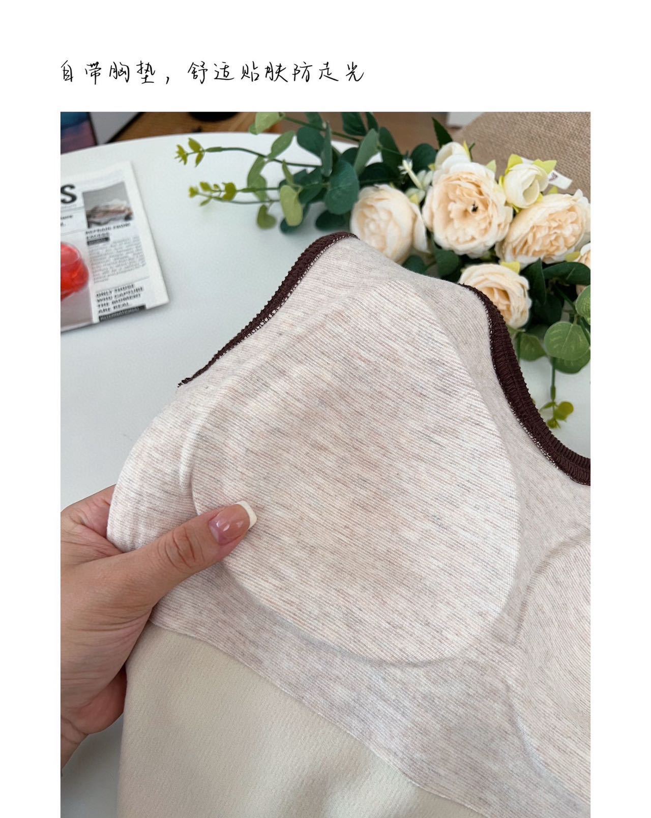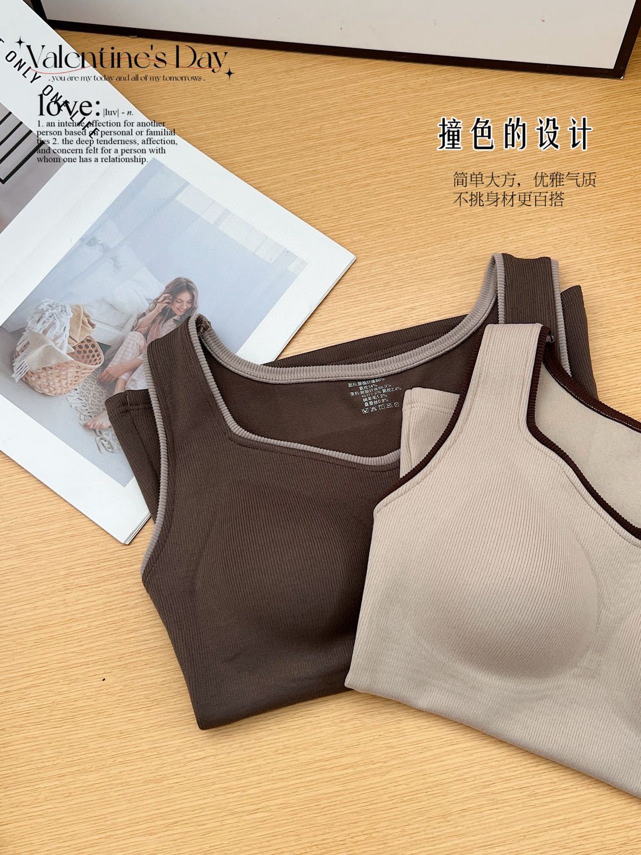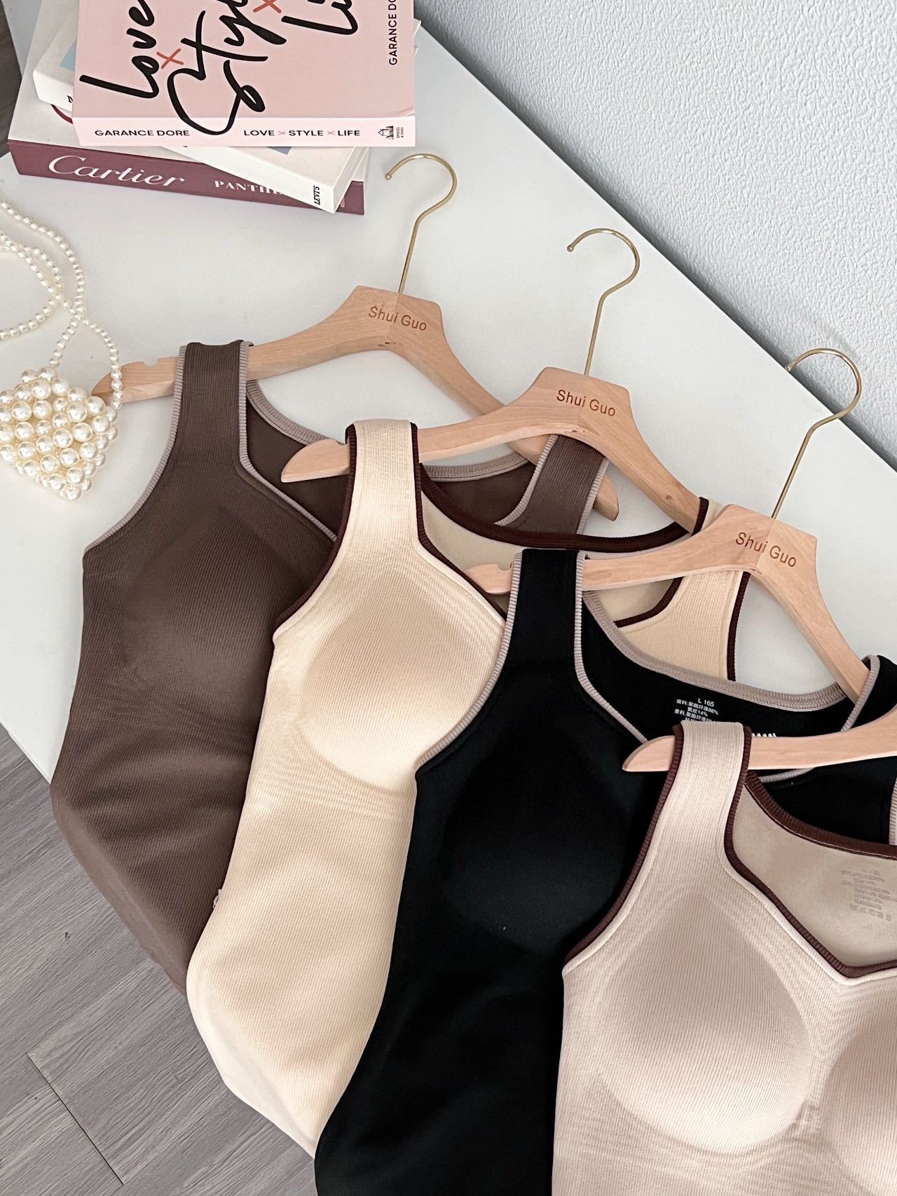 新款女士保暖背心德绒带胸垫一体式内衣无袖撞色方领打底衫可外穿