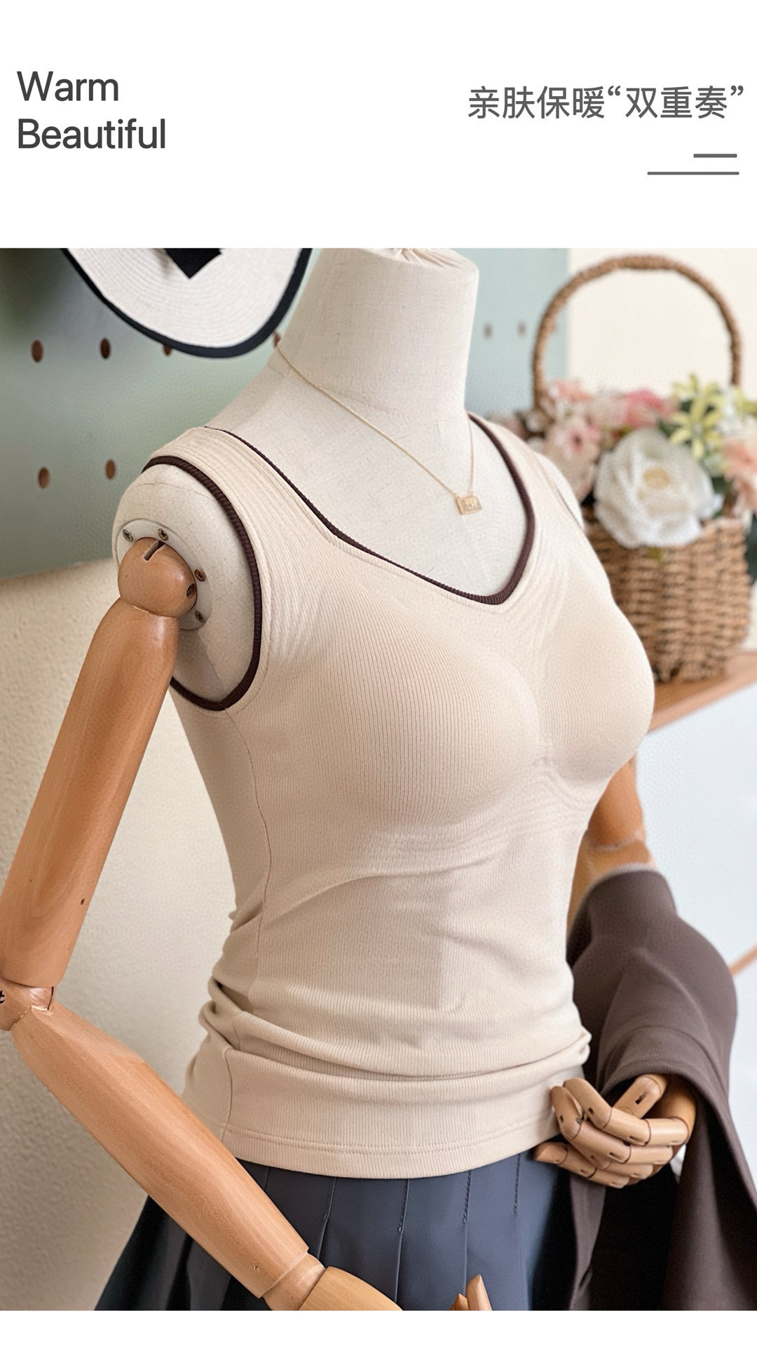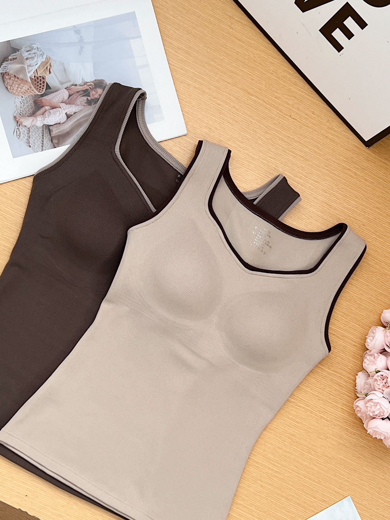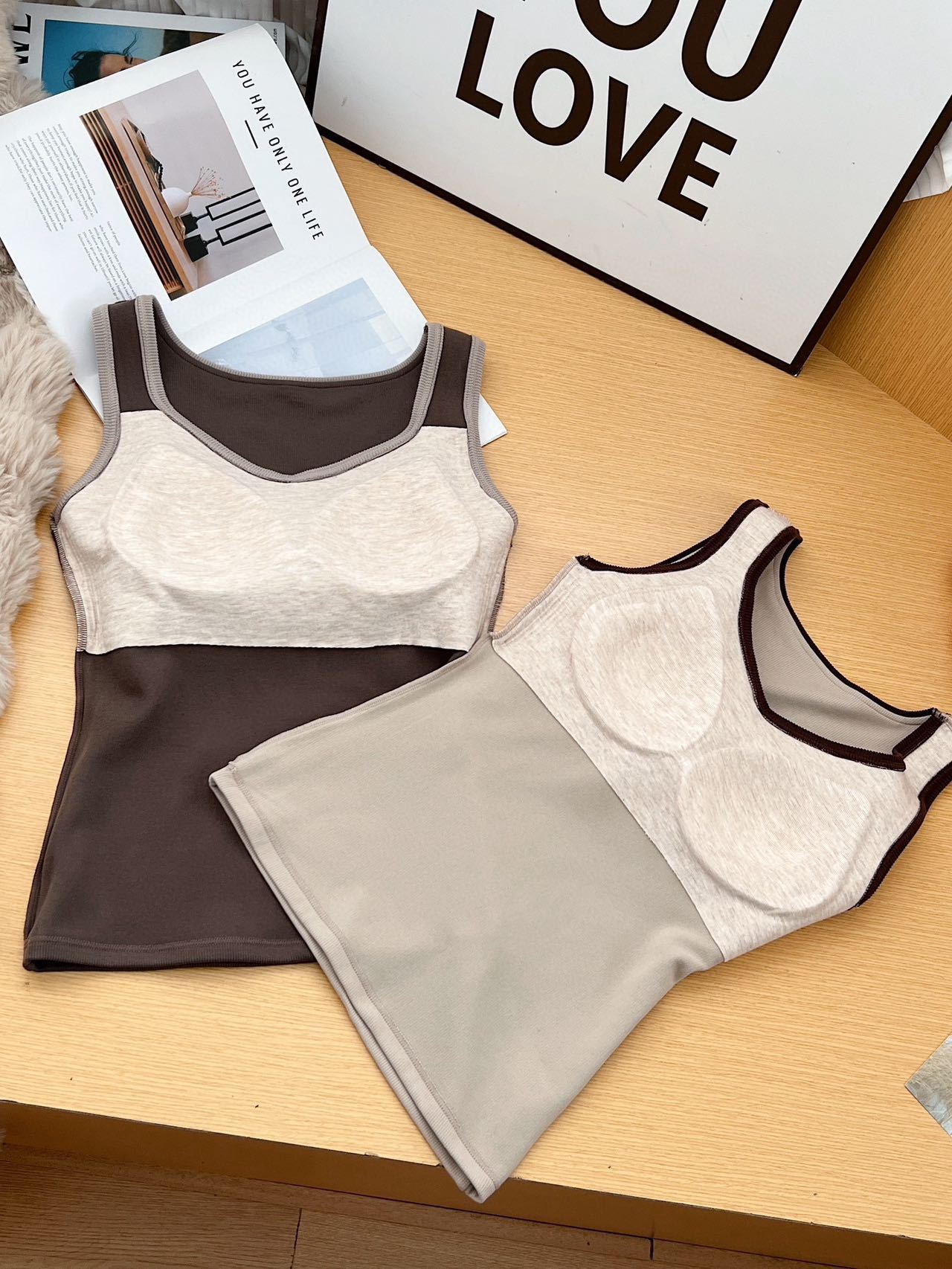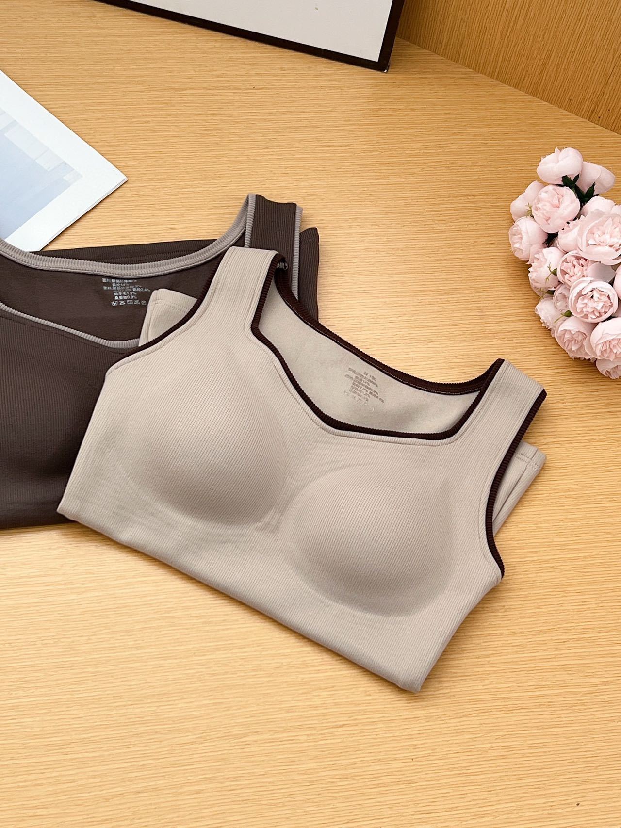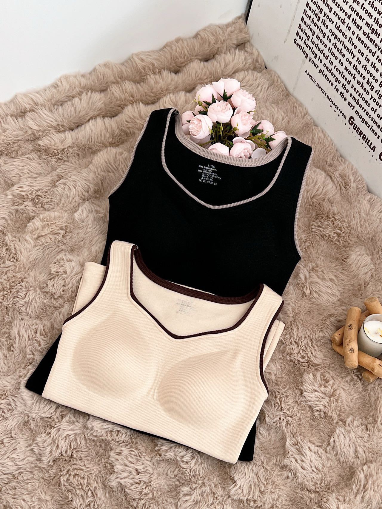 新款女士保暖背心德绒带胸垫一体式内衣无袖撞色方领打底衫可外穿
