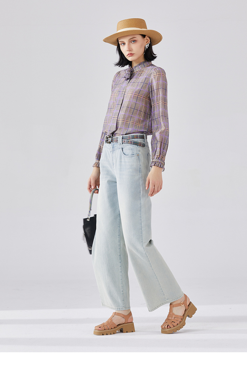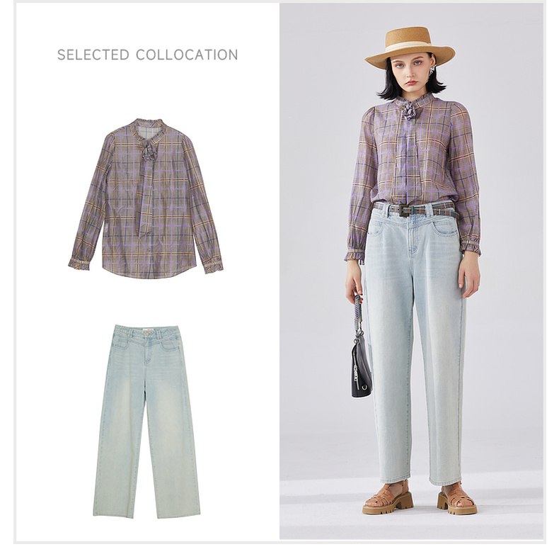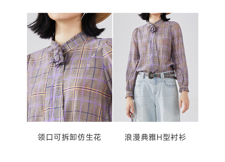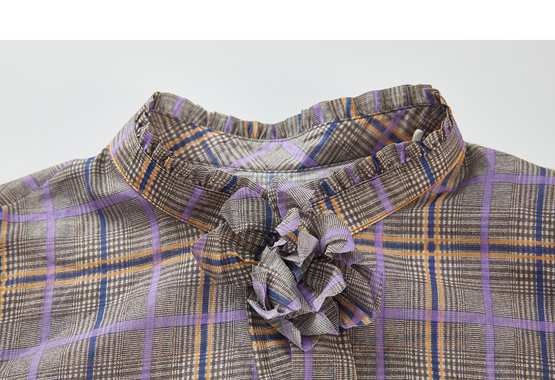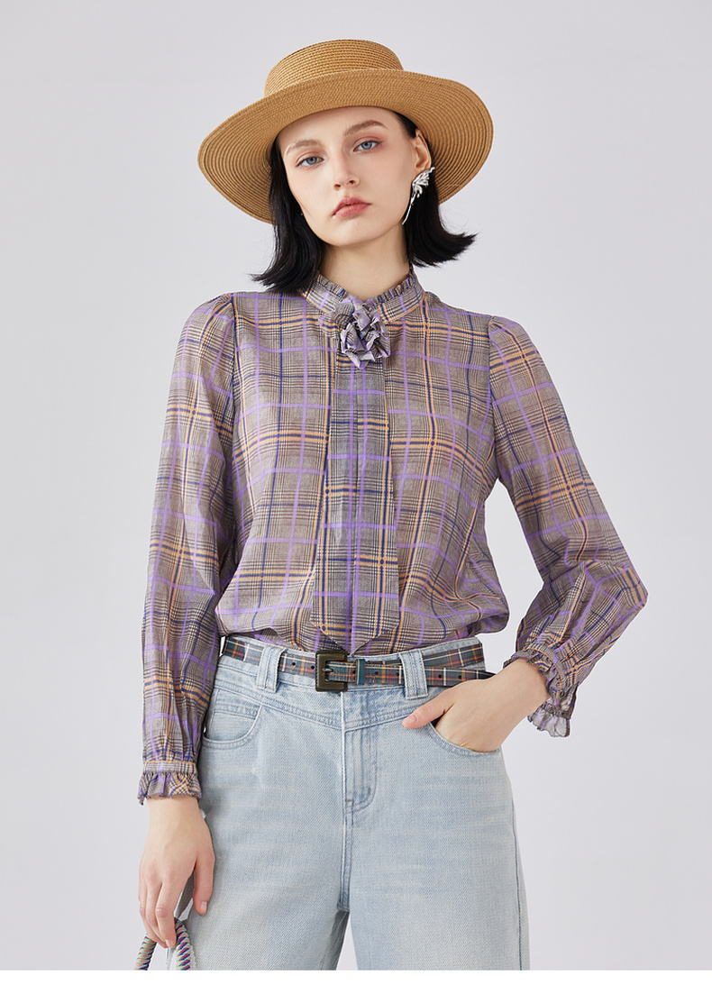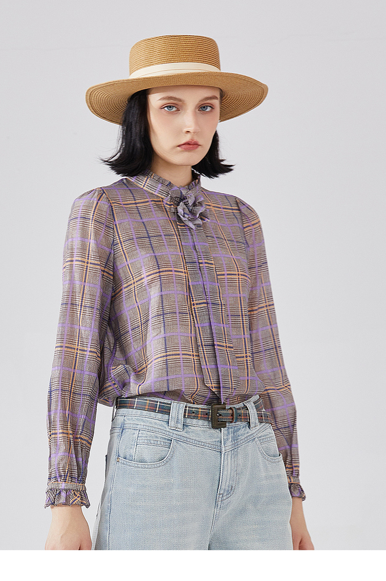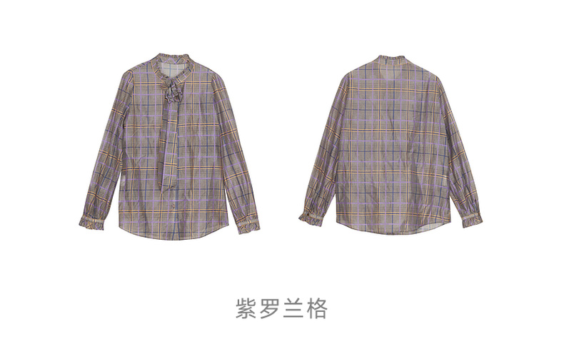 谜底紫罗兰格子衬衫长袖女2024春款设计感领结亲肤衬衣241MC0070