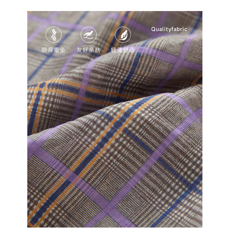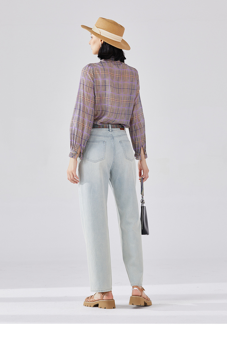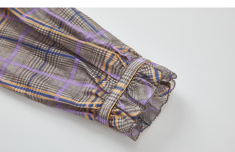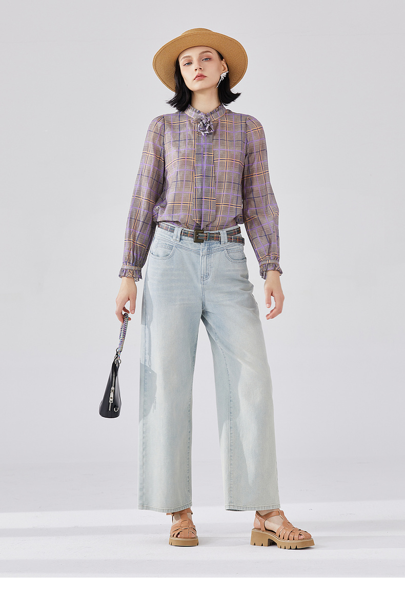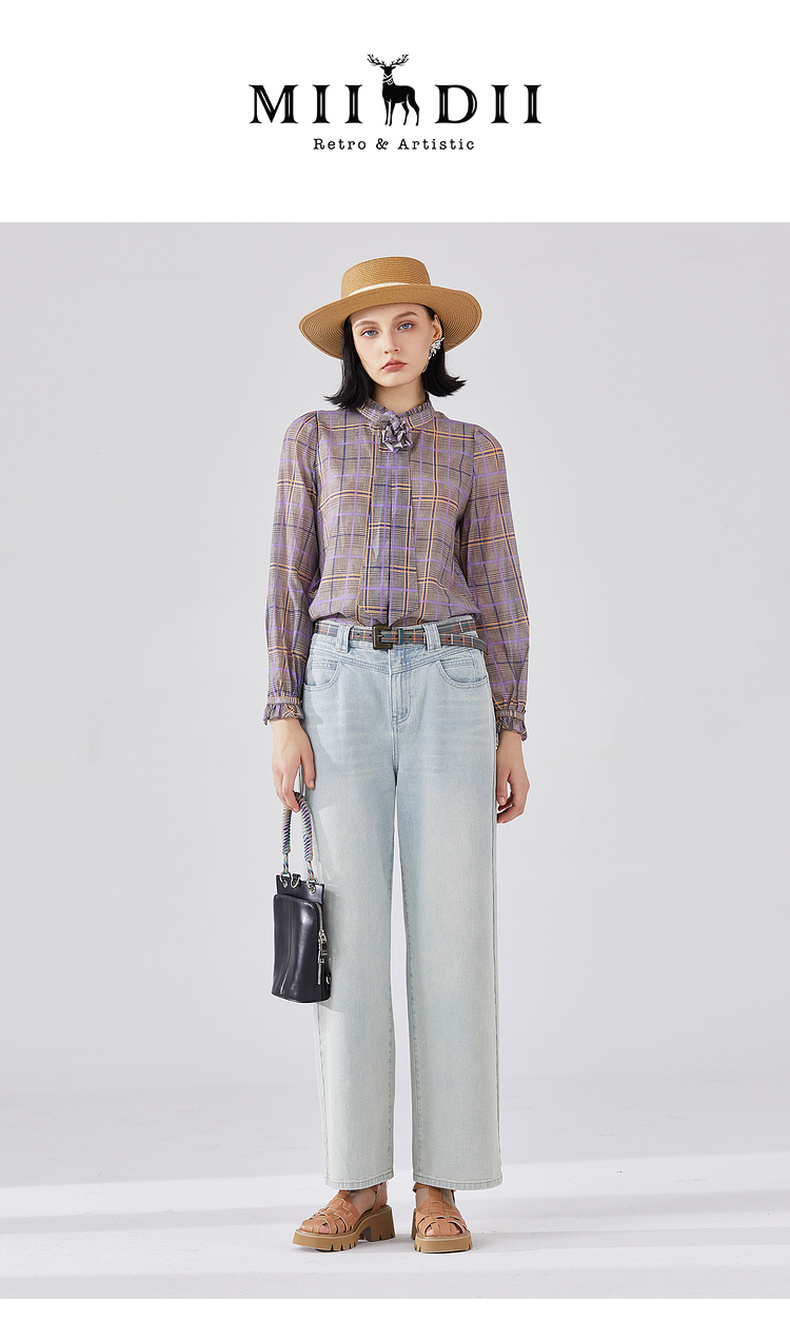 谜底紫罗兰格子衬衫长袖女2024春款设计感领结亲肤衬衣241MC0070