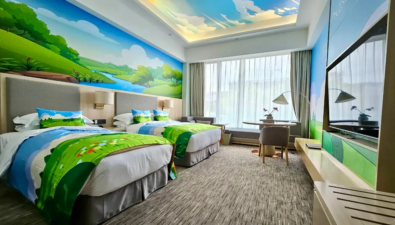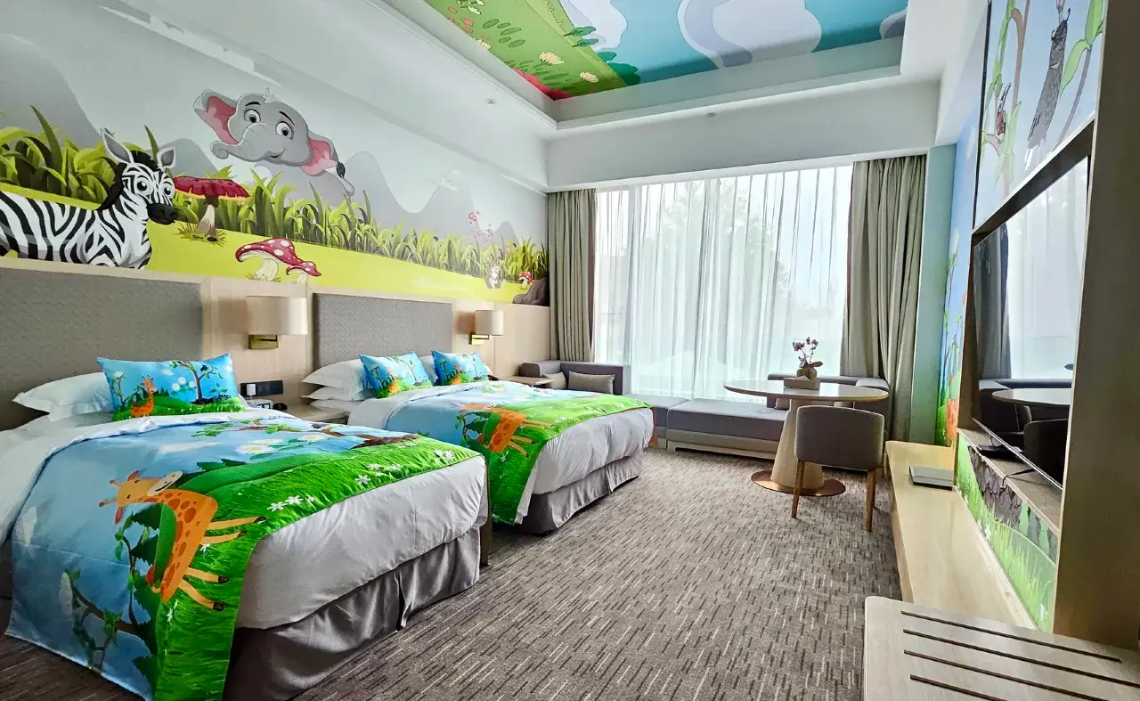 1、入住期间至多含2大2小早餐(儿童 1.2 米以下免费) (1)早餐时间:07:30-09:00 (2)早餐形式:自助早餐 (3)超出人数或者儿童超出身高加收标准:1.2 米以下儿童免费,1.2 米-1.4 米儿童 30 元 /人,1.4 米以上儿童与成人同价 68 元/人 2、入住期间至多含2大2小温泉(儿童 1.4 米以下免票)含简餐 (1)营业时间:10:00-22:00 (2)超出人数或者儿童超出身高限制加收标准:儿童 1.4 米以上同成人补差 88 元/位 (补差后享受温泉区小食坊的简餐待遇) (3)入住期间凭房卡可在温泉营业时间内无限次进出温泉区域;离店当天 12:00 退房前进入温泉的客人,可以畅玩至当天营业时间结束 (4)进入温泉区域的客户,可在温泉区小食坊免费享用简餐,具体供应餐品以酒店当日公示为准(午餐时间:11:00-13:00,晚餐时间:17:30-20:00) 3、入住期间至多含2大2小游泳(儿童 1.4 米以下免票) (1)营业时间:11:00-22:00 (2)超出人数或者儿童超出身高限制加收标准:1.4米以下免票,超出身高按成人补79元/位。 (3) 入住期间住店客人可无限次使用国标级恒温游泳馆(50米*25米,温泉水约30度),需自带泳帽,否则谢绝入水。 4、 入住期间无限次出入萌宠乐园 (1)住店客人可以免费无限次进入萌宠乐园,不限制儿童身高 5、南山苑多主题亲子房、南山苑上下铺亲子房周内(周日-周四入住)加送 199 午餐/晚餐 1 次 (午餐、晚餐 2 选 1) (1)东沁苑餐厅营业时间: