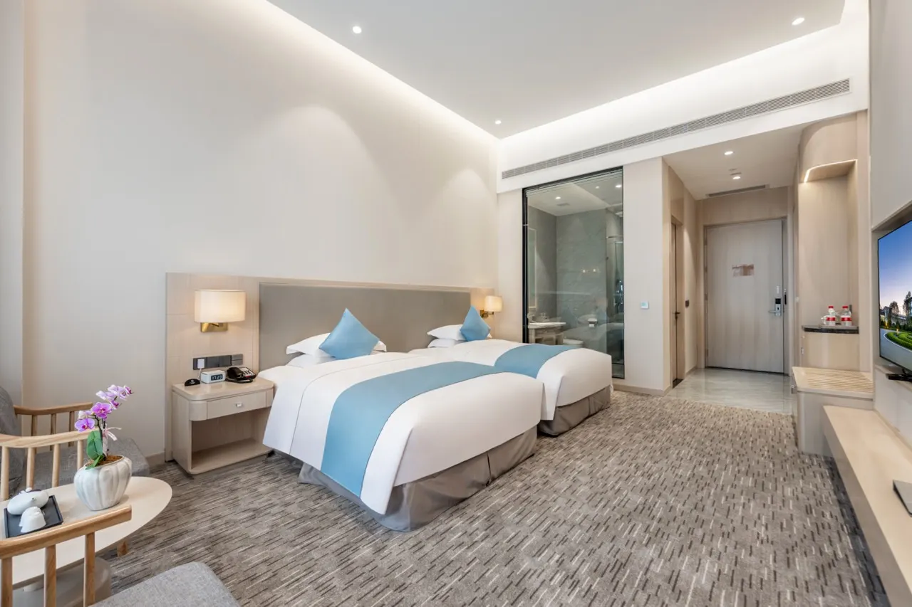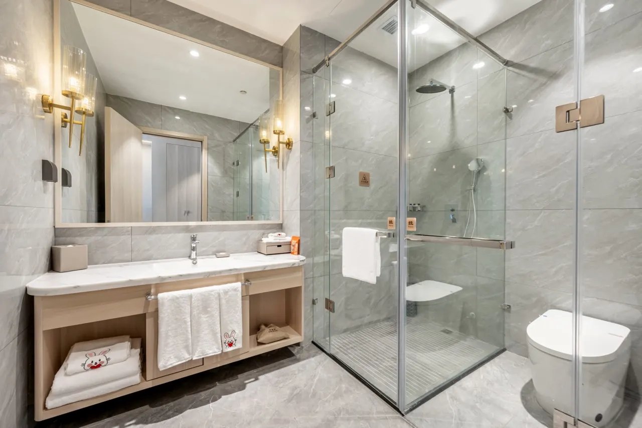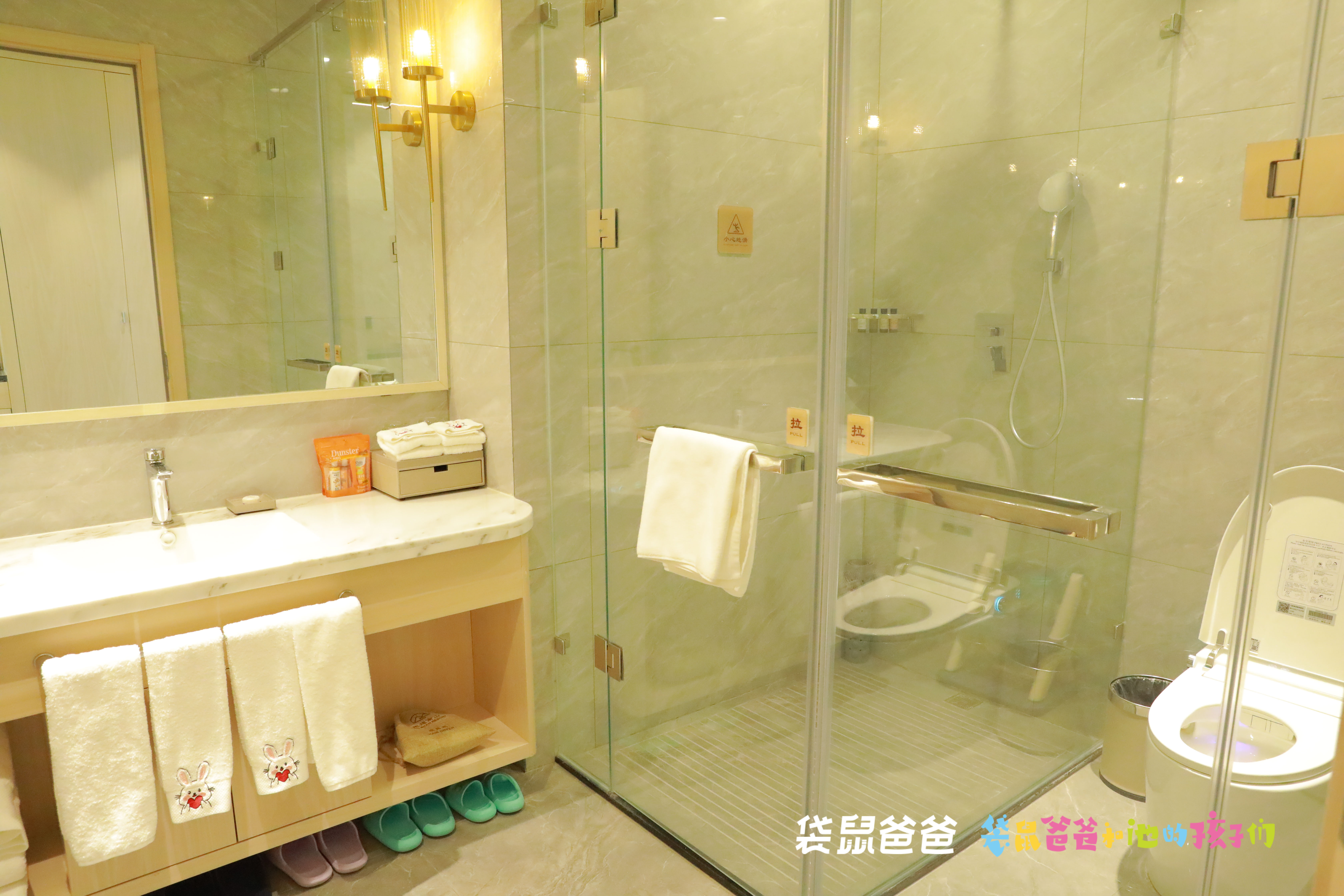 袋鼠爸爸担心大家节假日预定不上南山苑的房型,这次还给大家争取了东升苑商务客房,距离温泉的位置比南山苑相对远一些,步行预计3、4分钟。商务客房布局相对紧凑,设施设计偏商务风格,但也干净整洁。标间的床是1.2米的,如果想要性价比高的话,也可以选择。