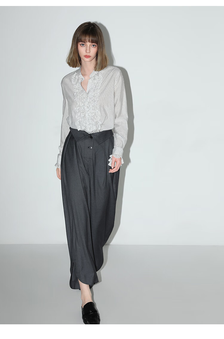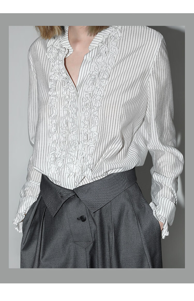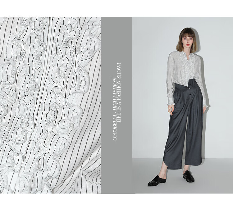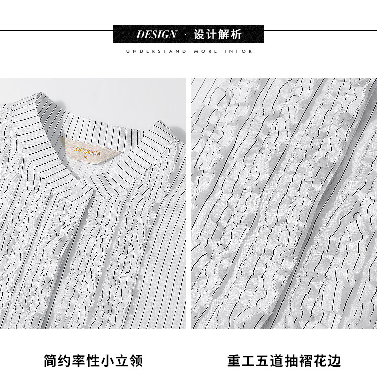 【限时秒杀】COCOBELLA重工立体木耳边立领条纹衬衫早秋花苞袖衬衣SR3033