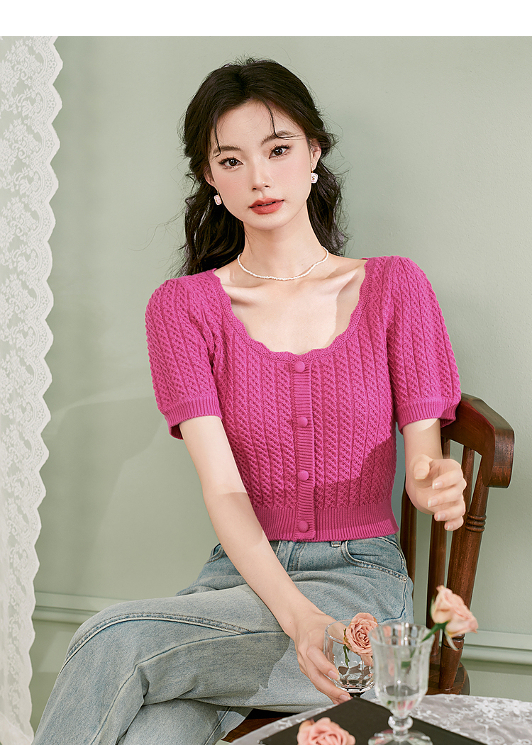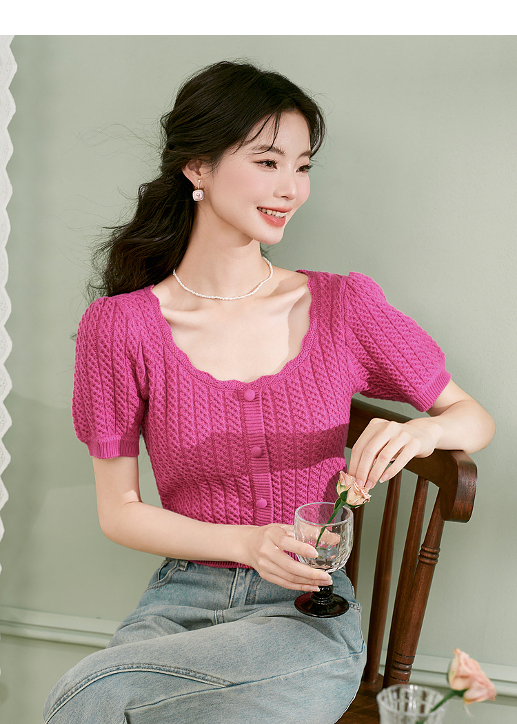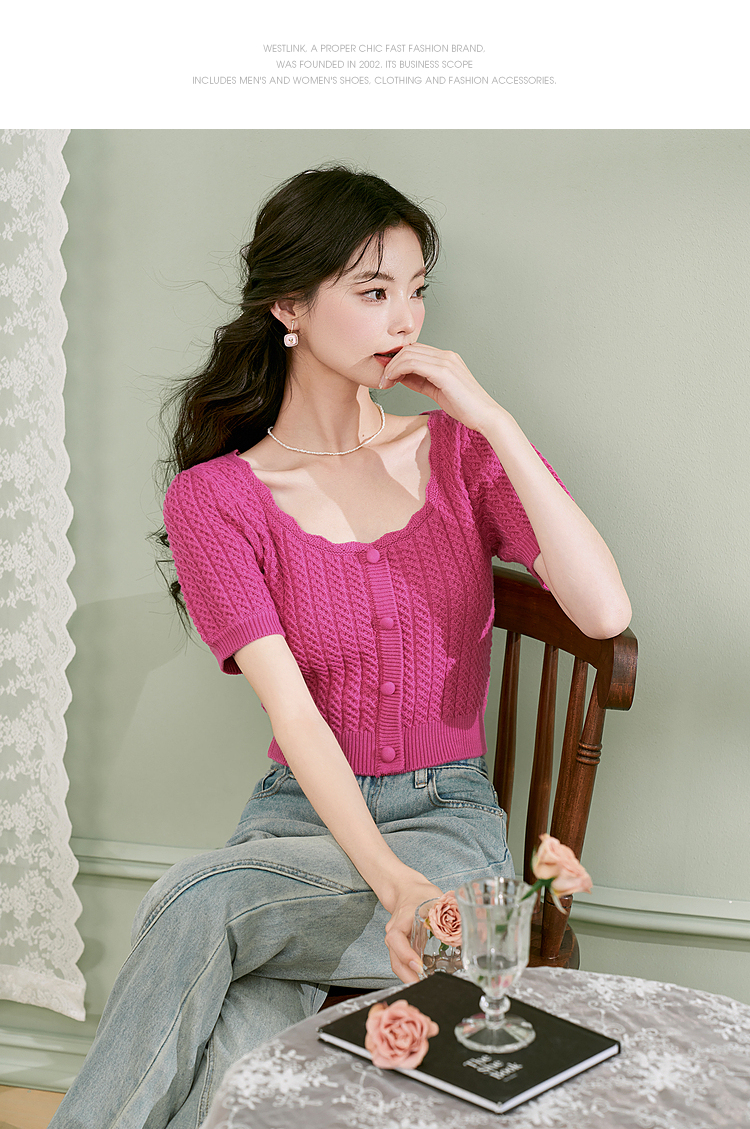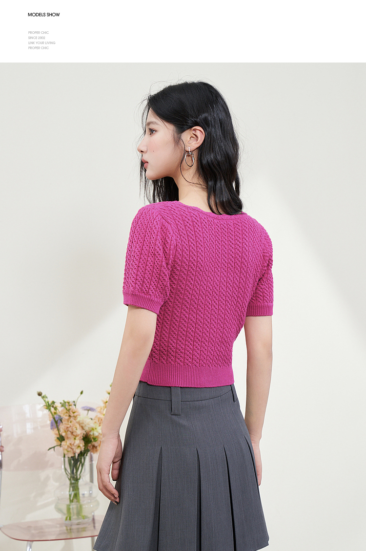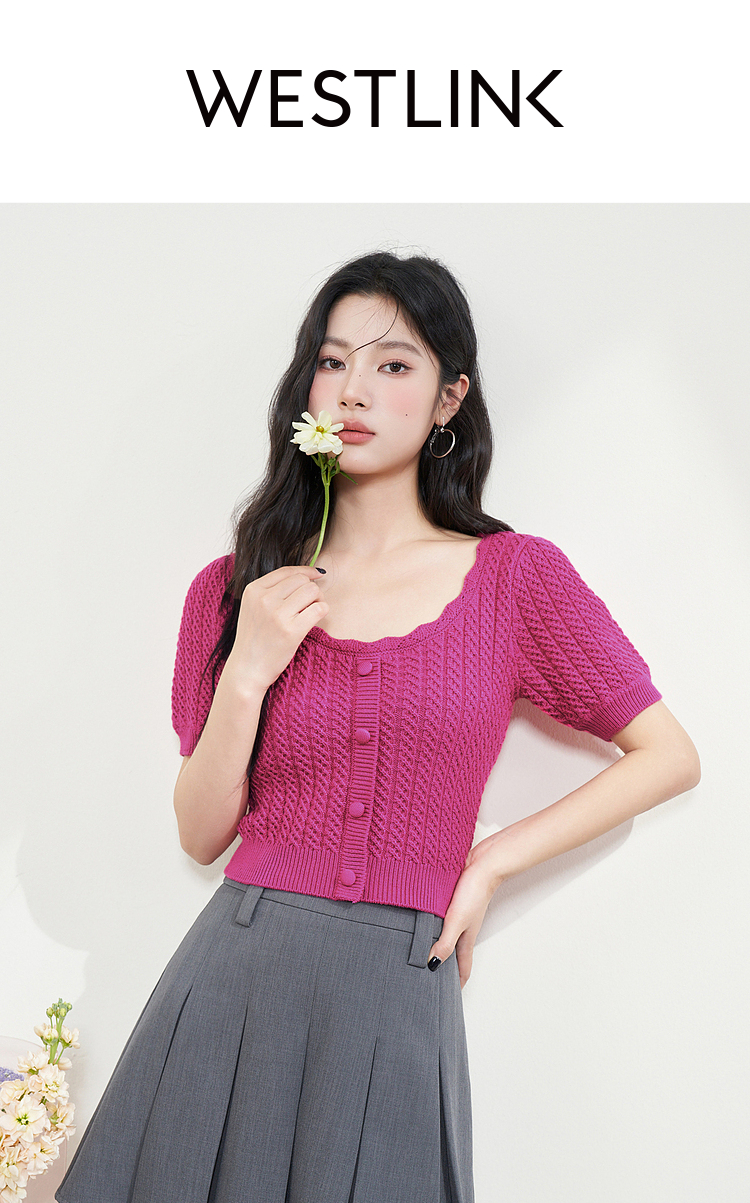 西遇韩式休闲短袖针织衫女夏新款薄款方领设计合体修身简约V0050556