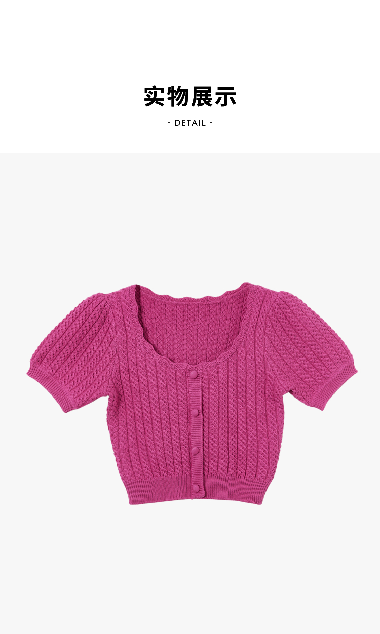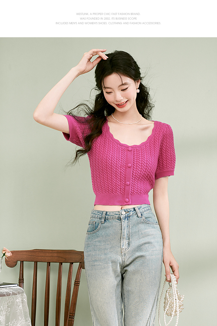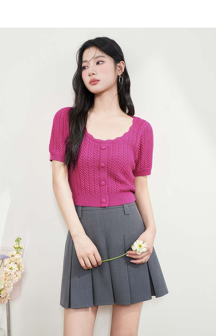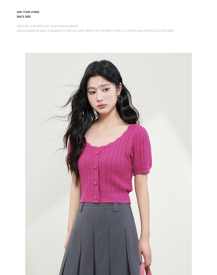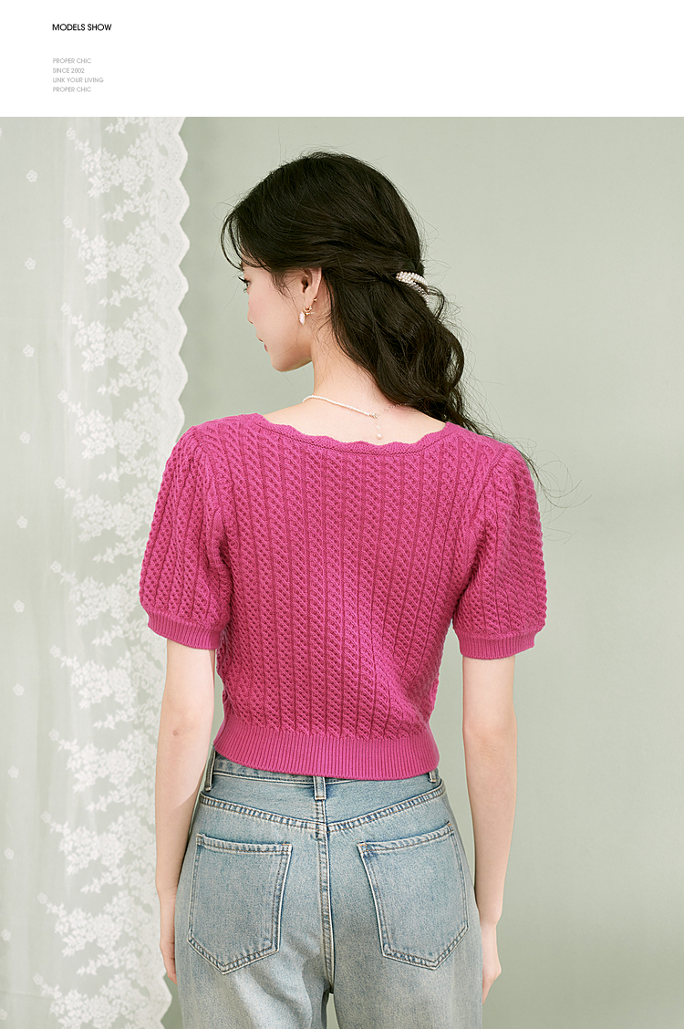 西遇韩式休闲短袖针织衫女夏新款薄款方领设计合体修身简约V0050556