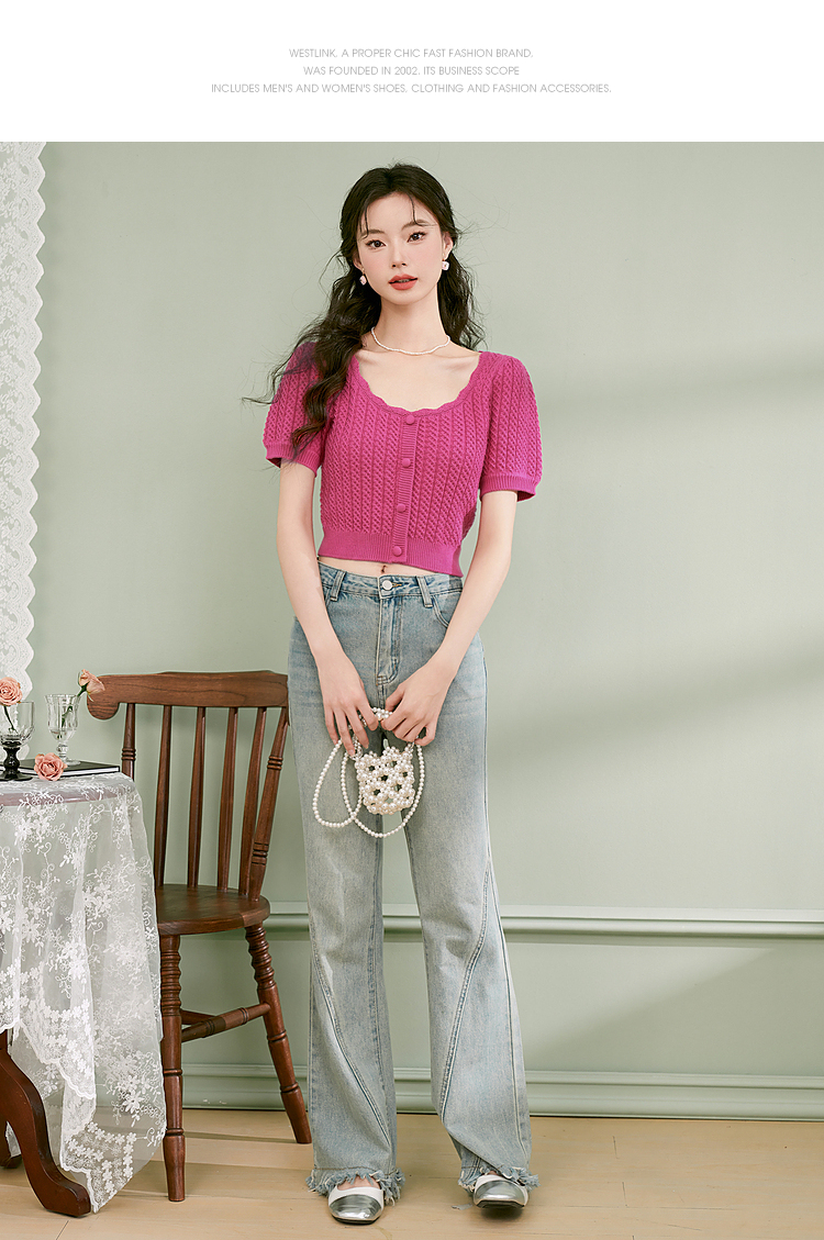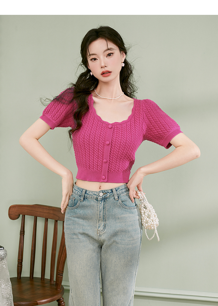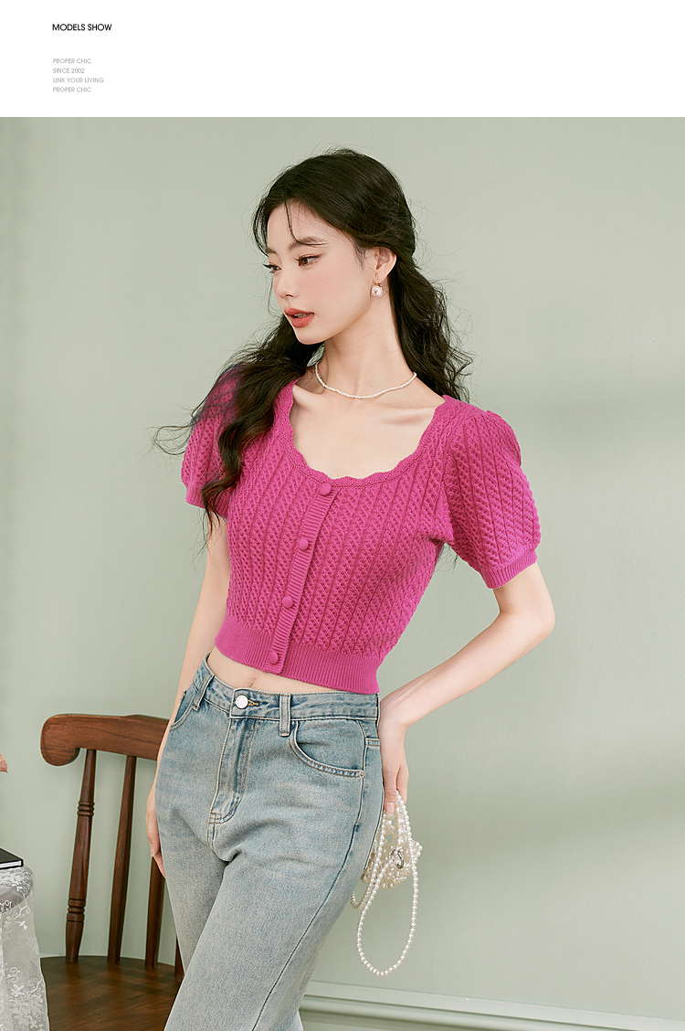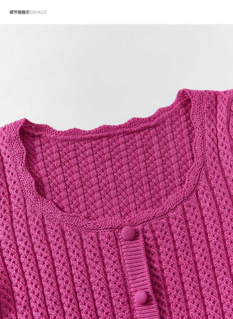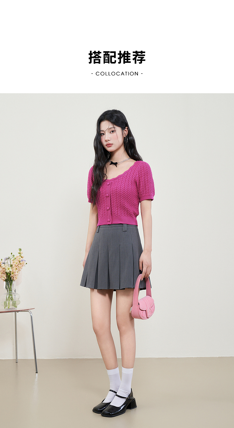 西遇韩式休闲短袖针织衫女夏新款薄款方领设计合体修身简约V0050556