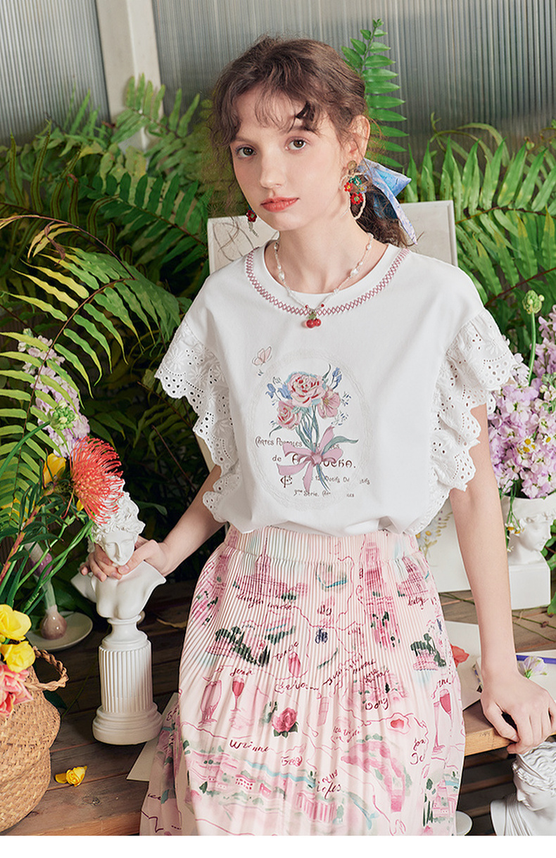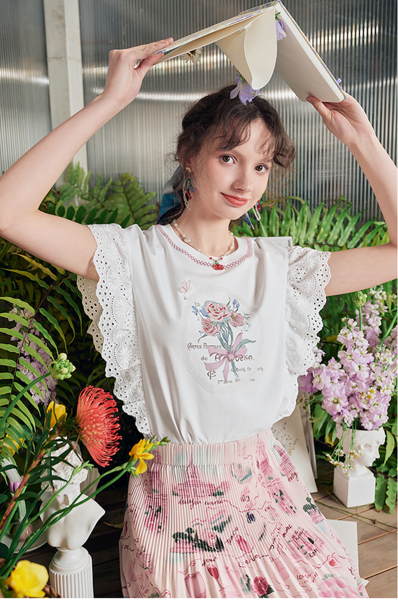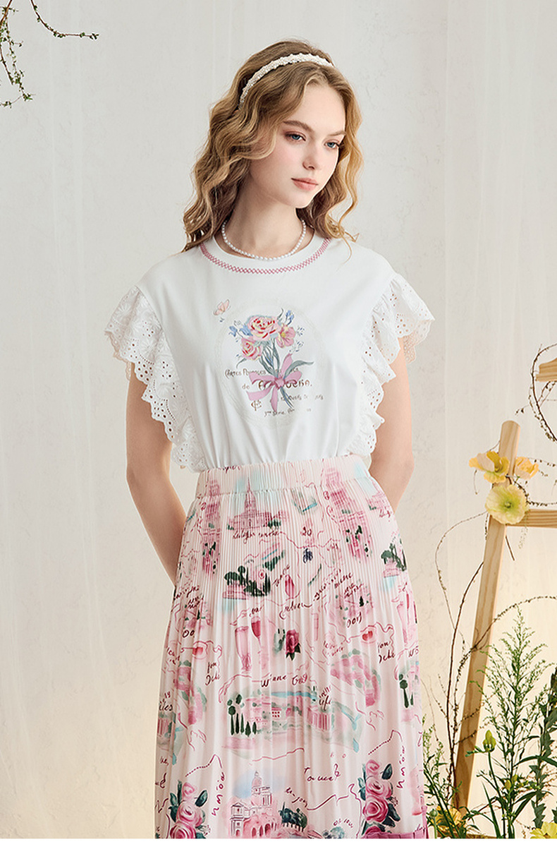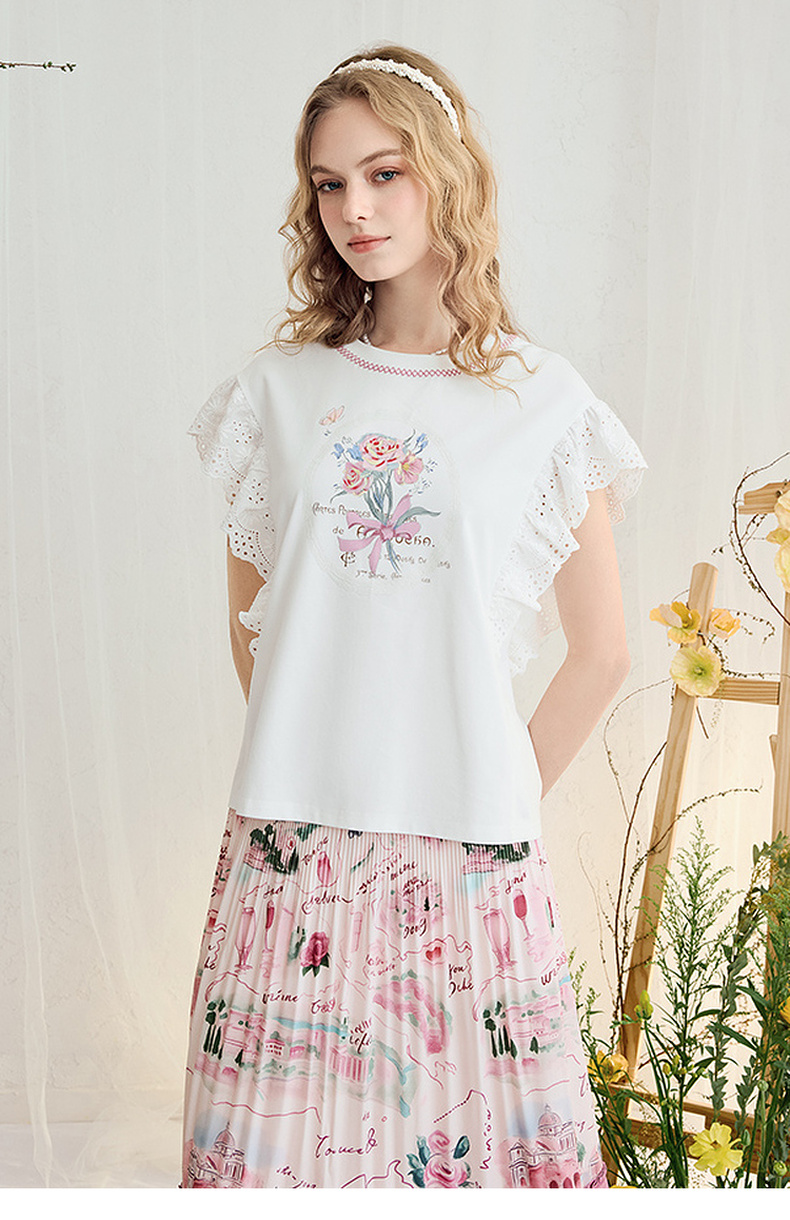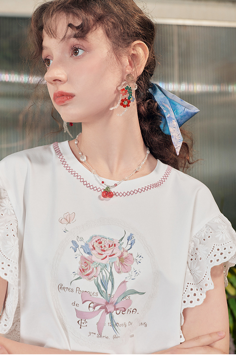 两三事 沁夏花舞 2025夏季新款甜美荷叶边蕾丝拼接印花短袖t恤女