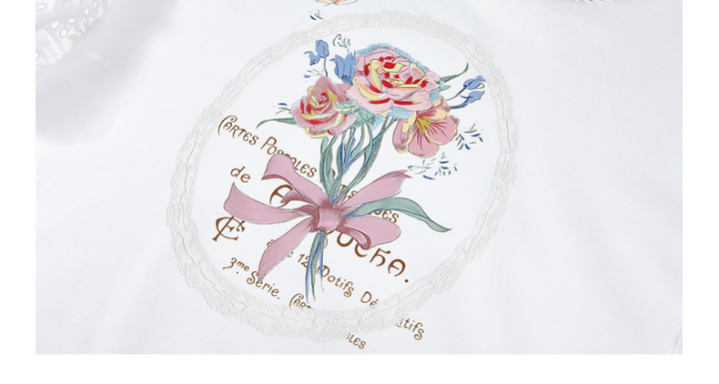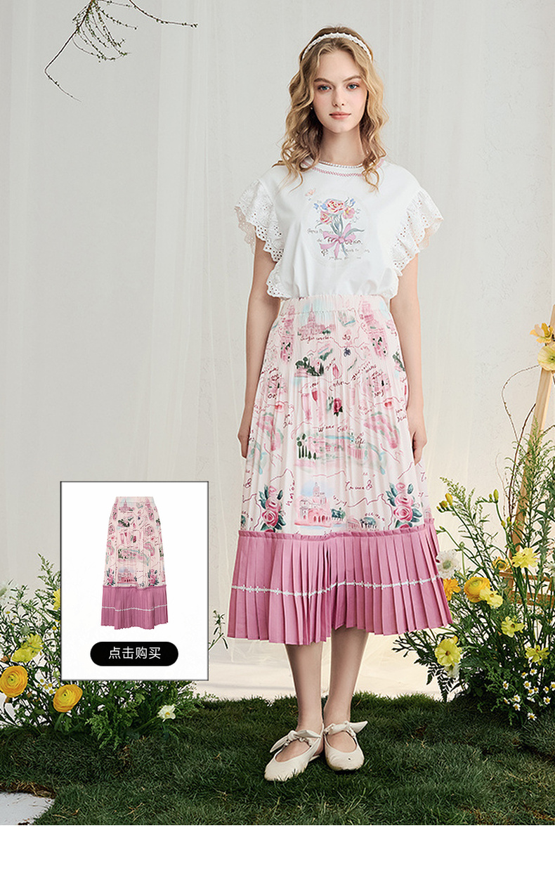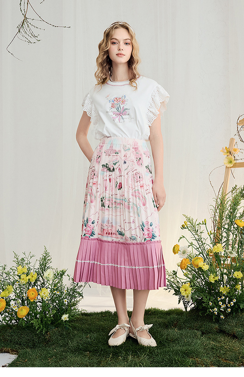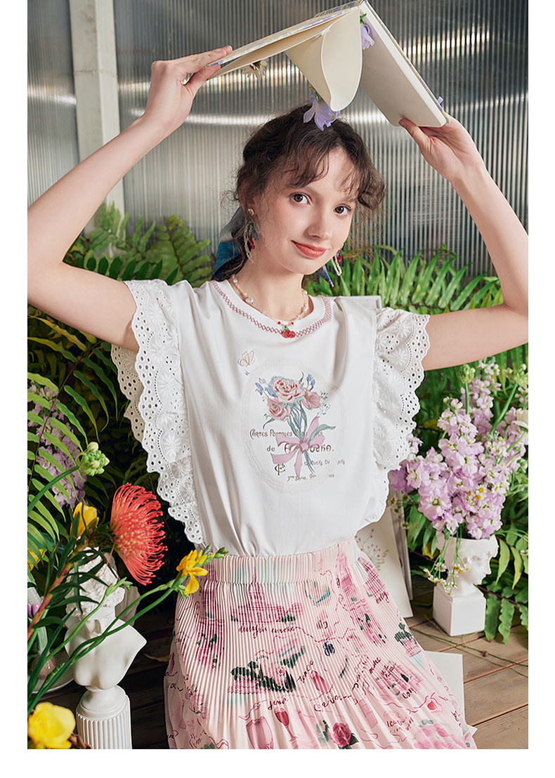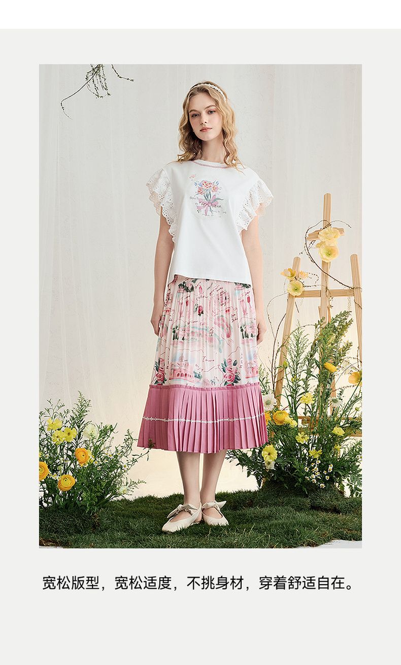 两三事 沁夏花舞 2025夏季新款甜美荷叶边蕾丝拼接印花短袖t恤女