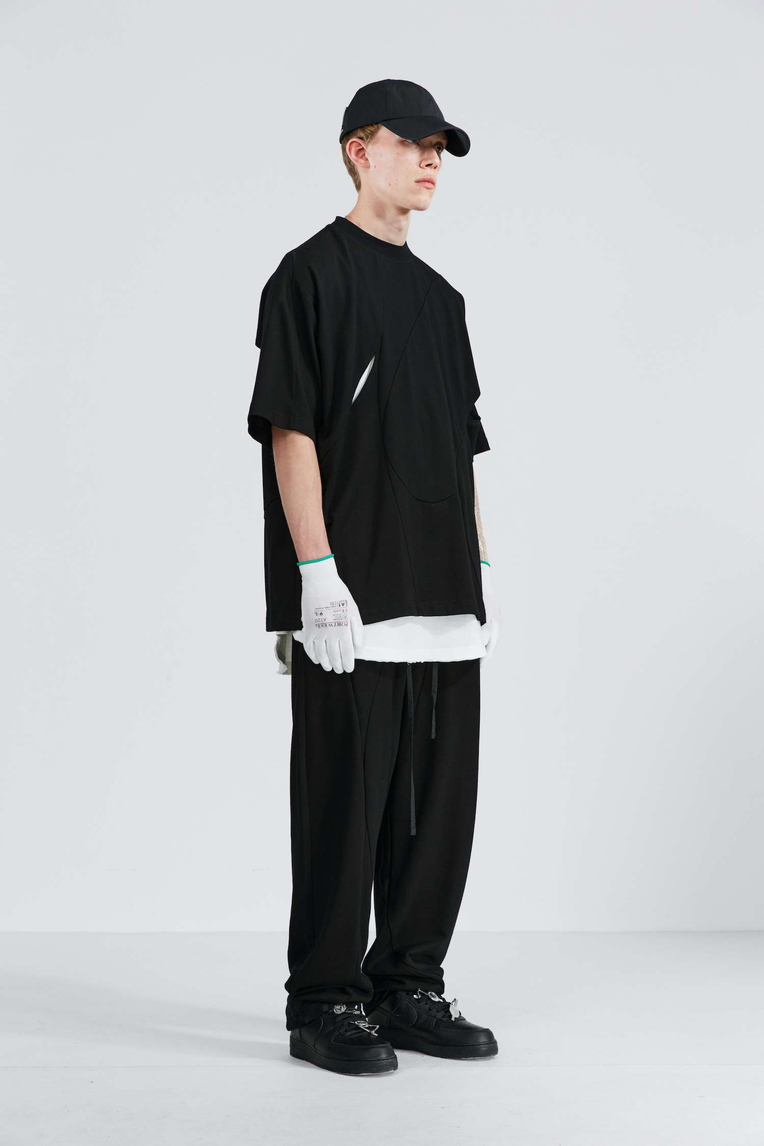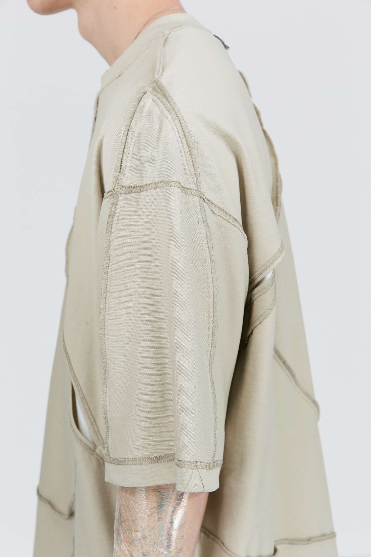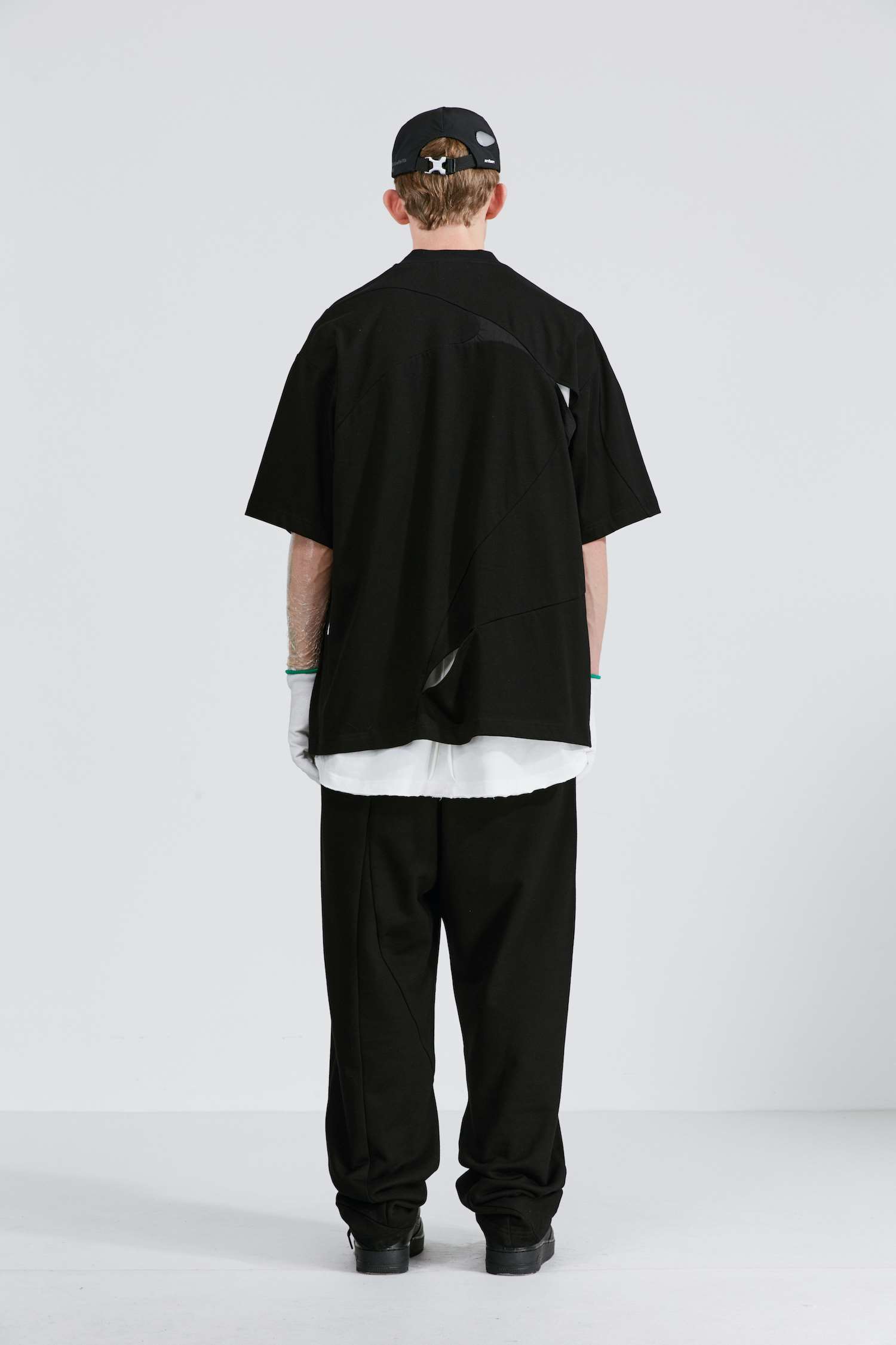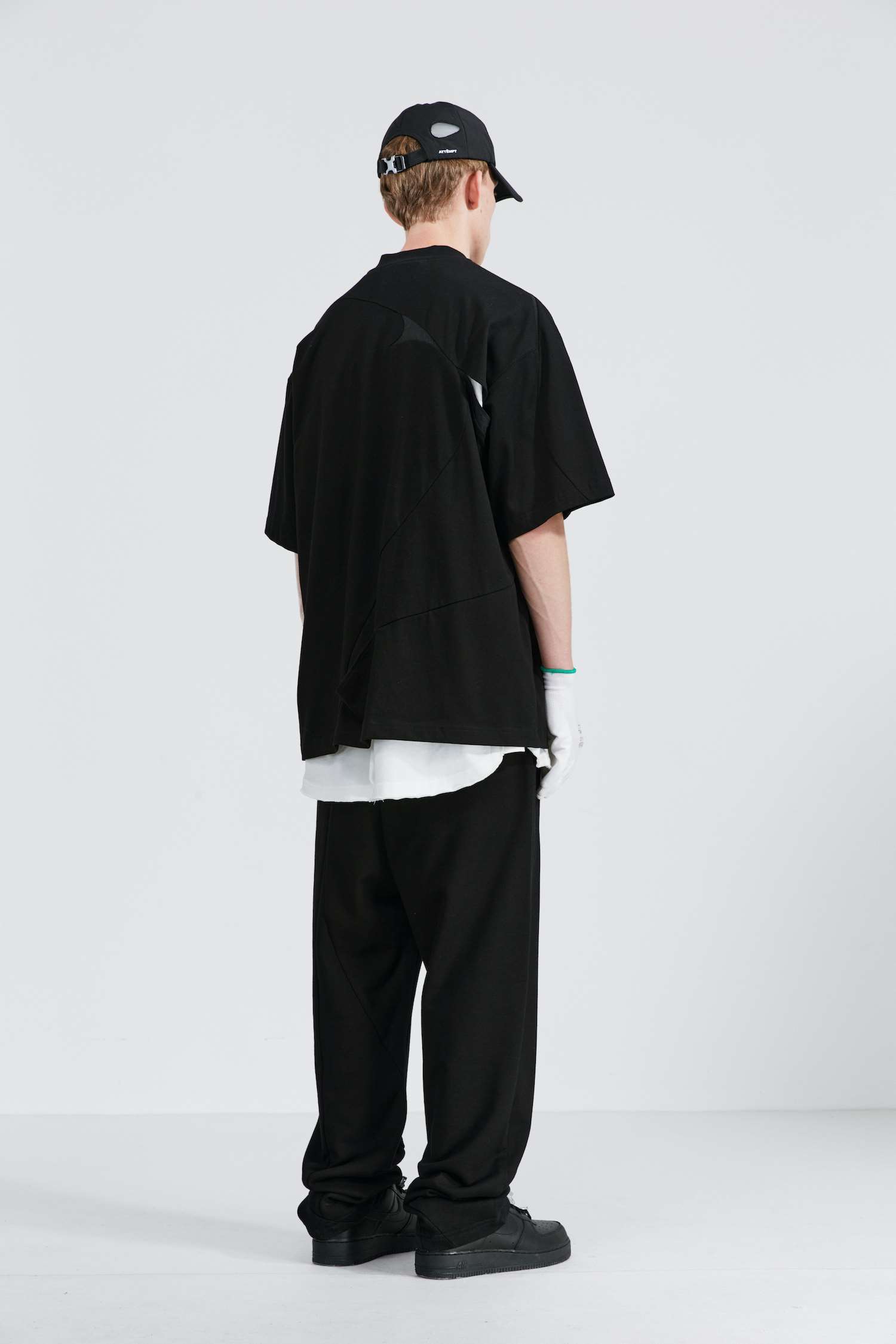 ATTEMPT SS21 弧形拼接镂空双面穿圆领短袖T恤落肩休闲宽松五分袖