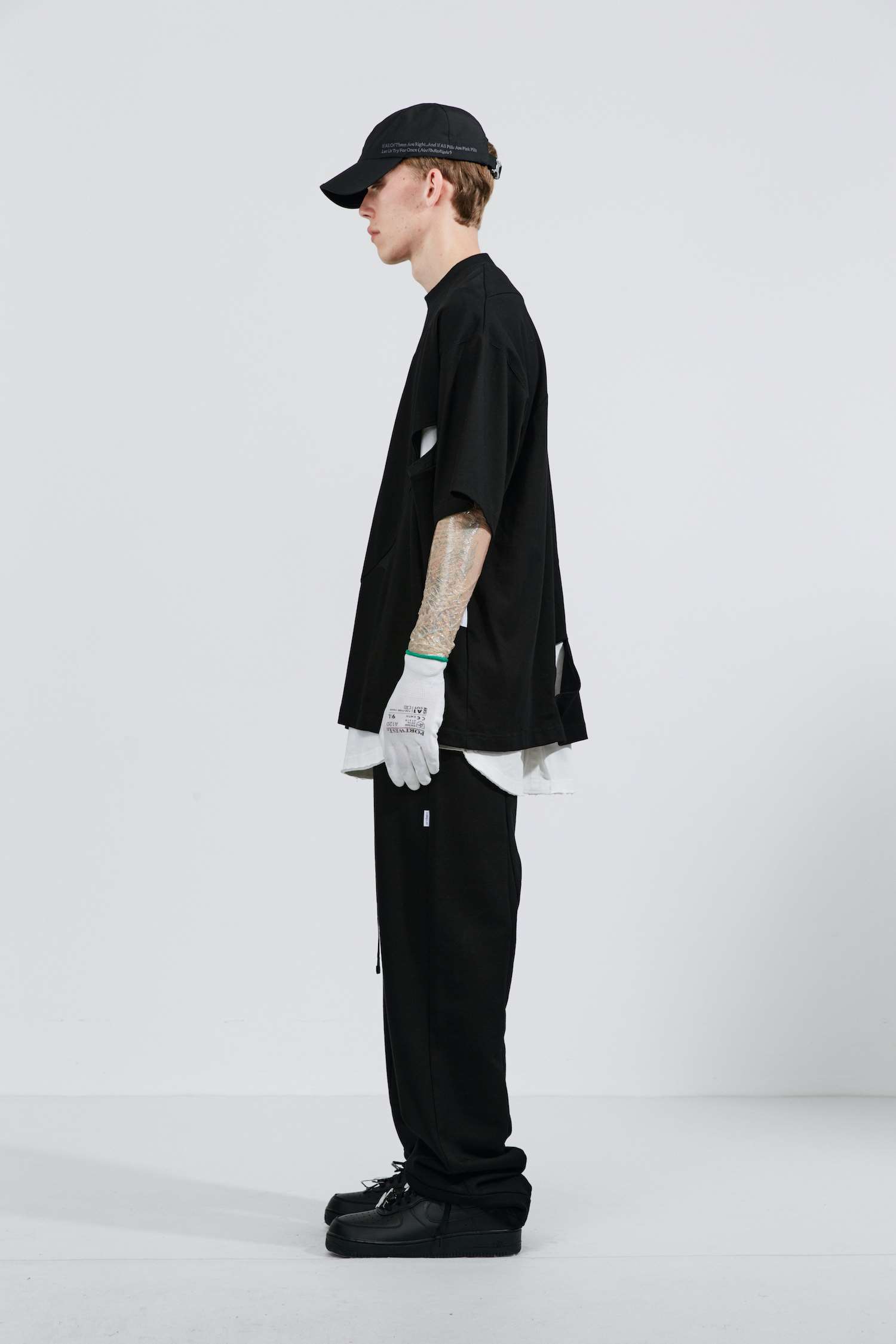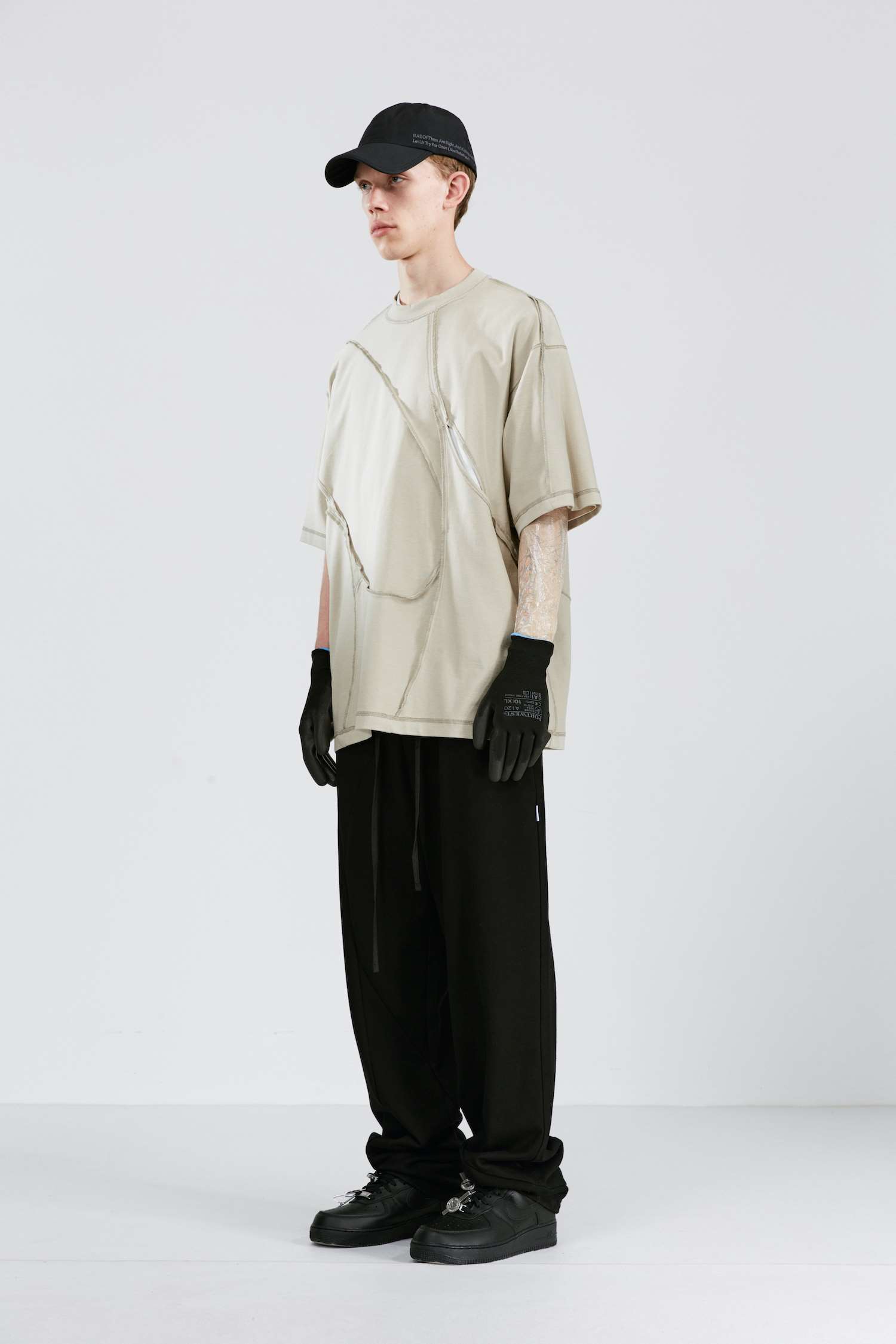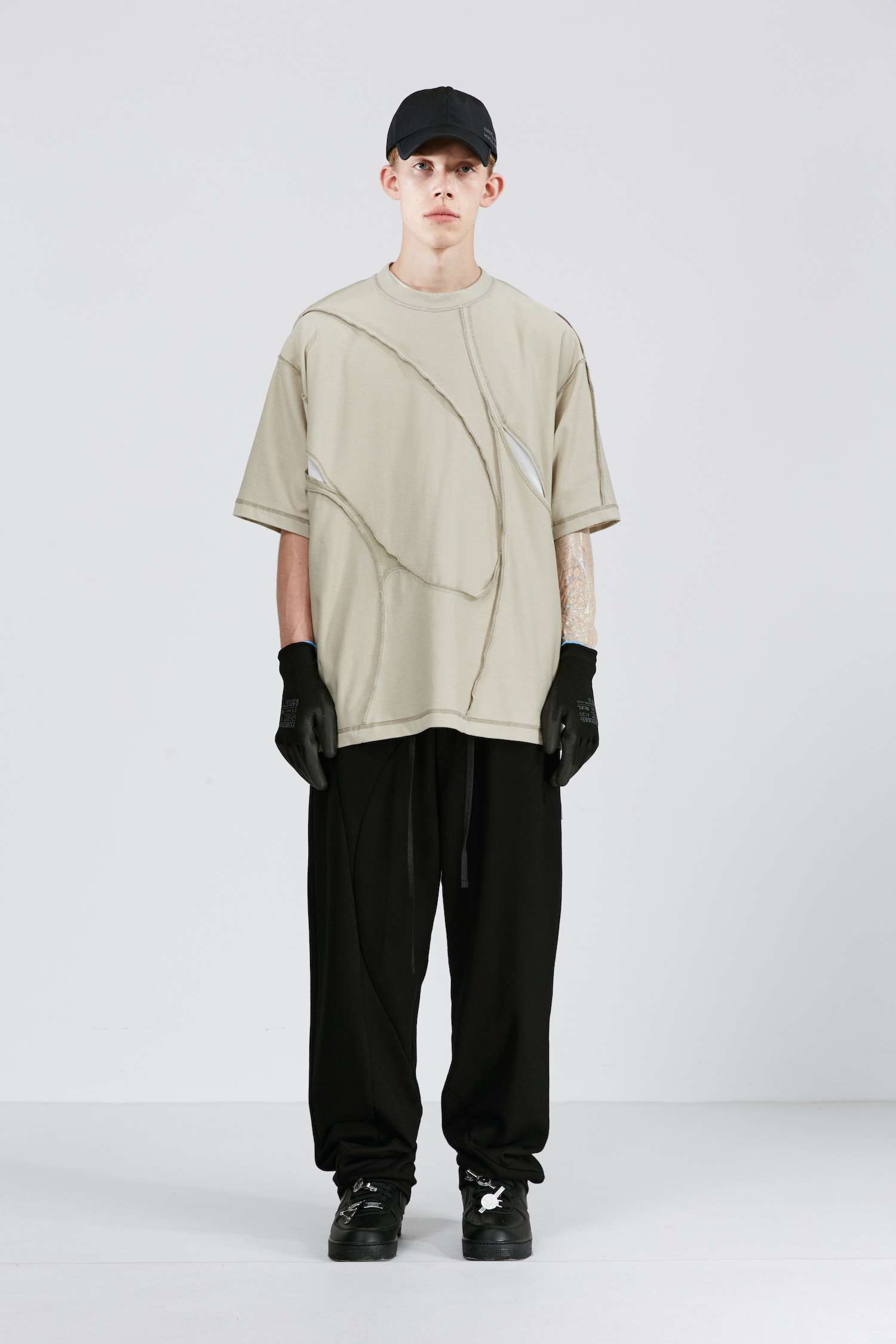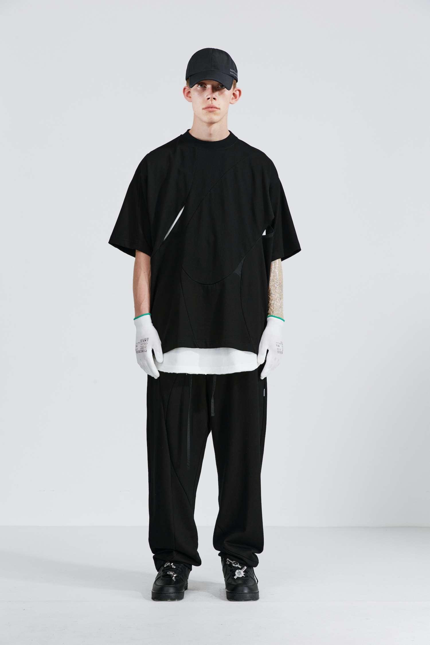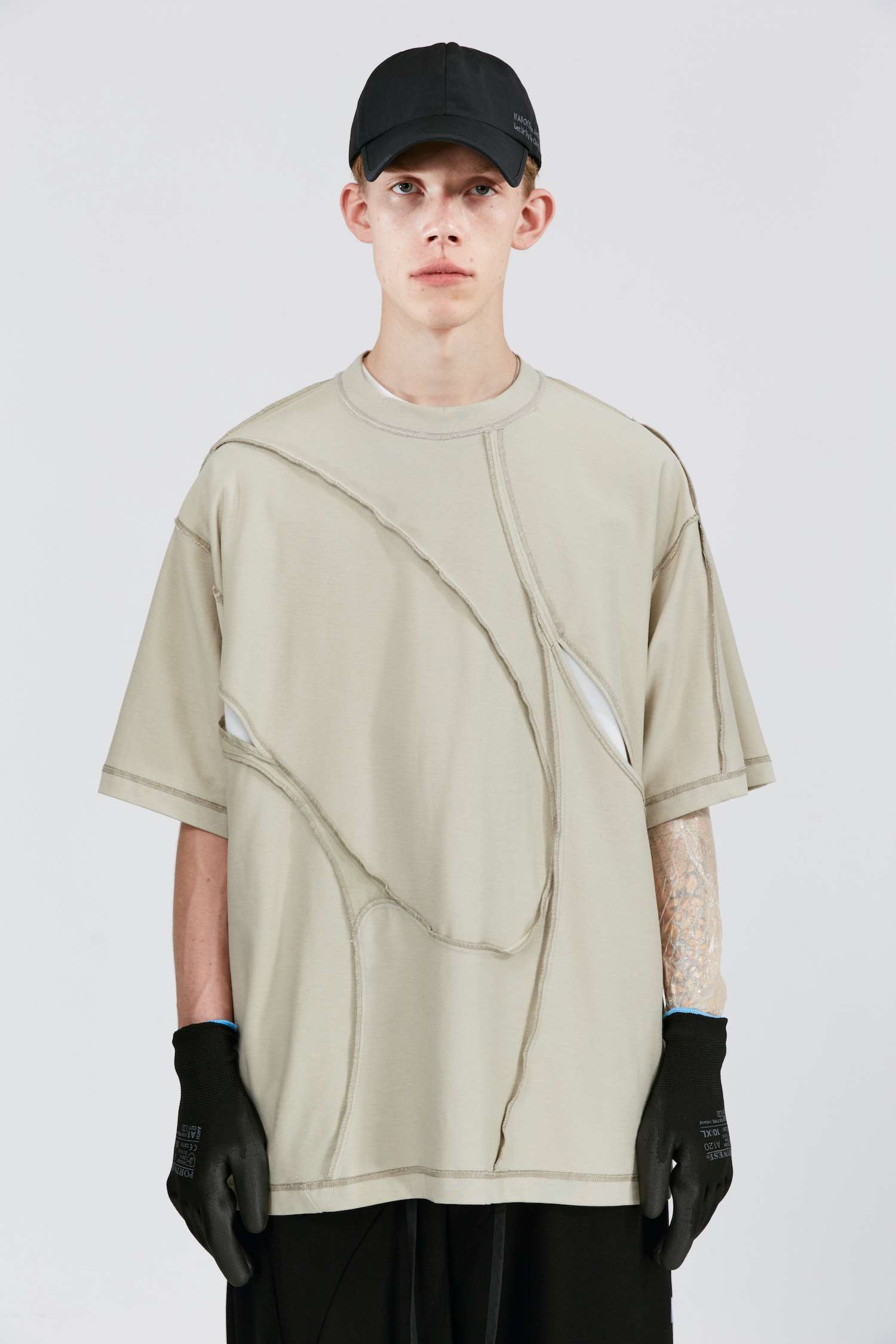 ATTEMPT SS21 弧形拼接镂空双面穿圆领短袖T恤落肩休闲宽松五分袖