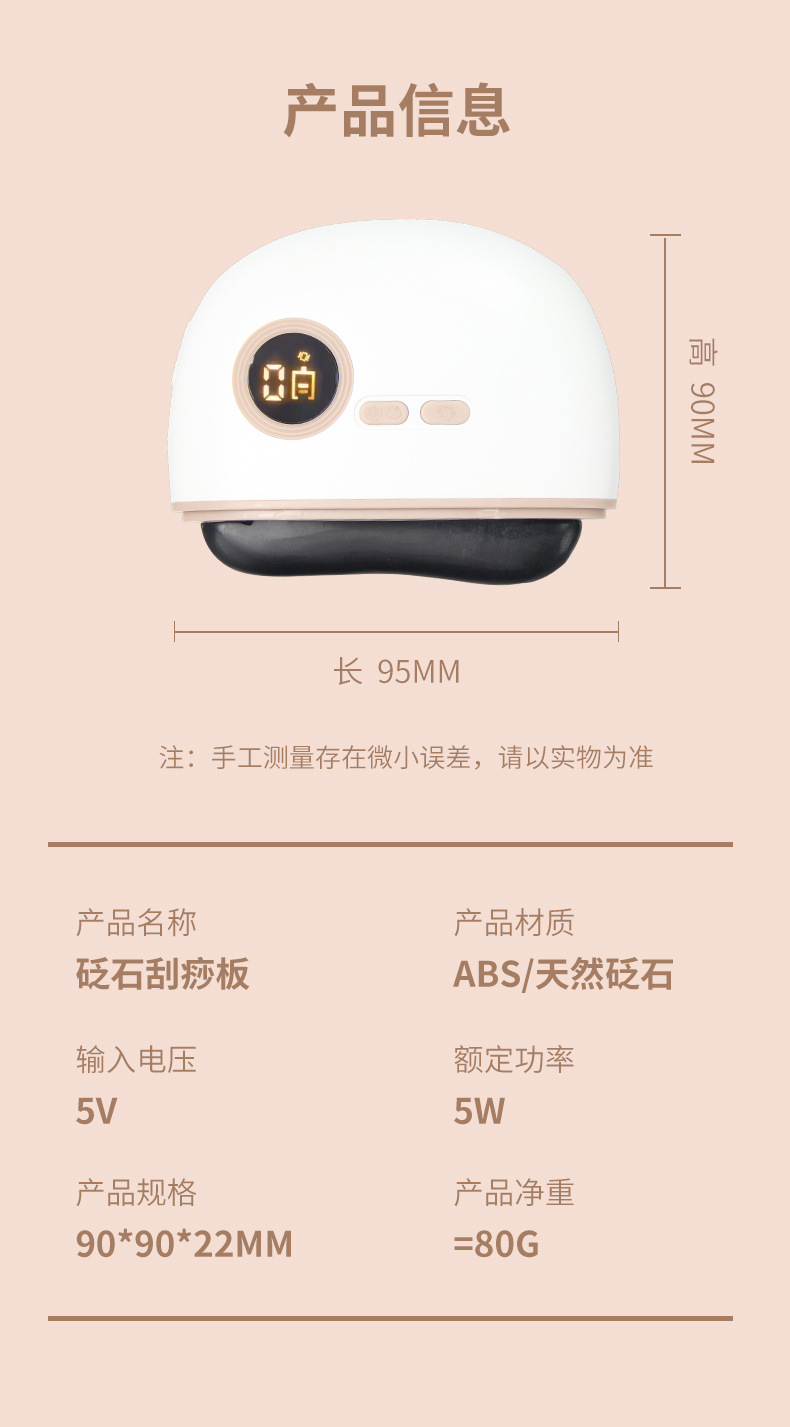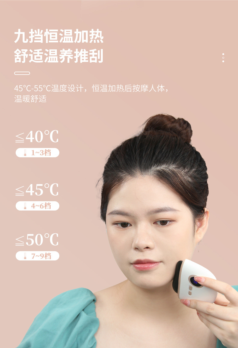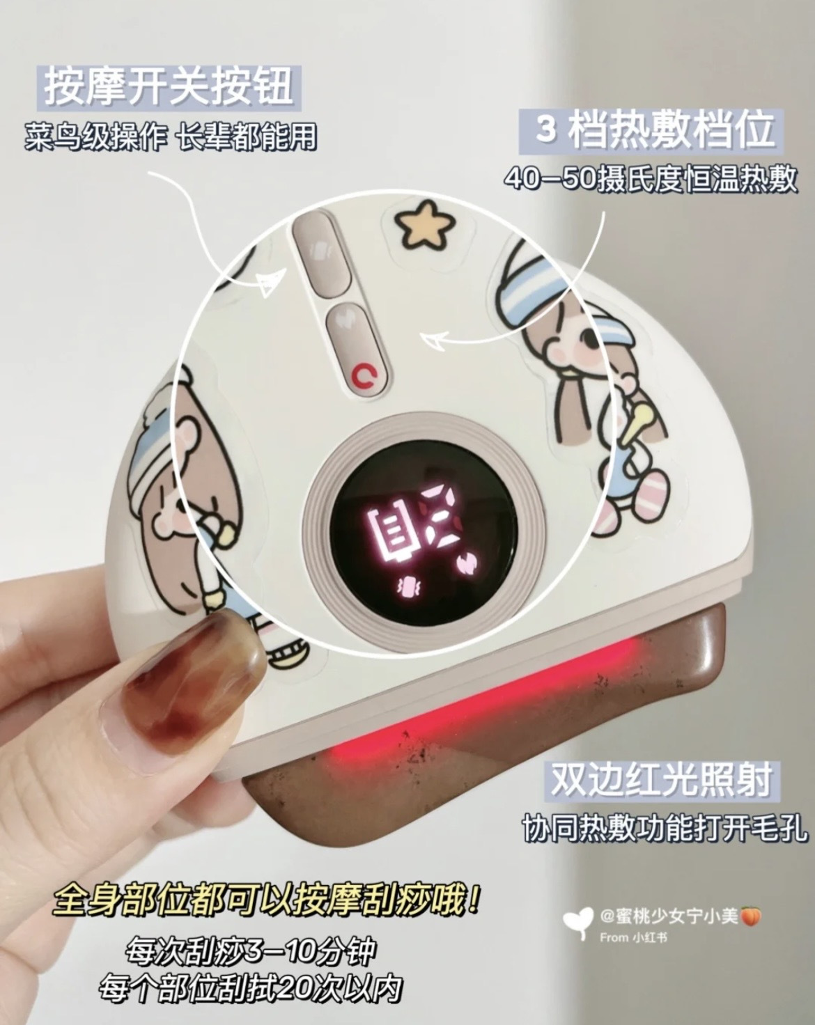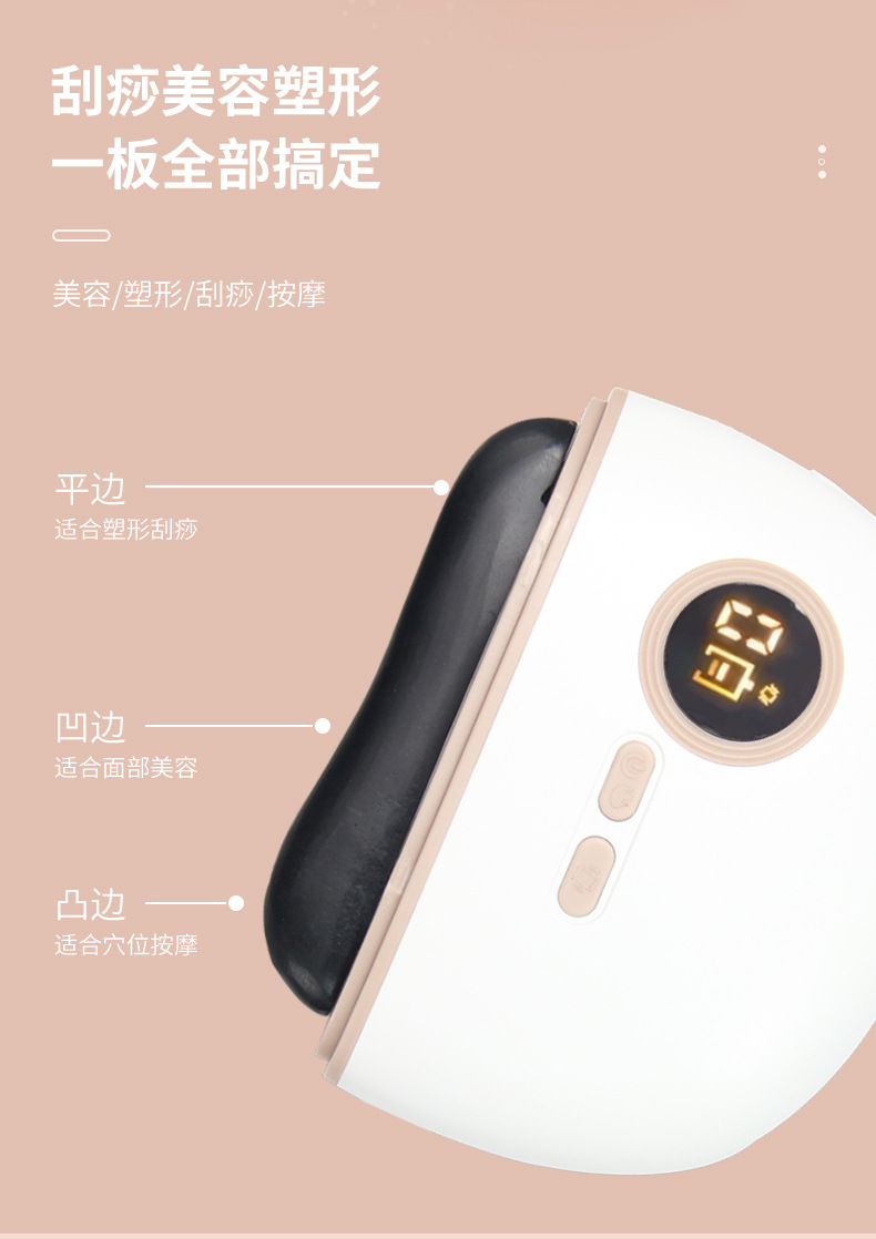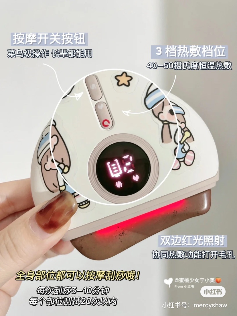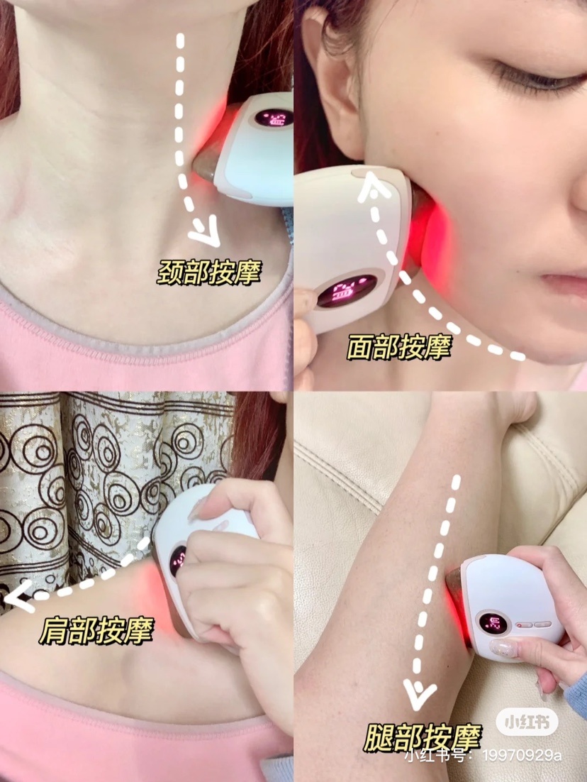 集“加热、振动按摩、推刮、红光”,四大功能为一体。
