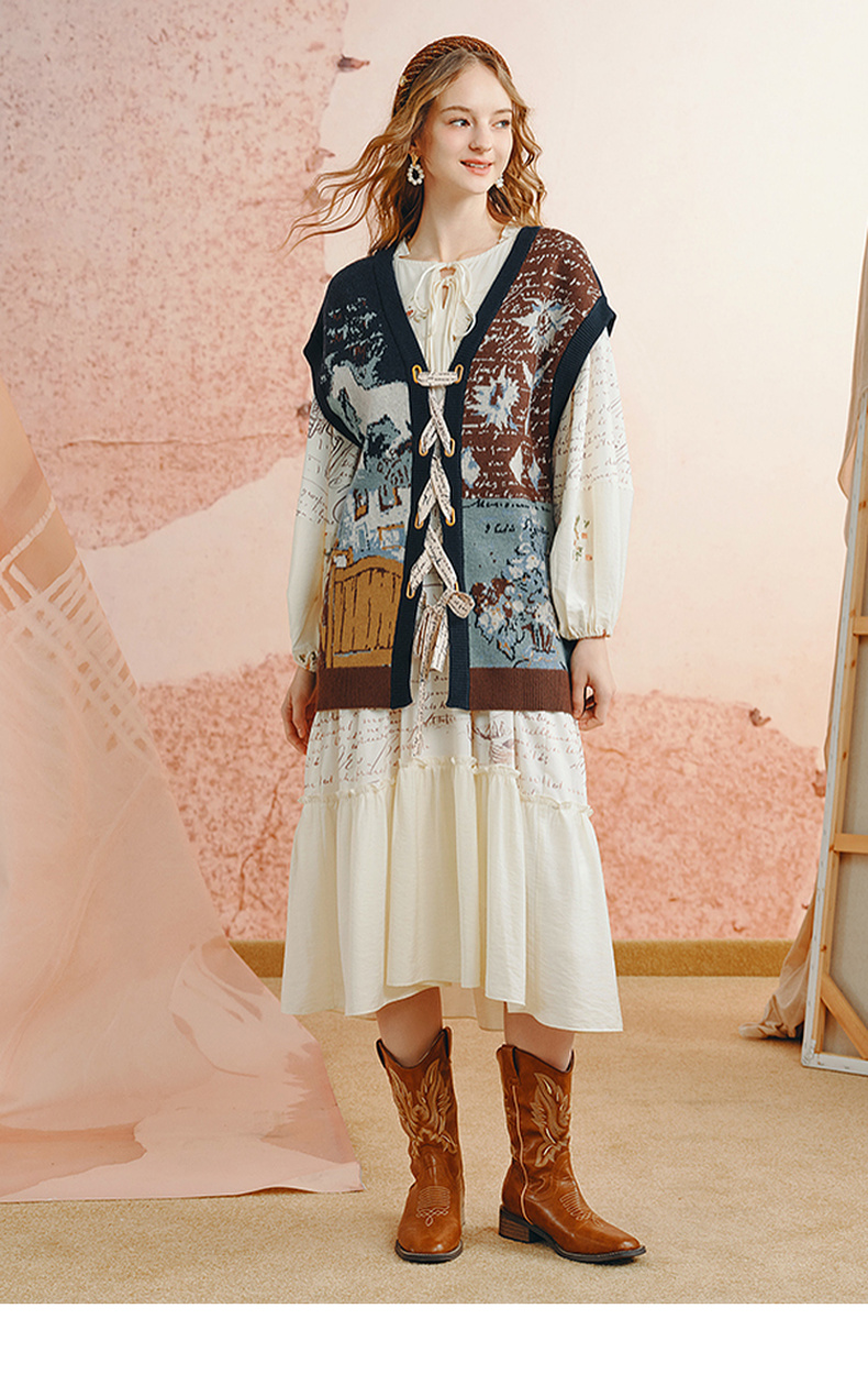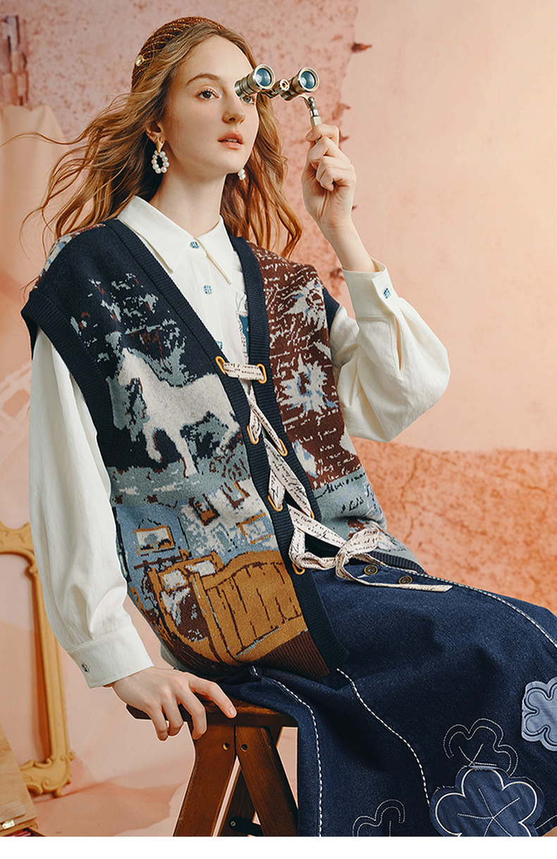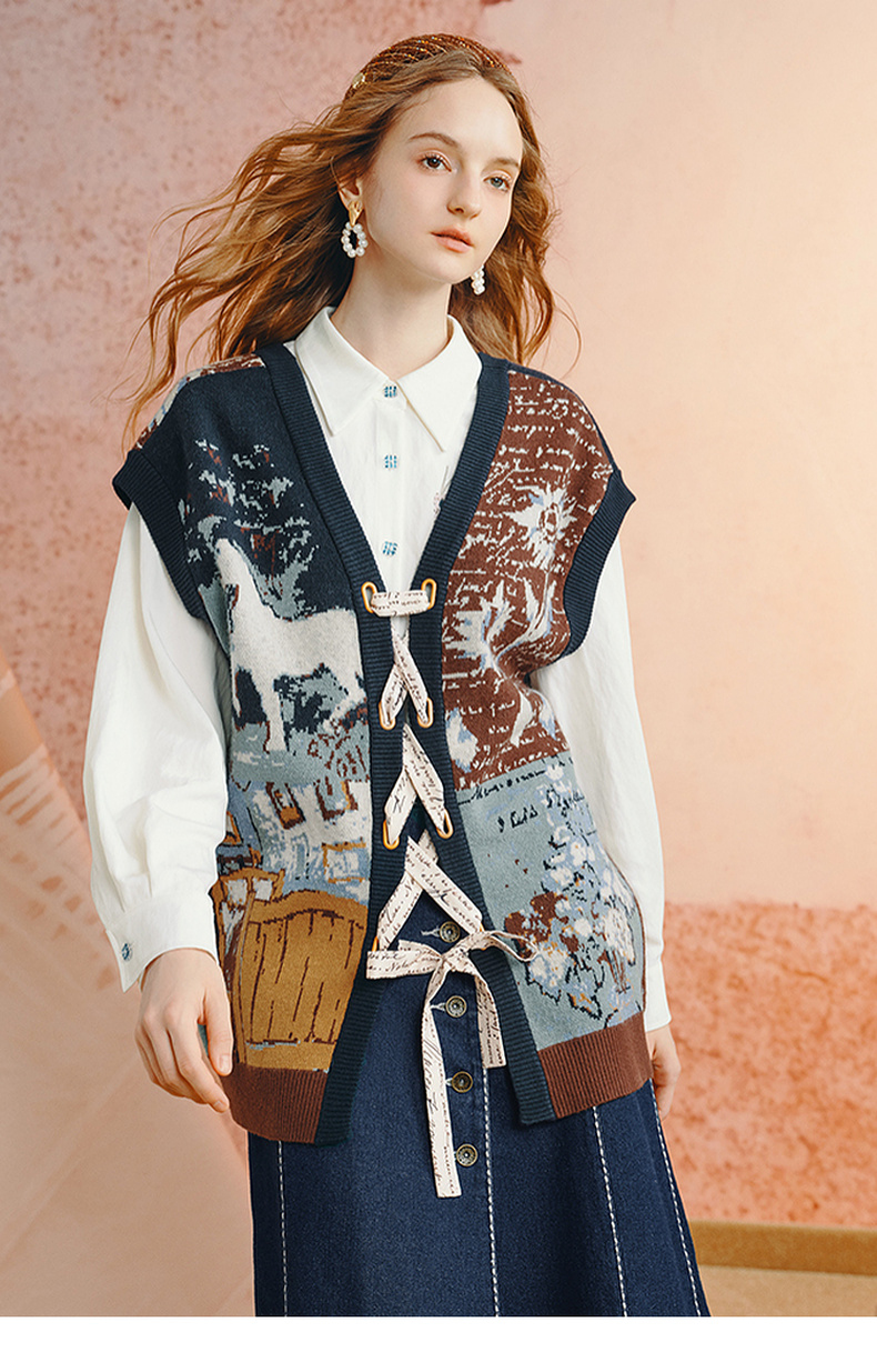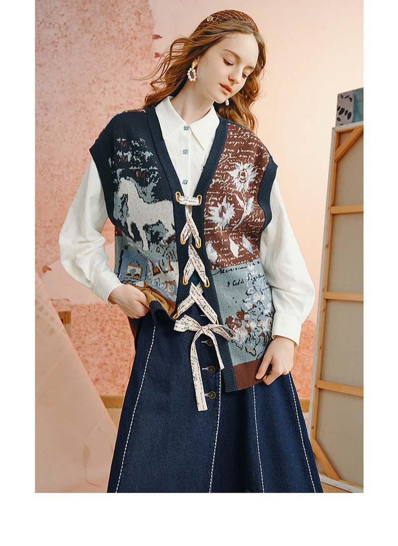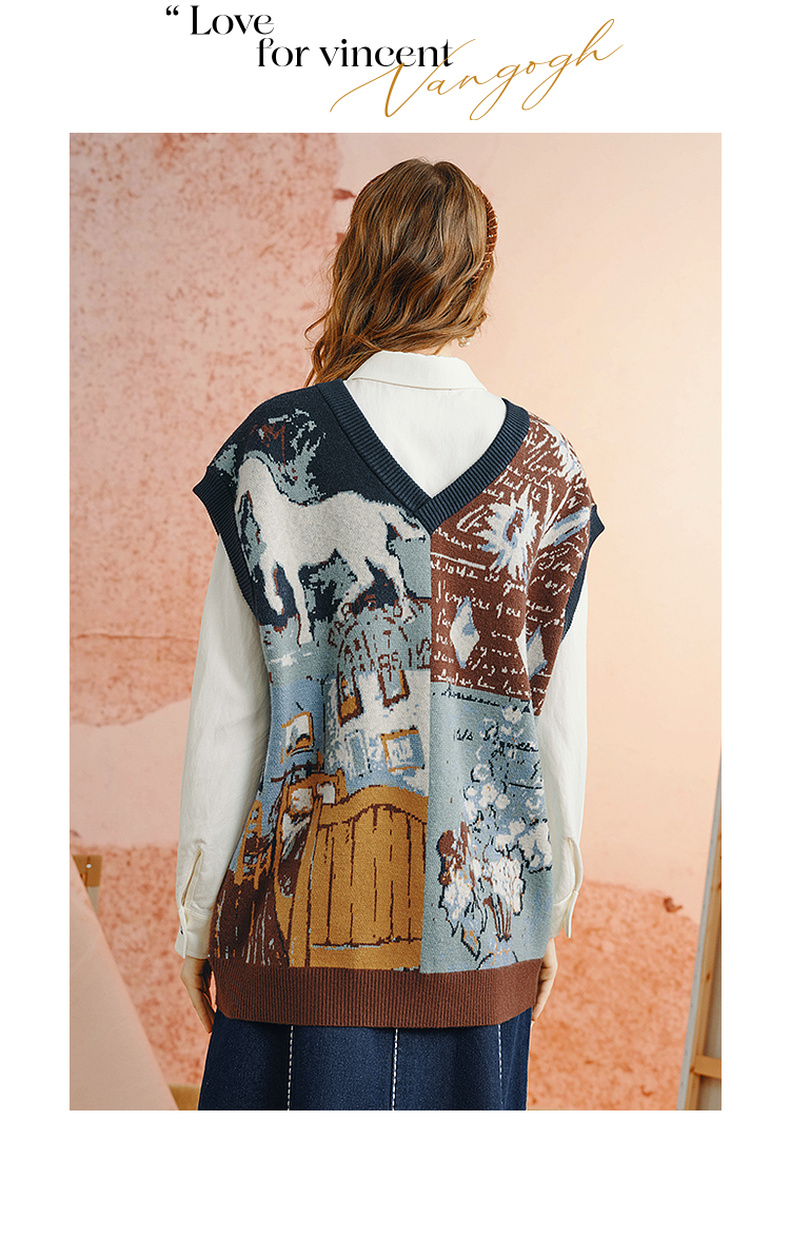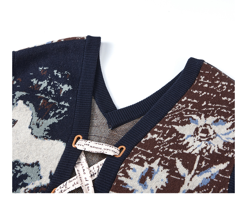 两三事梵高文艺 未驯之灵 2025秋季新款花色两面穿绑带套头毛衣女