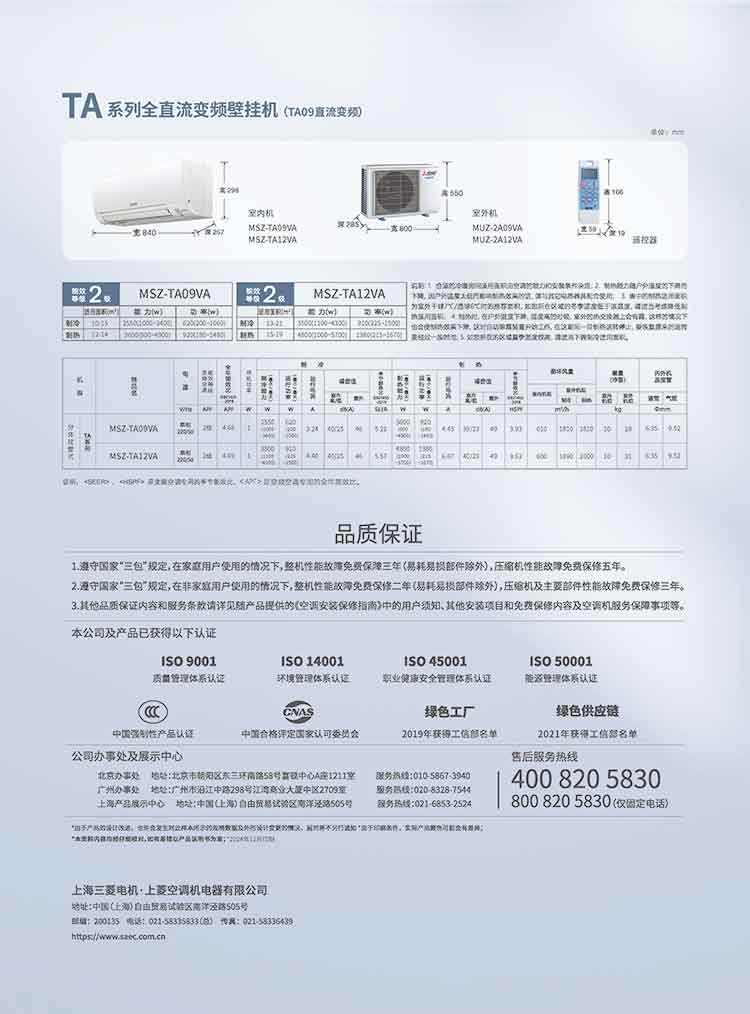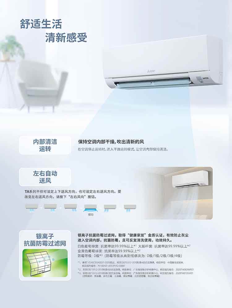 三菱电机 TA系列新2级能效 低噪轻音 变频冷暖 空调挂机 1匹 MSZ-TA09VA/1.5匹MSZ-TA12VA