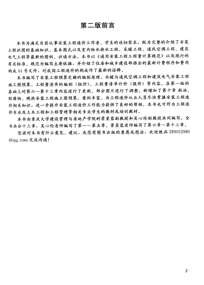 本书主要依据《通用安装工程工程量计算规范》GB50856—2013《建设工程计价计量规范辅导》2013,以及相关专业现行规范、标准编制。其主要内容有:安装工程图;建筑给水排水工程识图;采暖工程识图;通风空调工程识图;建筑电气工程识图;安装工程预算定额;建筑安装工程费用(预算造价);水、暖安装工程施工图预算;通风与空调安装工程施工图预算;刷油、防腐蚀、绝热安装工程施工图预算;建筑电气安装工程施工图预算;工程量清单的编制;工程量清单计价等内容。书中各专业介绍的内容均配有相应插图和安装工程施工图预算编制案例,以供读者理解。