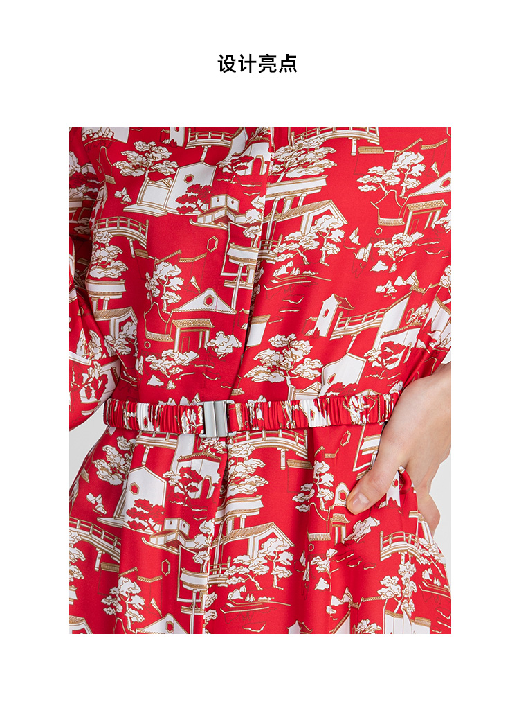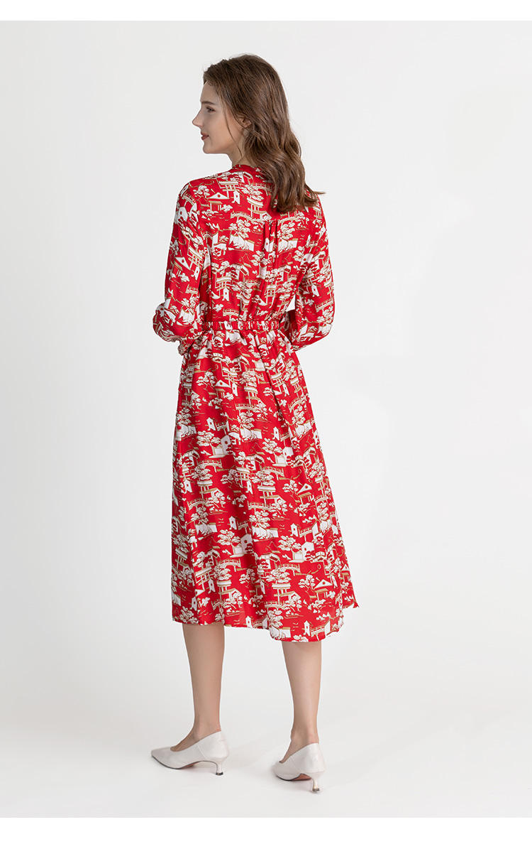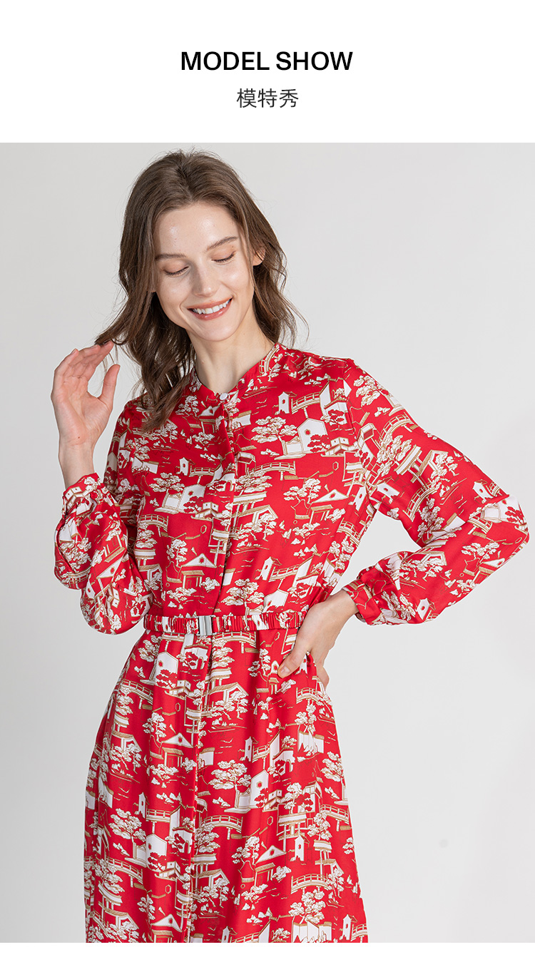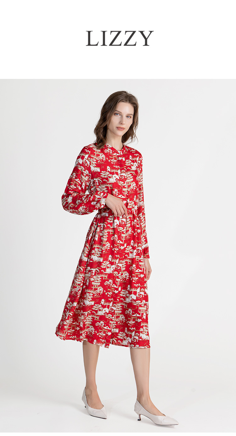 LIZZY夏季通勤休闲舒适桑蚕丝印花长袖连衣裙配腰带8130